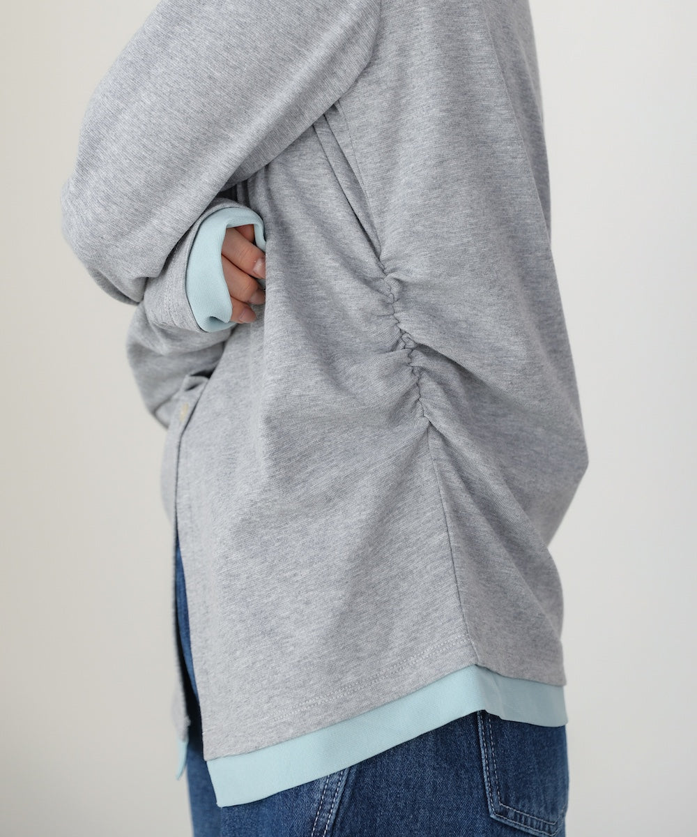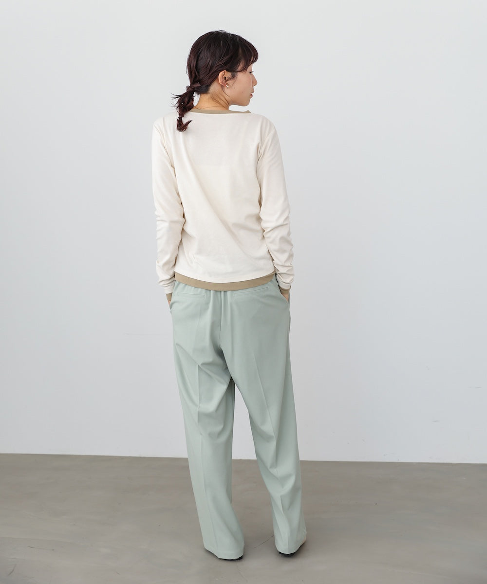 程よい伸縮性とやわらかな着心地。別地部分はナイロン100%で、配色部分に軽やかなアクセントをプラスしています。さらっと羽織りやすく、ロングシーズン活躍する素材感です。