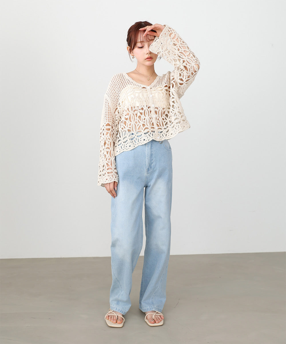 全体のクロシェ編みが目を引くのでボトムはデニムなどカジュアルなスタイリングがおすすめ。中にワンピースをインするだけでもこなれ感のあるスタイリングが完成します。コンパクトな丈感はボトムとのバランスも取りやすくどんなアイテムでもマッチします。いつものジーンズスタイルをアップデートさせたいときにもオススメです。