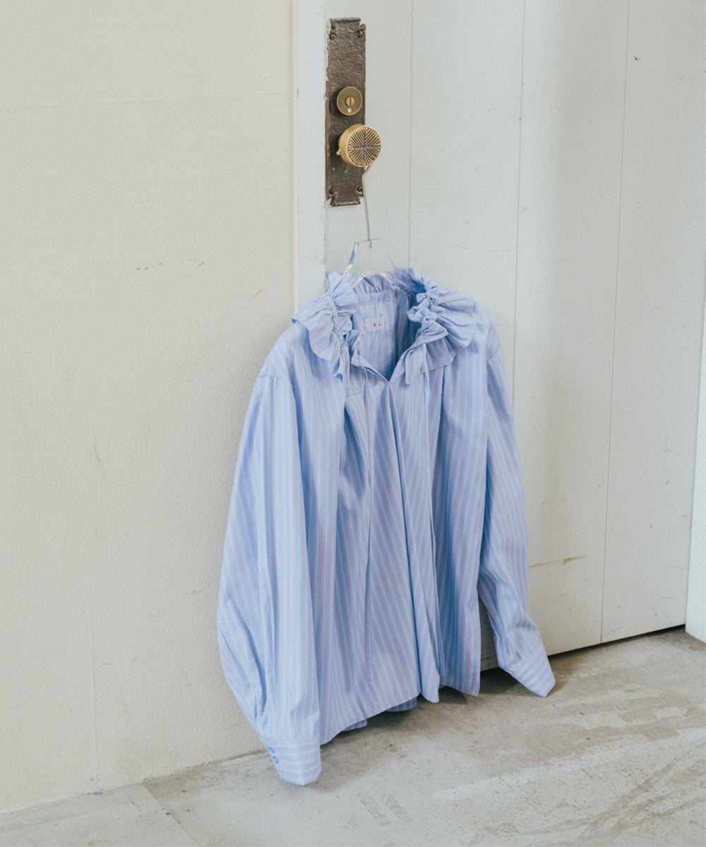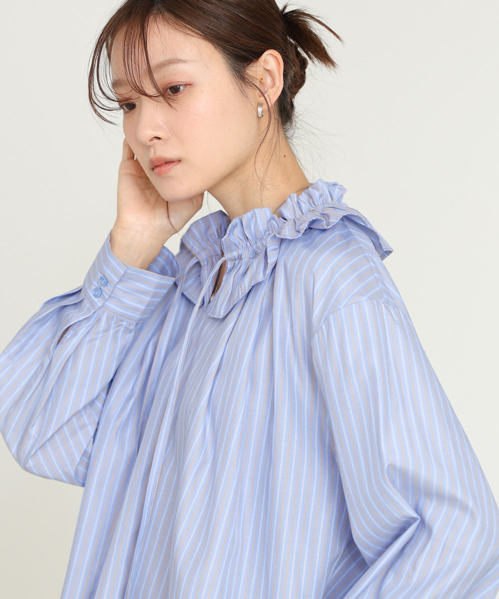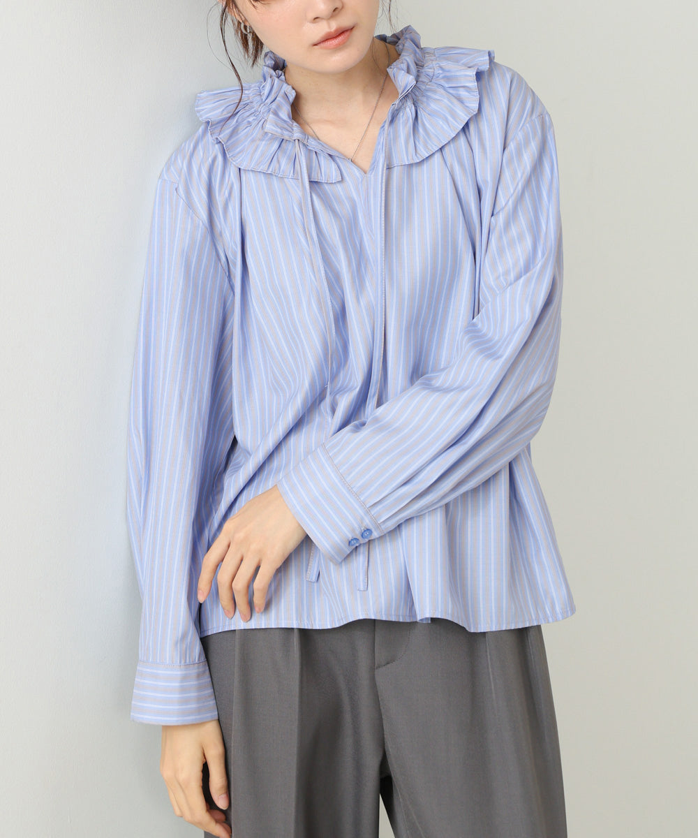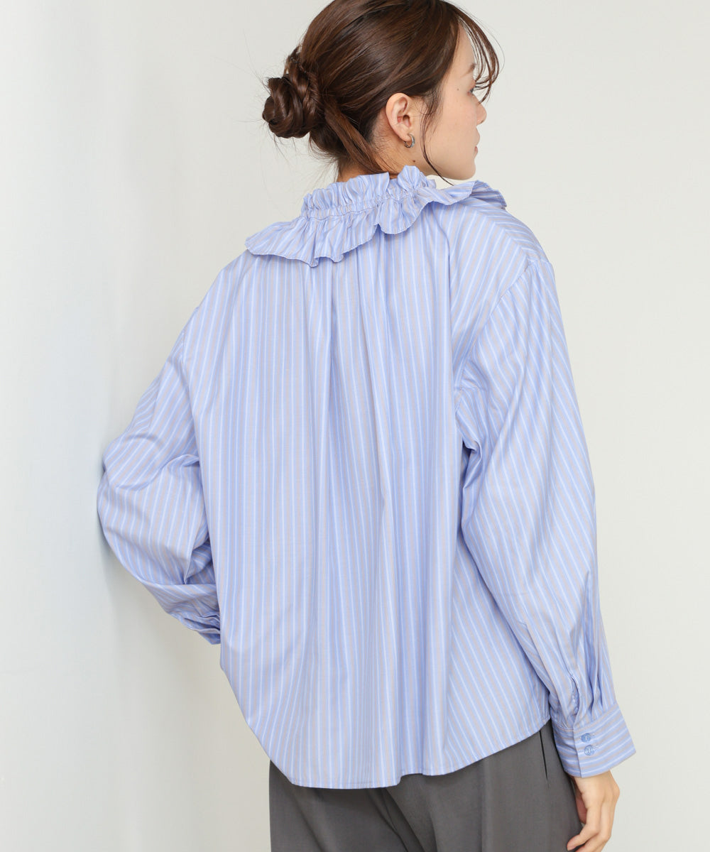 顔まわりを華やかに彩る、ギャザーフリルブラウス。たっぷりと施されたフリルが印象的で、1枚でコーデが完成する主役アイテムです。甘さのあるデザインながらも、程よくゆとりのあるシルエットで大人っぽい抜け感を演出。前を少し開けて着ることで、こなれたニュアンスも楽しめます。オフホワイトは柔らかく上品に、ストライプは爽やかで凛とした印象に。テイストに合わせて選べる2色展開です。