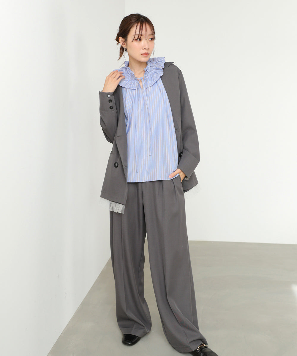 スラックスと合わせてきれいめオフィススタイルに。タイトスカート合わせなら、より女性らしい印象にまとまります。デニムと合わせてカジュアルダウンするのもおすすめ。フリルを主役に、ボトムはシンプルにまとめるのがバランス良く着こなすポイントです。ジャケットやベストのインナーとしても映えるので、着回し力も抜群の一枚です。