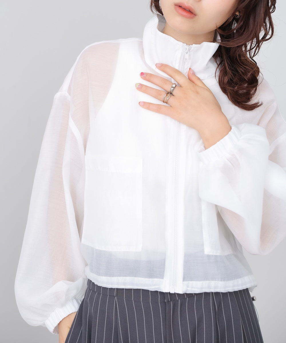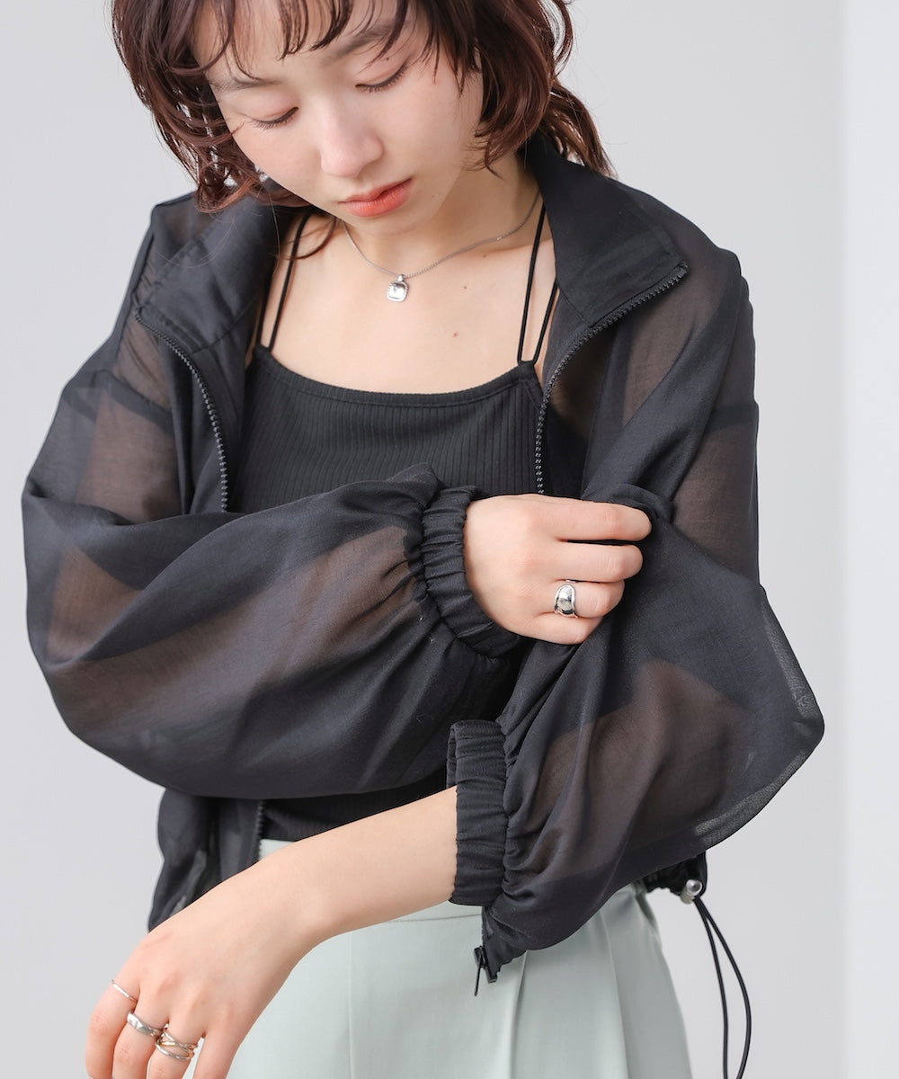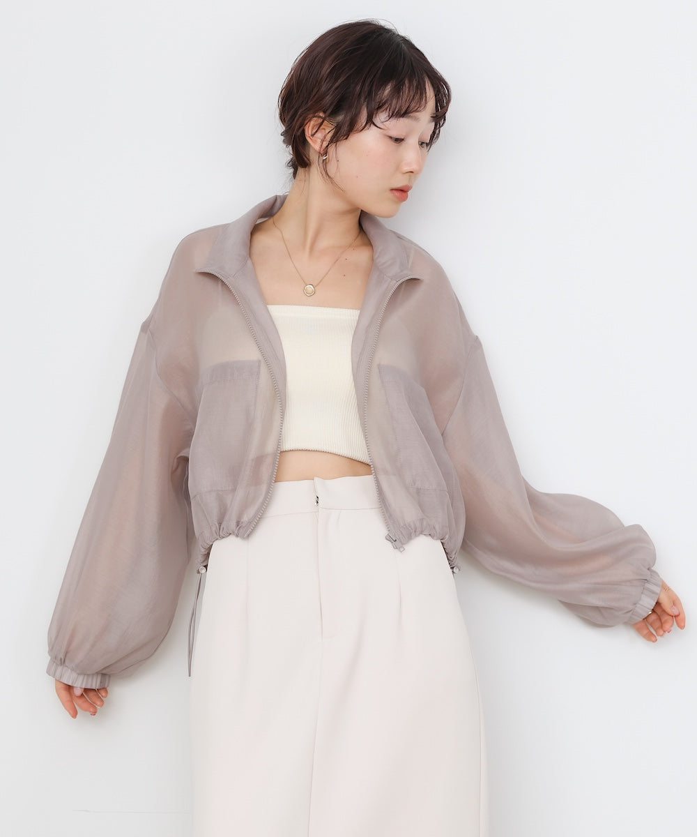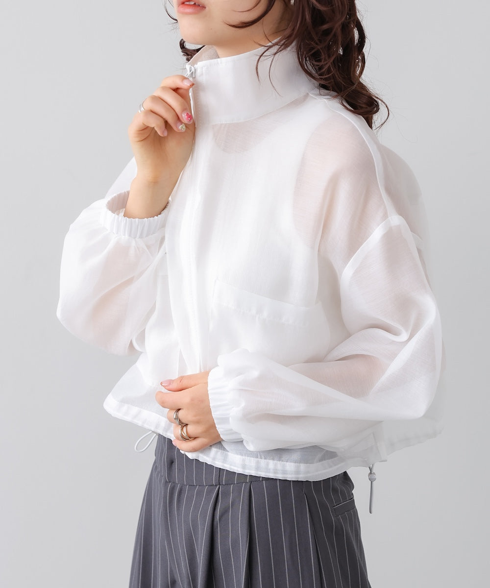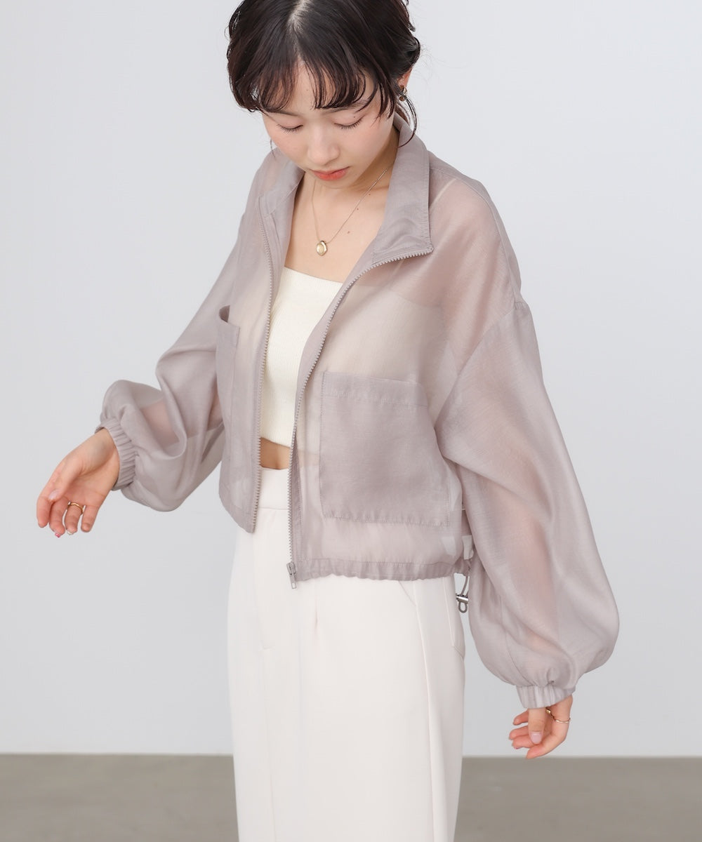 軽やかな透け感が魅力の、スタンド襟シアーブルゾン。ほんのりシアーな素材が抜け感を演出し、羽織るだけで旬なスタイルに仕上がる1枚です。コンパクトな丈感でバランスが取りやすく、ワンピースにもパンツにも好相性。アイボリーは柔らかく女性らしく、グレージュはニュアンス感たっぷりに、ブラックはシックで大人っぽい印象に。