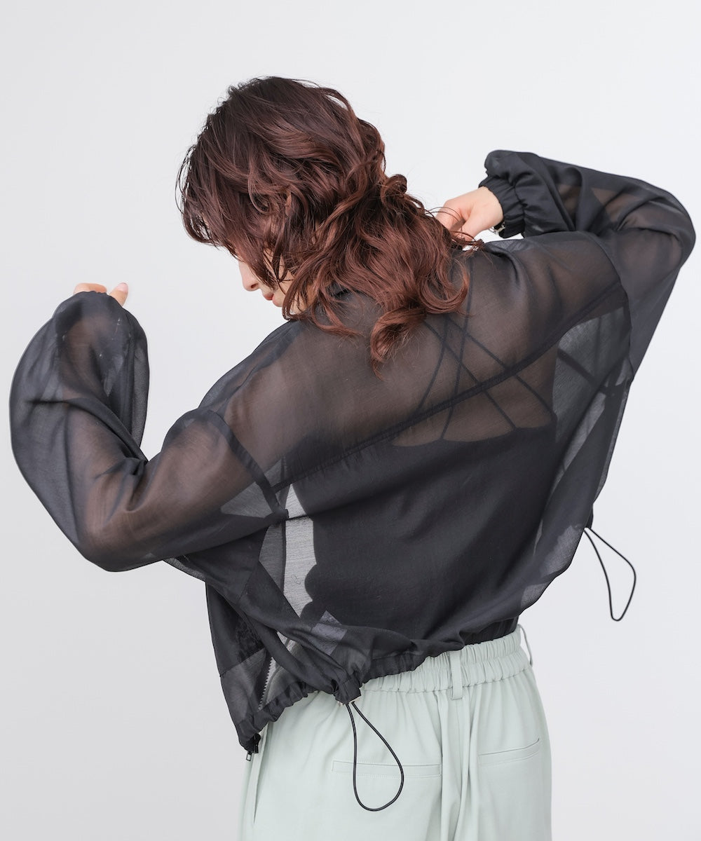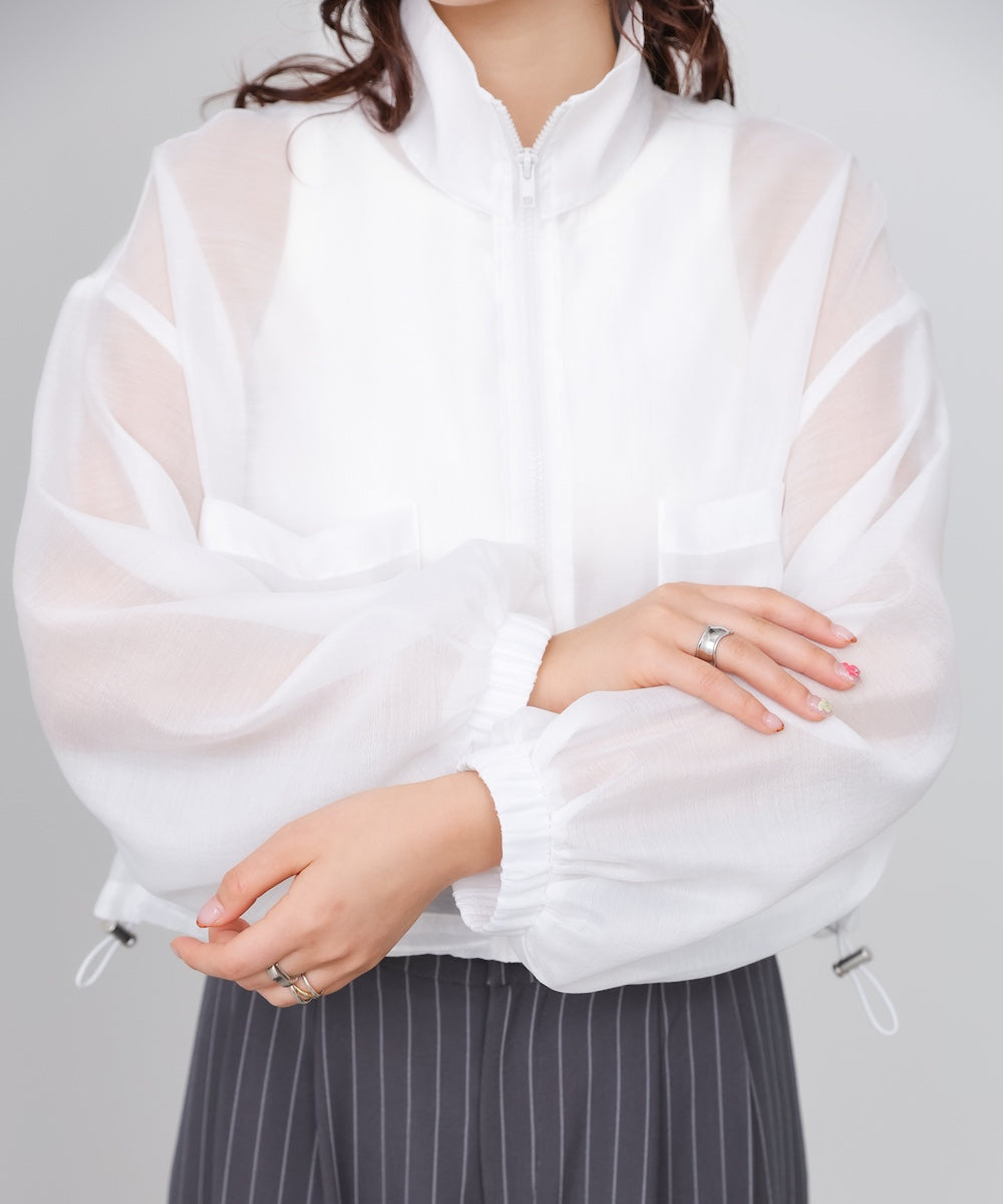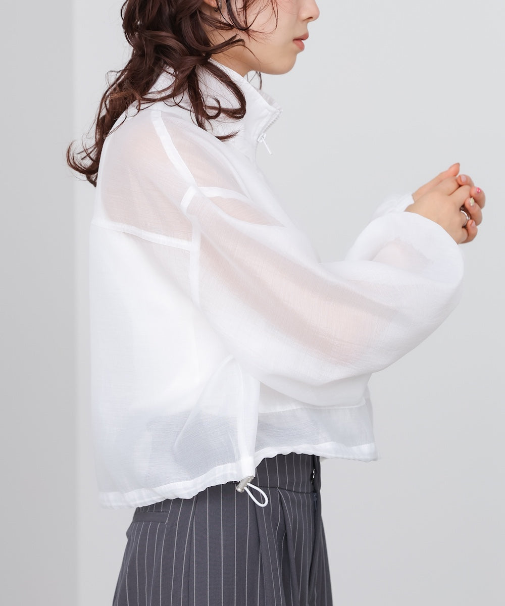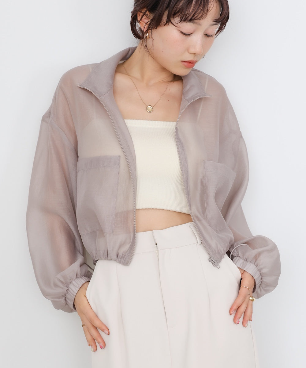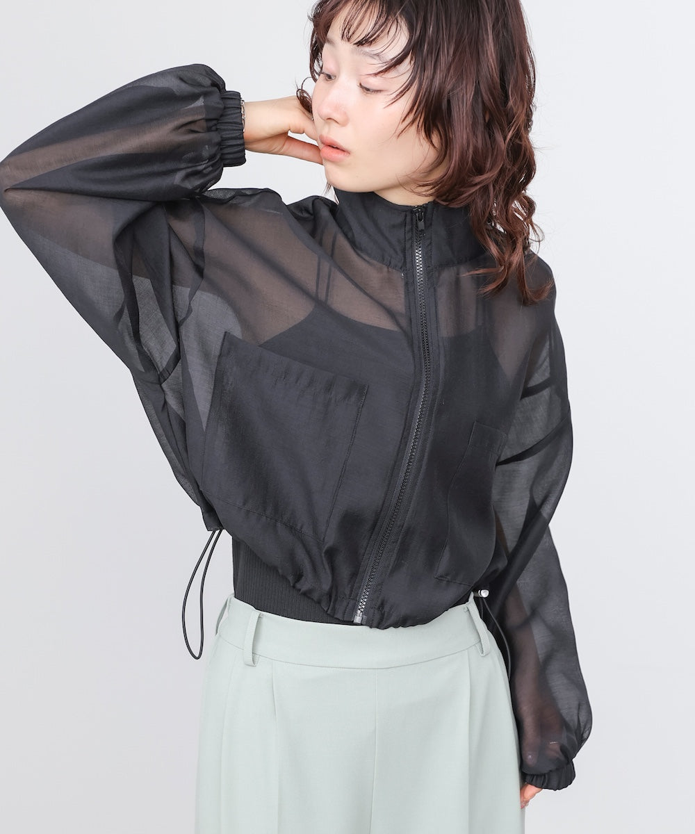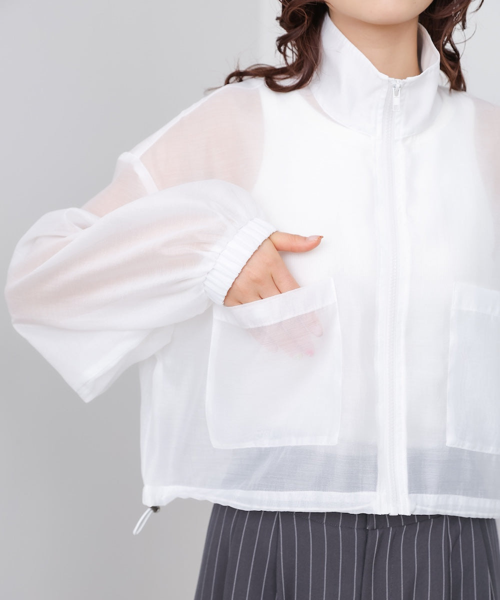 軽やかな透け感が魅力の、スタンド襟シアーブルゾン。ほんのりシアーな素材が抜け感を演出し、羽織るだけで旬なスタイルに仕上がる1枚です。コンパクトな丈感でバランスが取りやすく、ワンピースにもパンツにも好相性。アイボリーは柔らかく女性らしく、グレージュはニュアンス感たっぷりに、ブラックはシックで大人っぽい印象に。