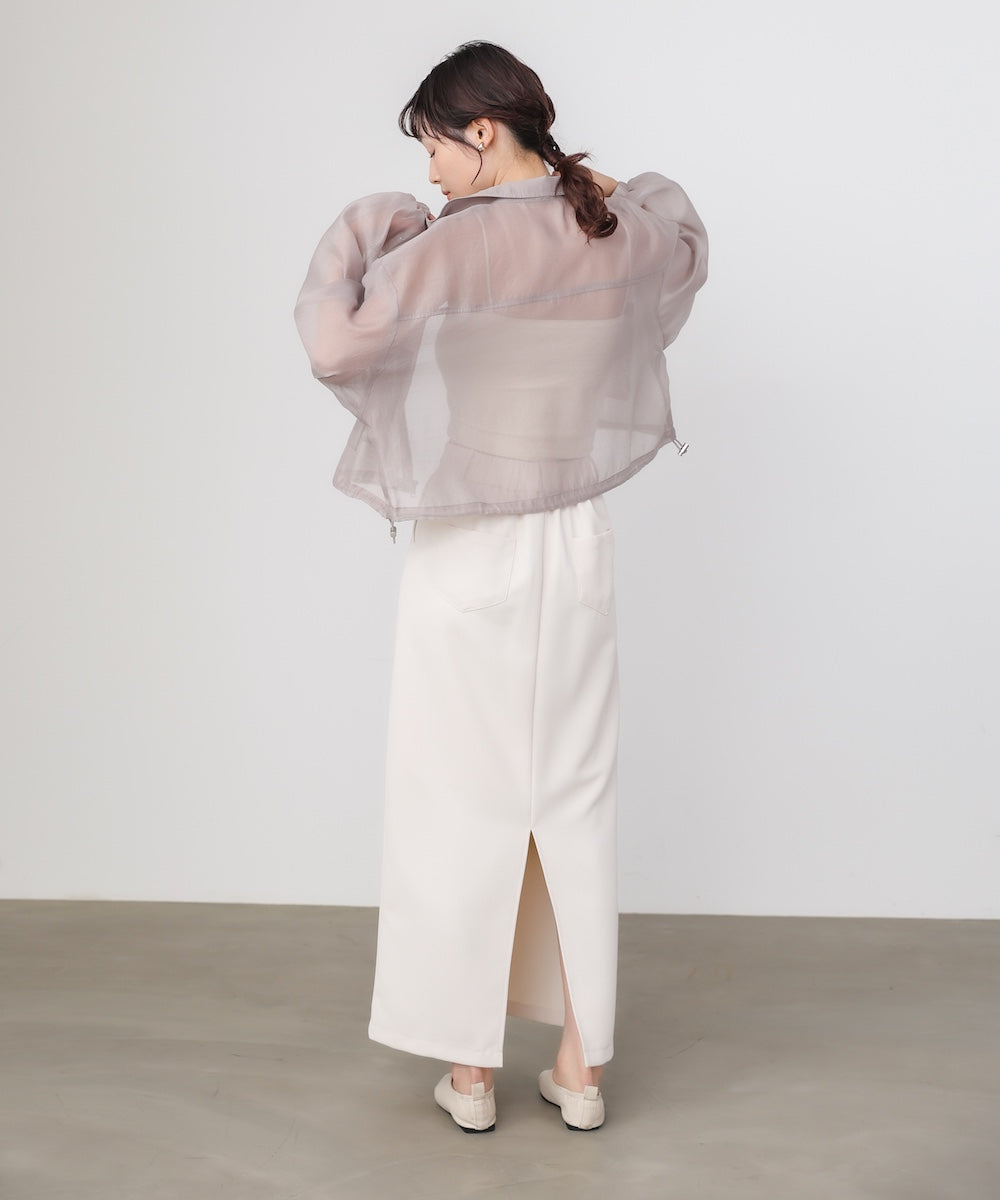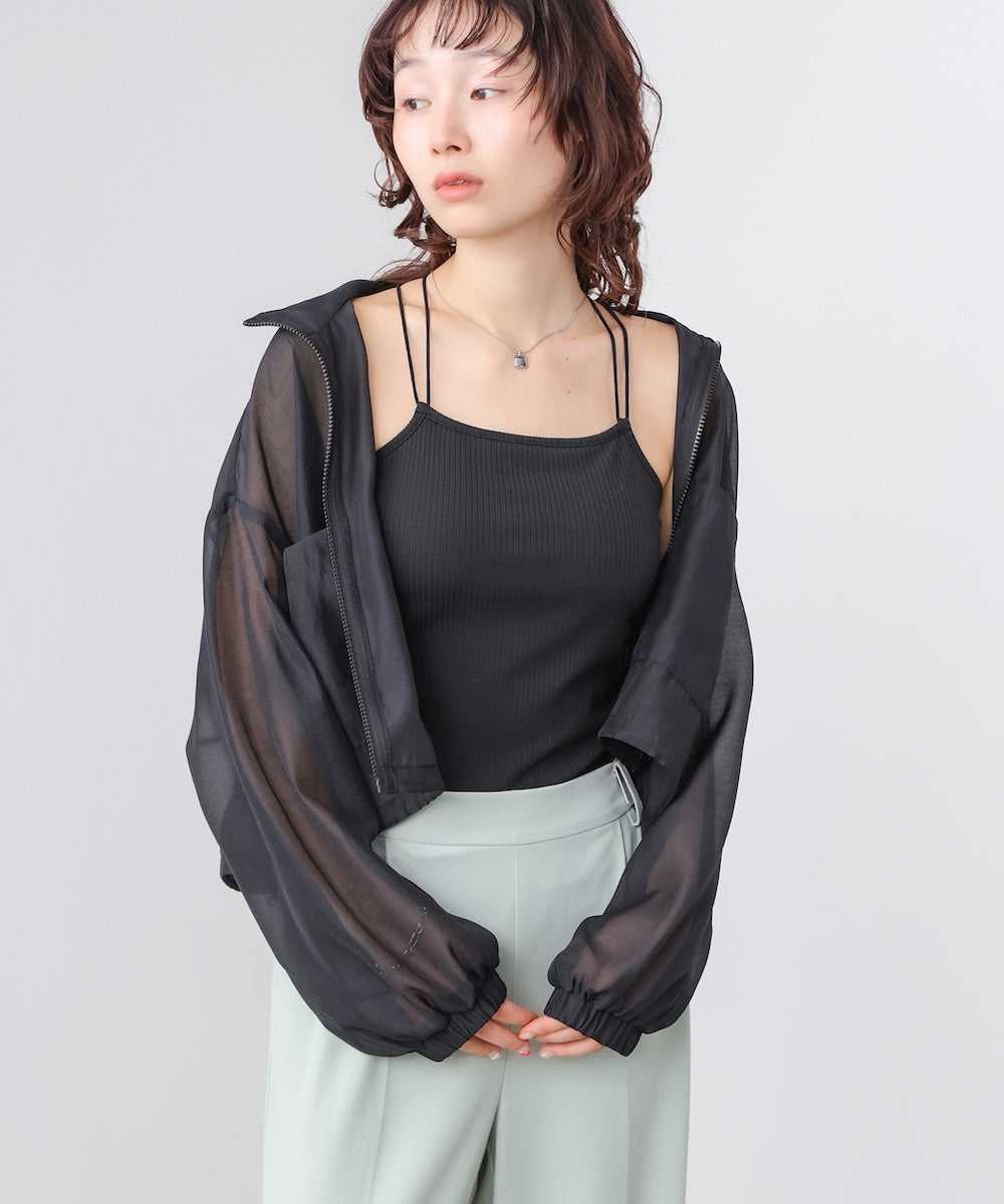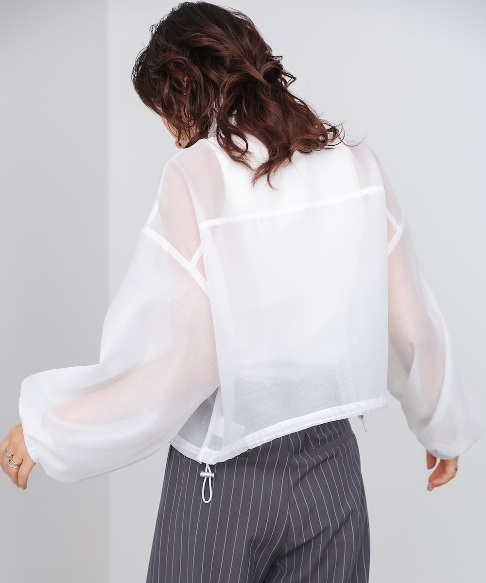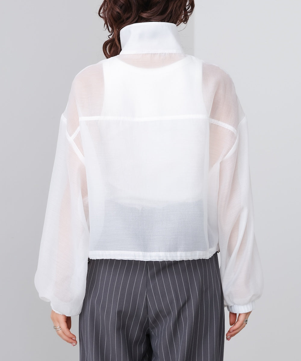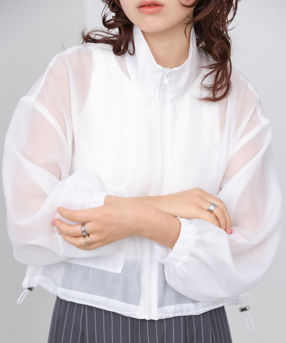 軽やかな透け感が魅力の、スタンド襟シアーブルゾン。ほんのりシアーな素材が抜け感を演出し、羽織るだけで旬なスタイルに仕上がる1枚です。コンパクトな丈感でバランスが取りやすく、ワンピースにもパンツにも好相性。アイボリーは柔らかく女性らしく、グレージュはニュアンス感たっぷりに、ブラックはシックで大人っぽい印象に。