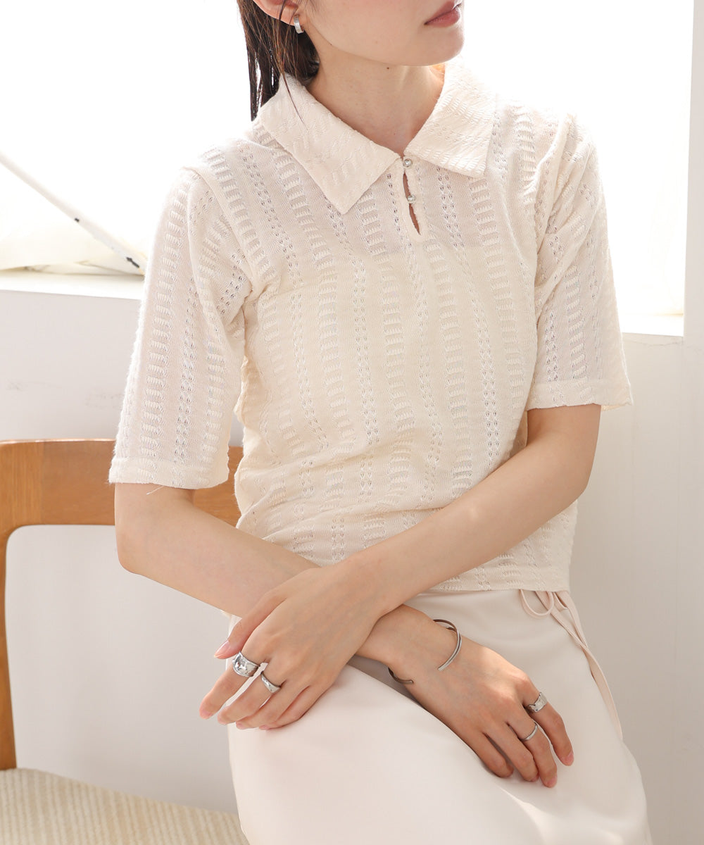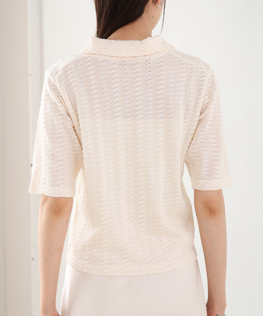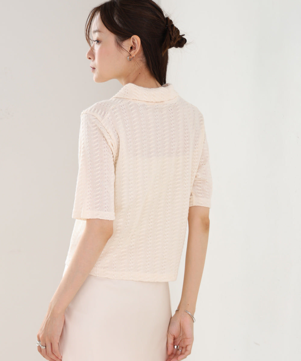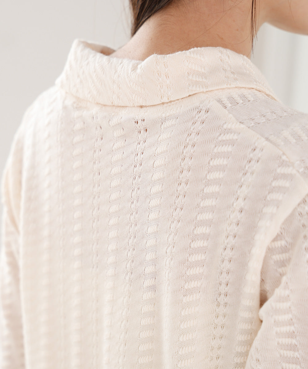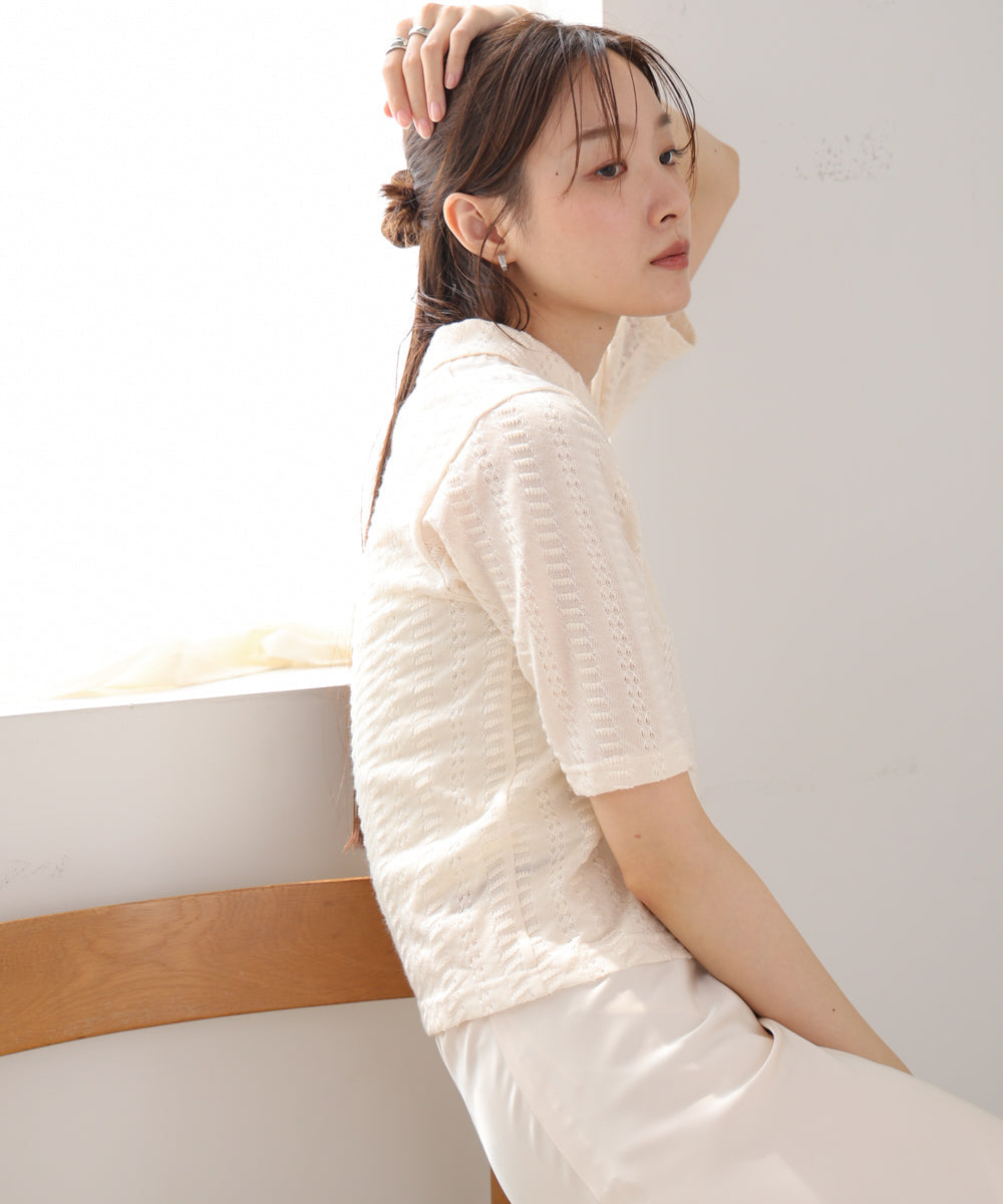 繊細なカットレースが女性らしさを引き立てつつ、襟付きデザインとフロントボタンが上品な印象をプラス。首元のボタンは3つ並びで、開け閉めで雰囲気の変化も楽しめます。また、縦にラインが施されているので自然なスタイルアップがかないます。オフィスカジュアルにもお出かけコーデにもどちらにも取り入れていただけるデザインに仕上がりました。