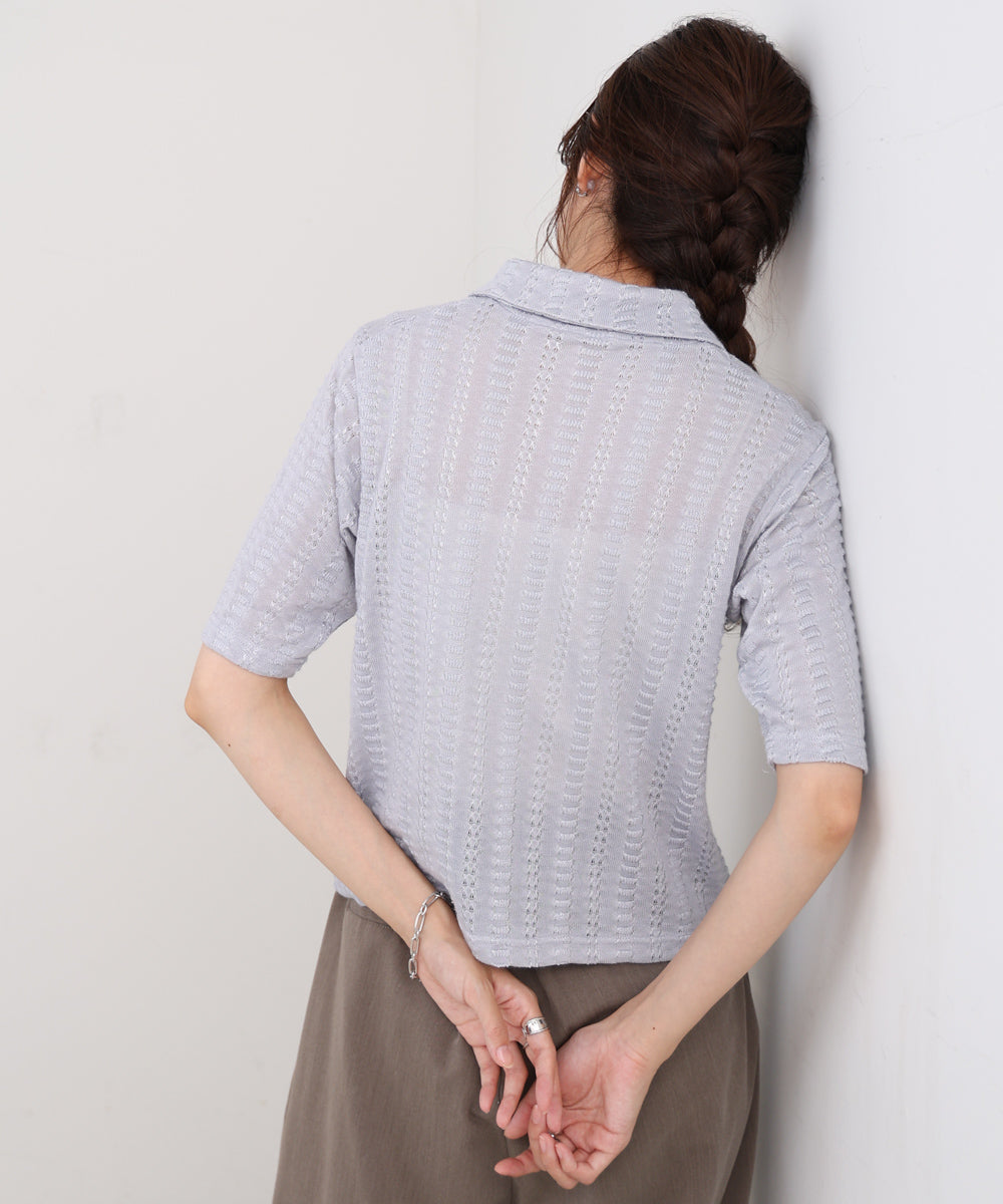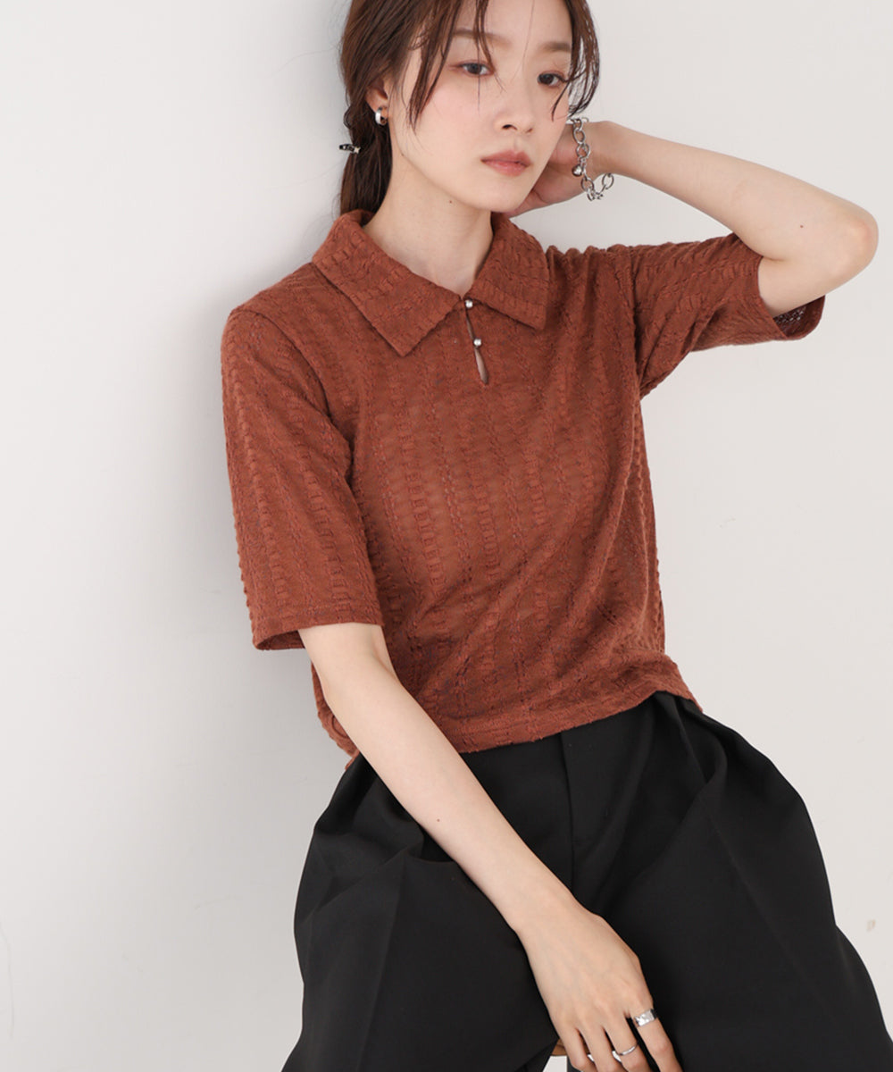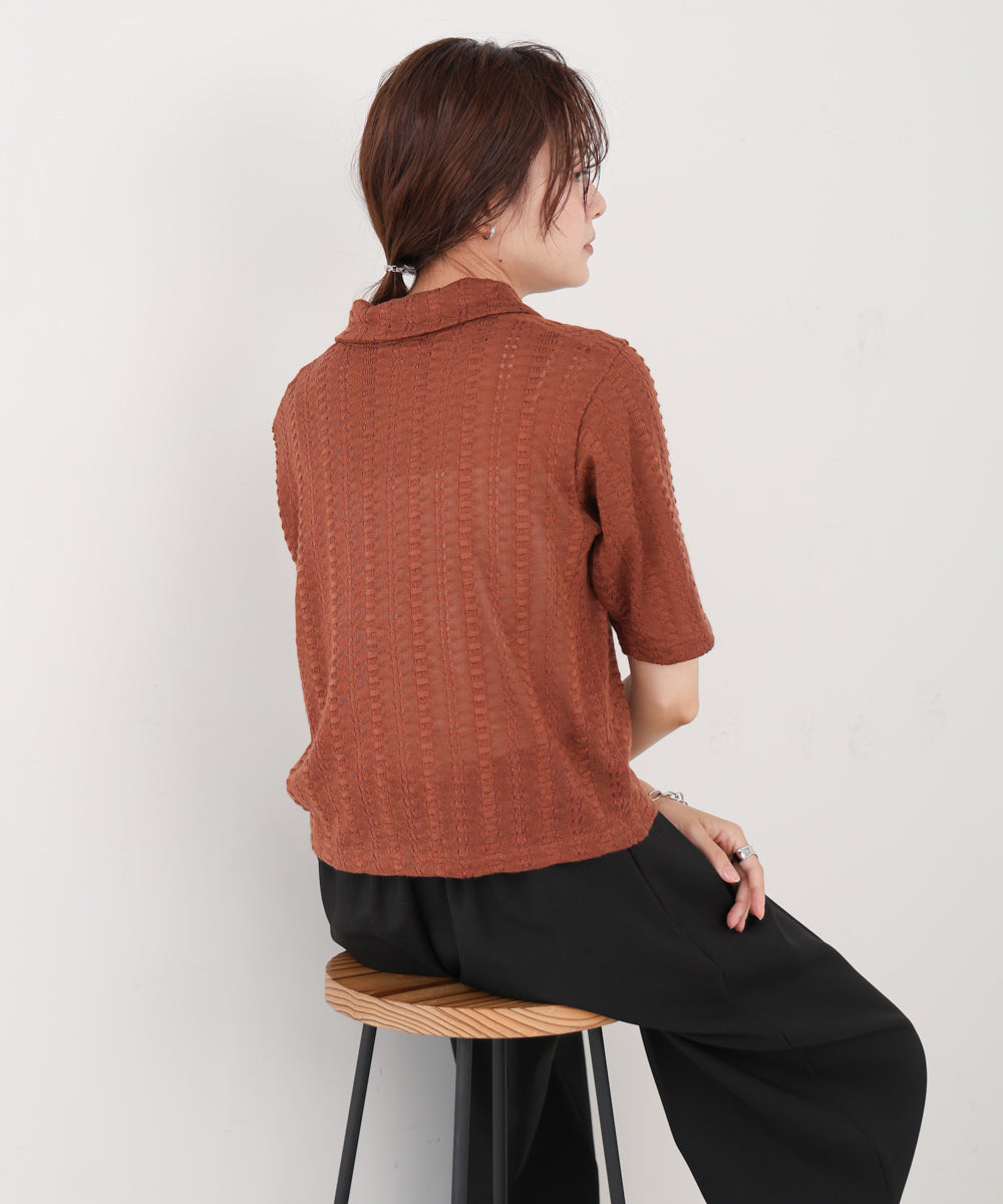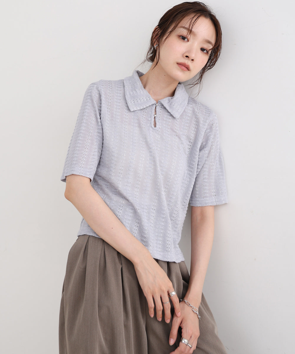 繊細なカットレースが女性らしさを引き立てつつ、襟付きデザインとフロントボタンが上品な印象をプラス。首元のボタンは3つ並びで、開け閉めで雰囲気の変化も楽しめます。また、縦にラインが施されているので自然なスタイルアップがかないます。オフィスカジュアルにもお出かけコーデにもどちらにも取り入れていただけるデザインに仕上がりました。