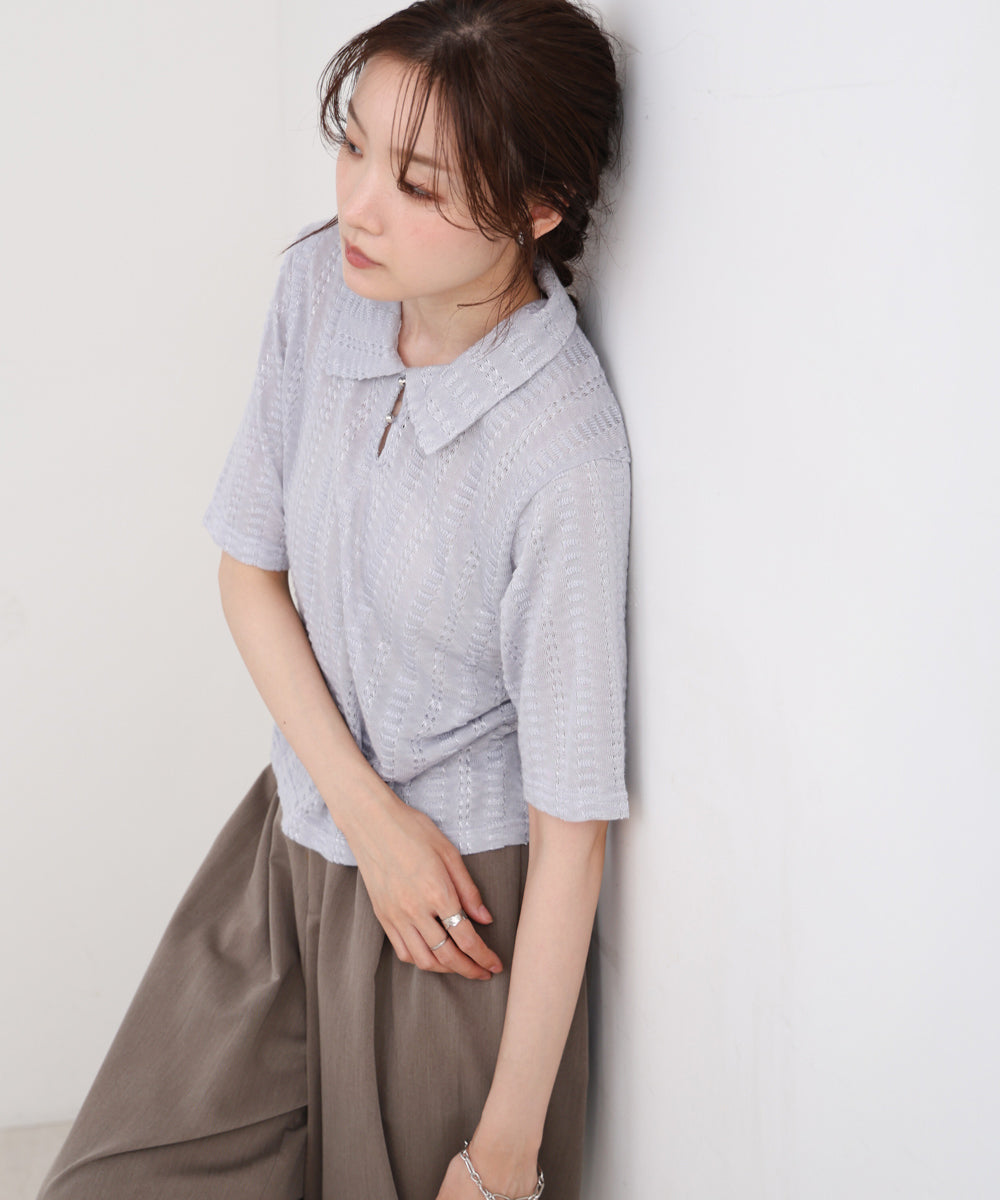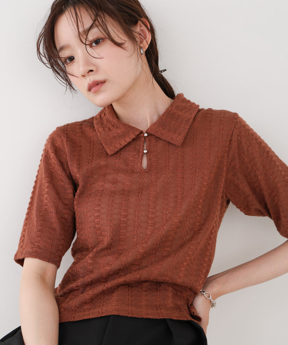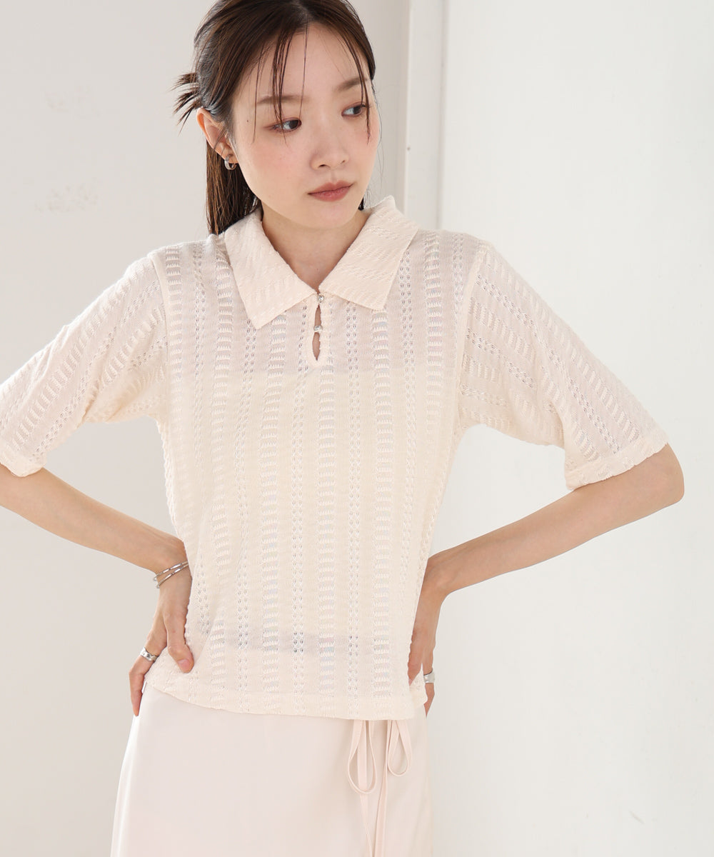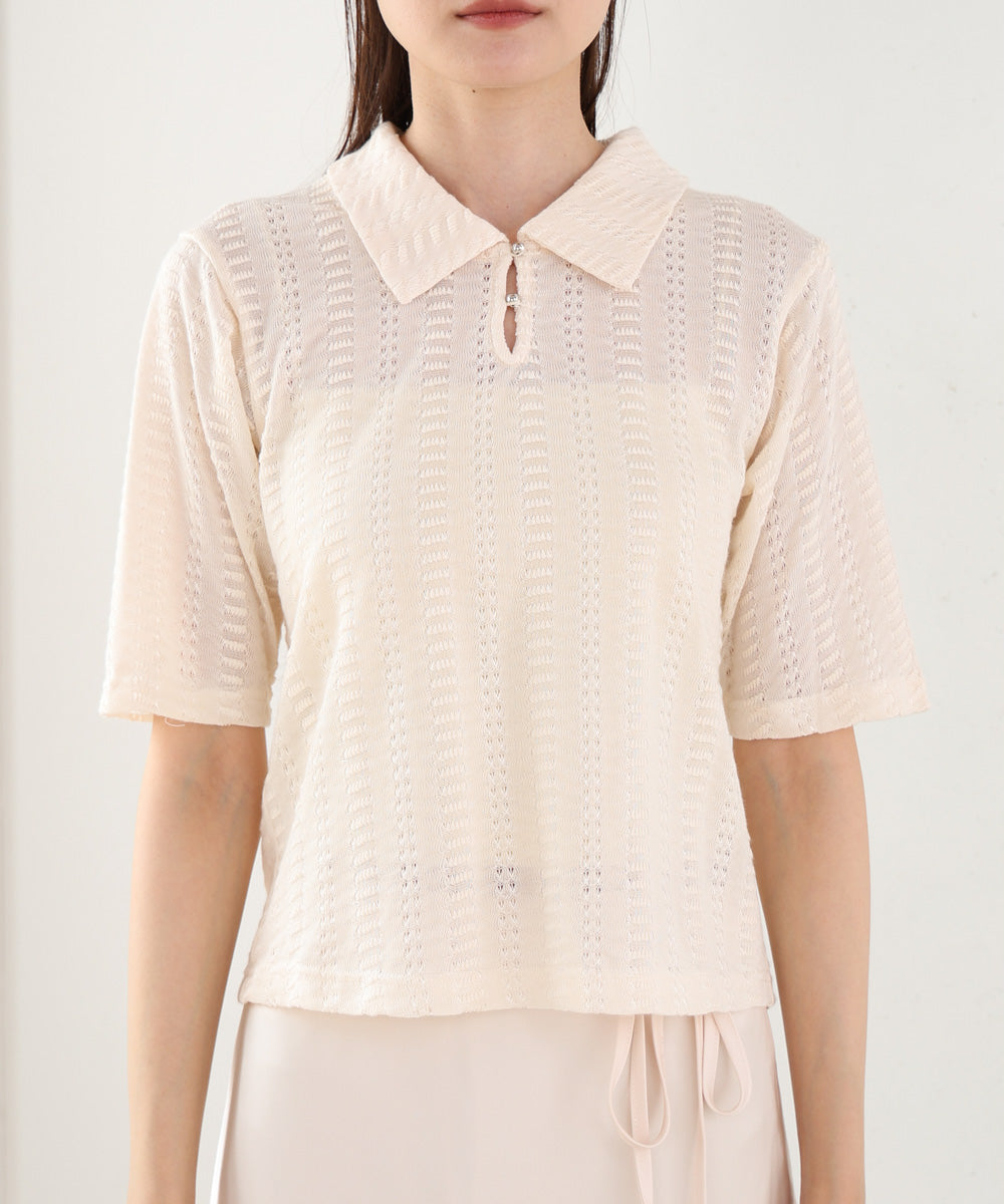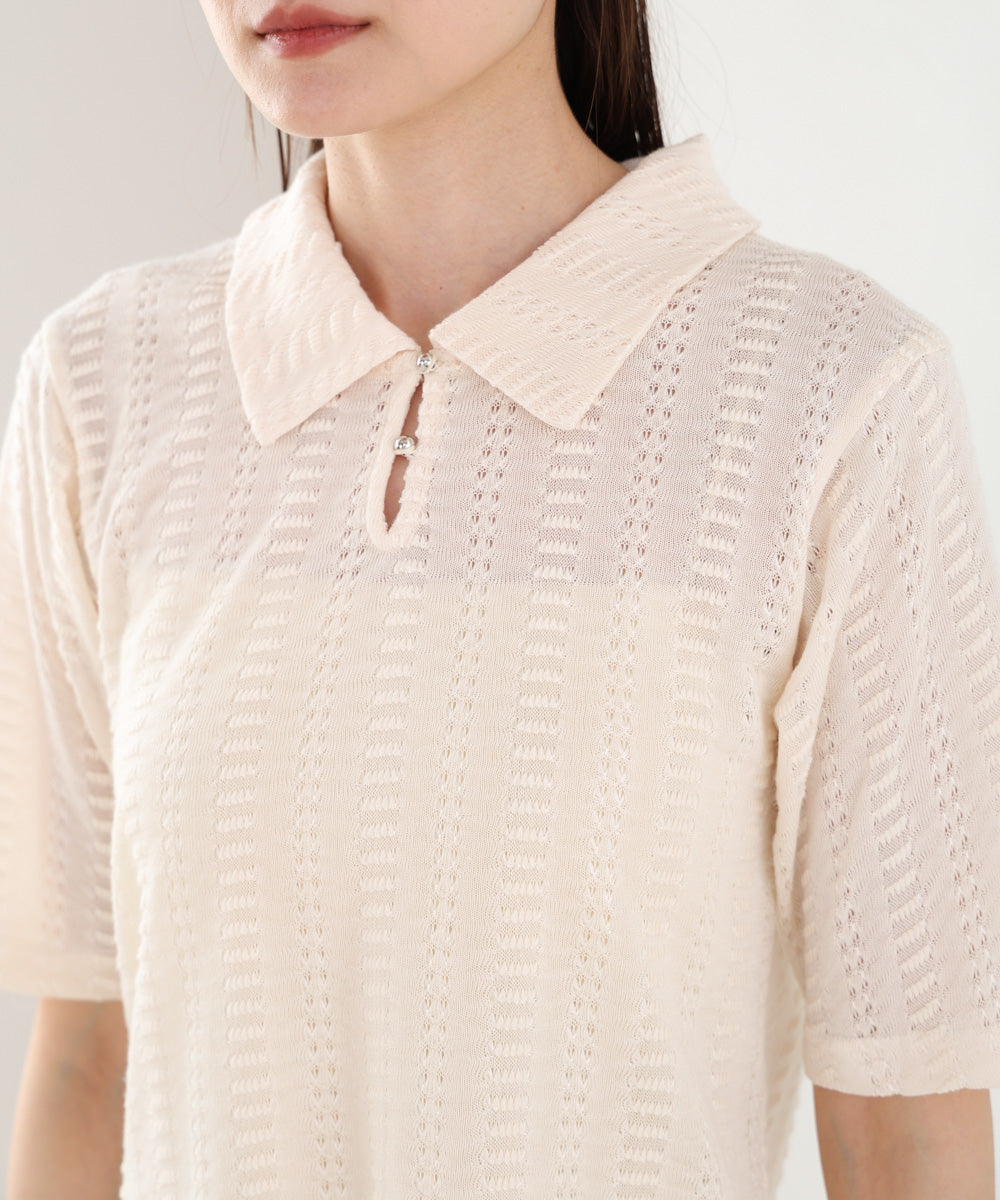繊細なカットレースが女性らしさを引き立てつつ、襟付きデザインとフロントボタンが上品な印象をプラス。首元のボタンは3つ並びで、開け閉めで雰囲気の変化も楽しめます。また、縦にラインが施されているので自然なスタイルアップがかないます。オフィスカジュアルにもお出かけコーデにもどちらにも取り入れていただけるデザインに仕上がりました。
