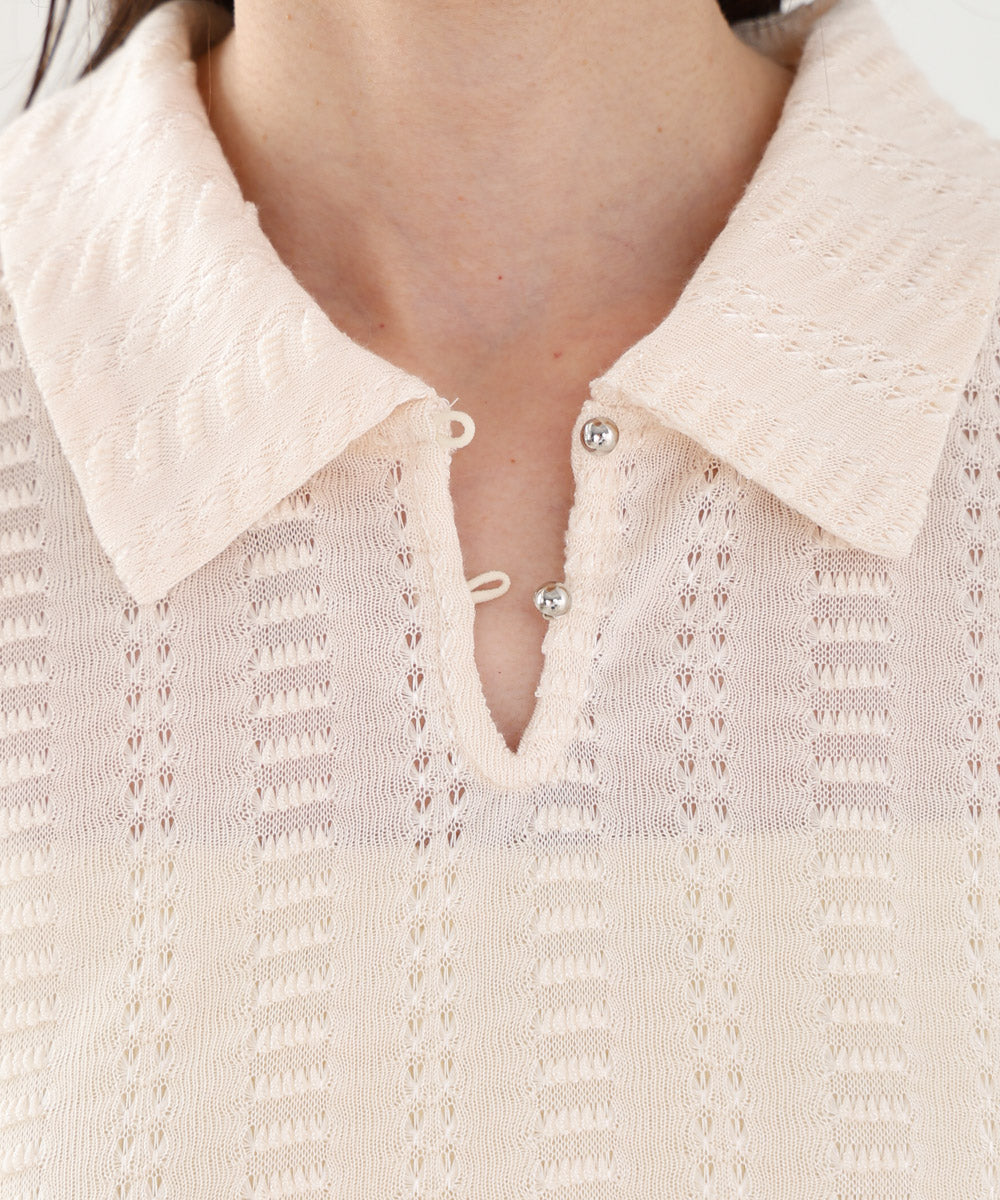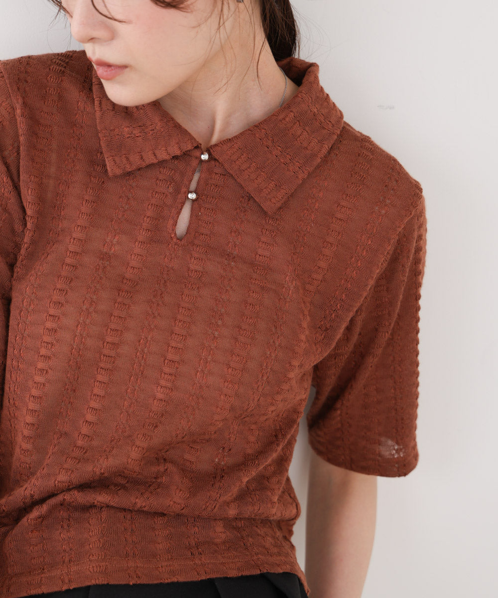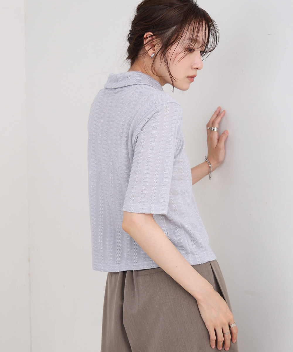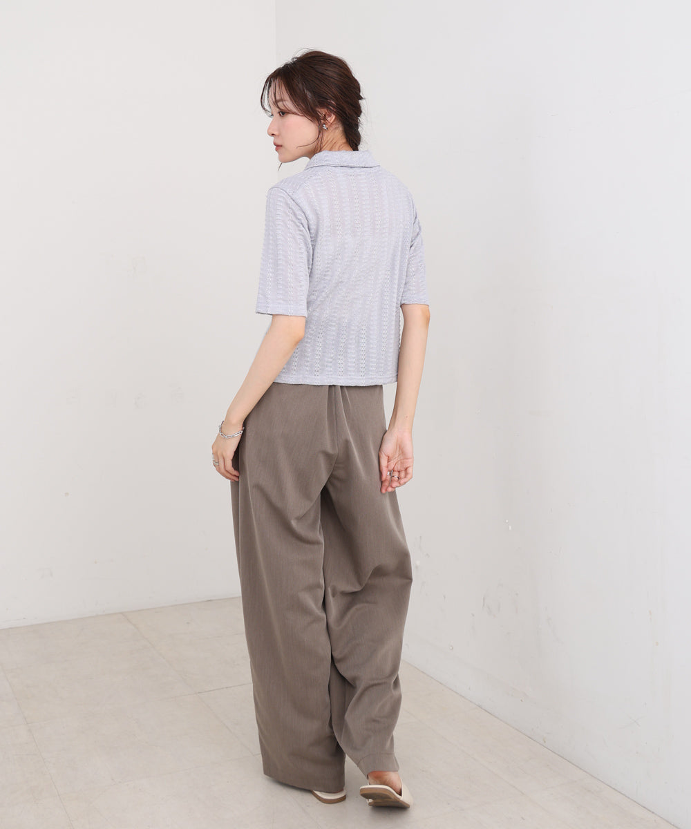繊細なカットレースが女性らしさを引き立てつつ、襟付きデザインとフロントボタンが上品な印象をプラス。首元のボタンは3つ並びで、開け閉めで雰囲気の変化も楽しめます。また、縦にラインが施されているので自然なスタイルアップがかないます。オフィスカジュアルにもお出かけコーデにもどちらにも取り入れていただけるデザインに仕上がりました。