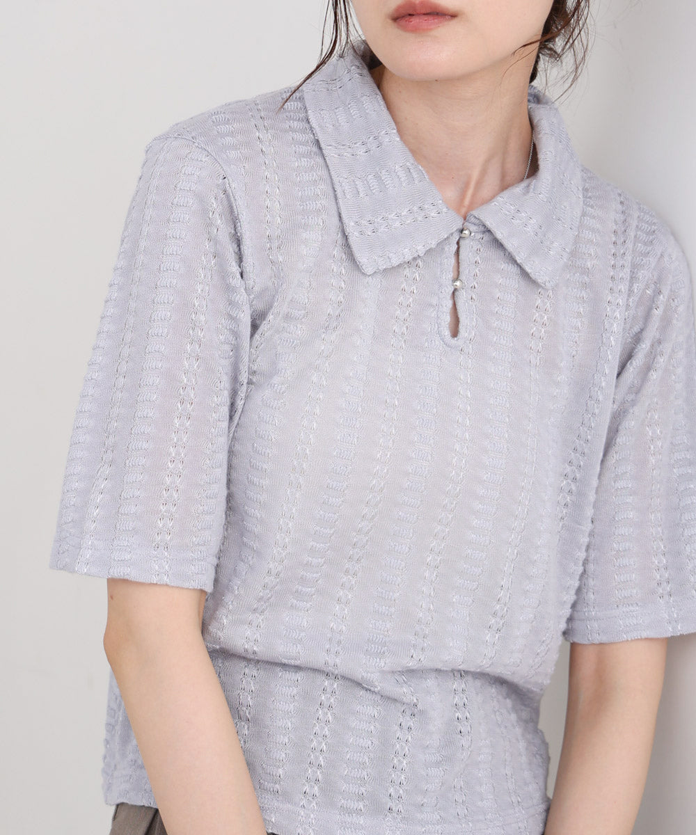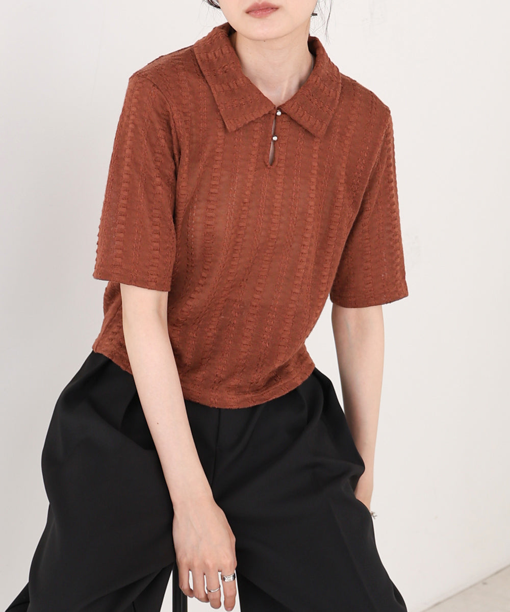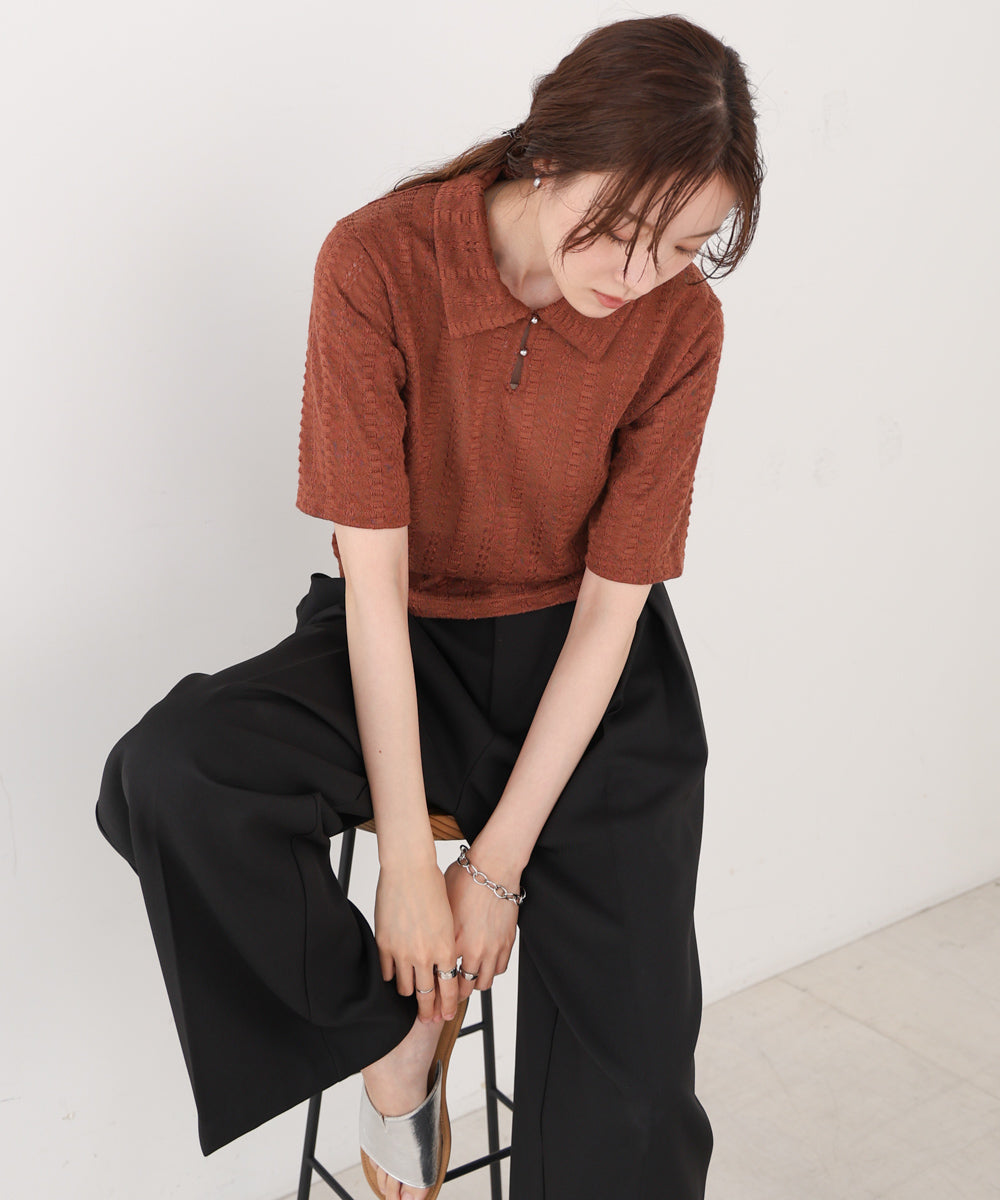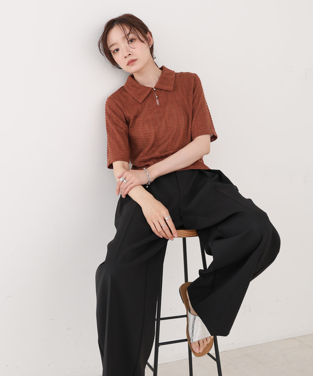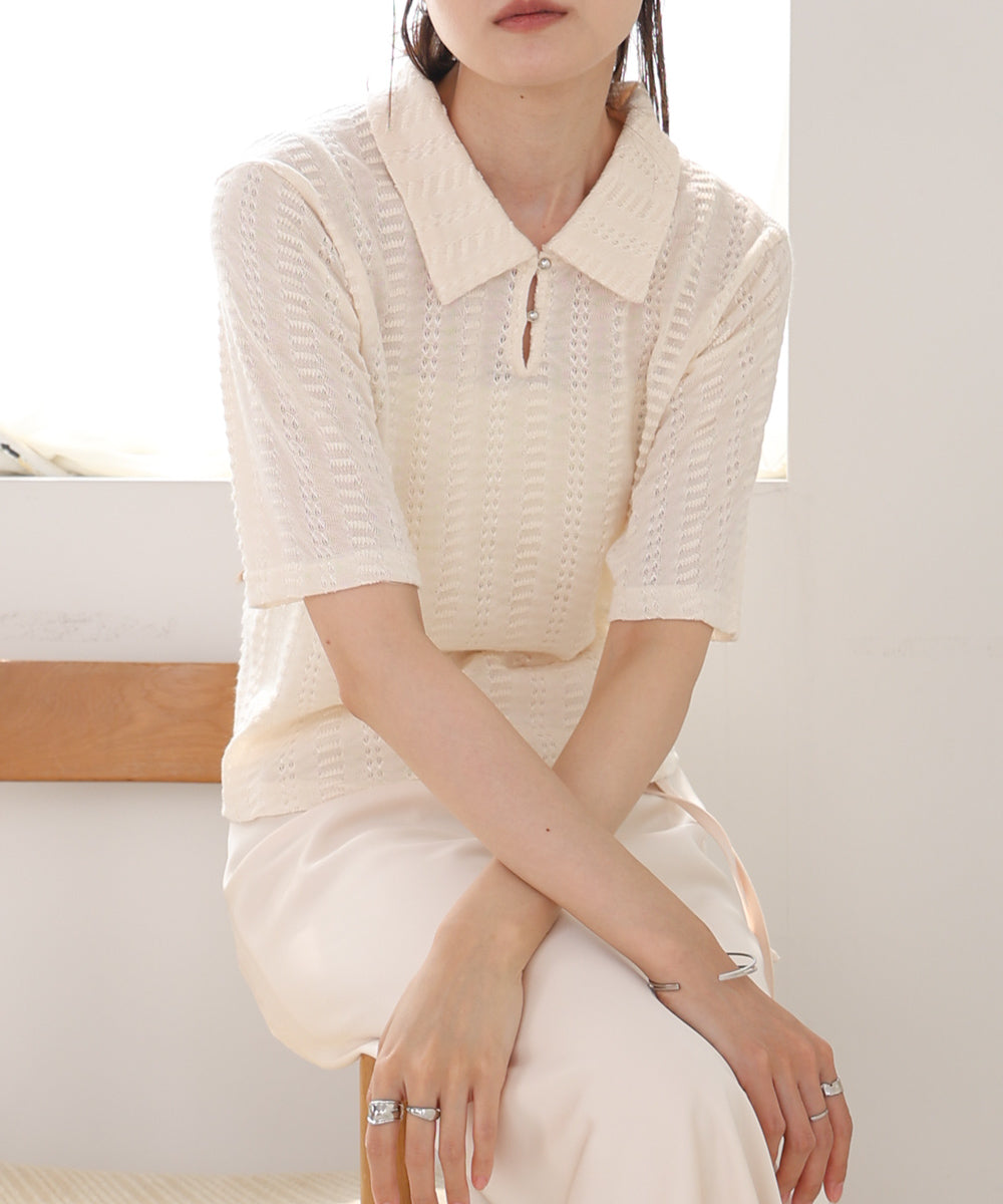 繊細なカットレースが女性らしさを引き立てつつ、襟付きデザインとフロントボタンが上品な印象をプラス。首元のボタンは3つ並びで、開け閉めで雰囲気の変化も楽しめます。また、縦にラインが施されているので自然なスタイルアップがかないます。オフィスカジュアルにもお出かけコーデにもどちらにも取り入れていただけるデザインに仕上がりました。