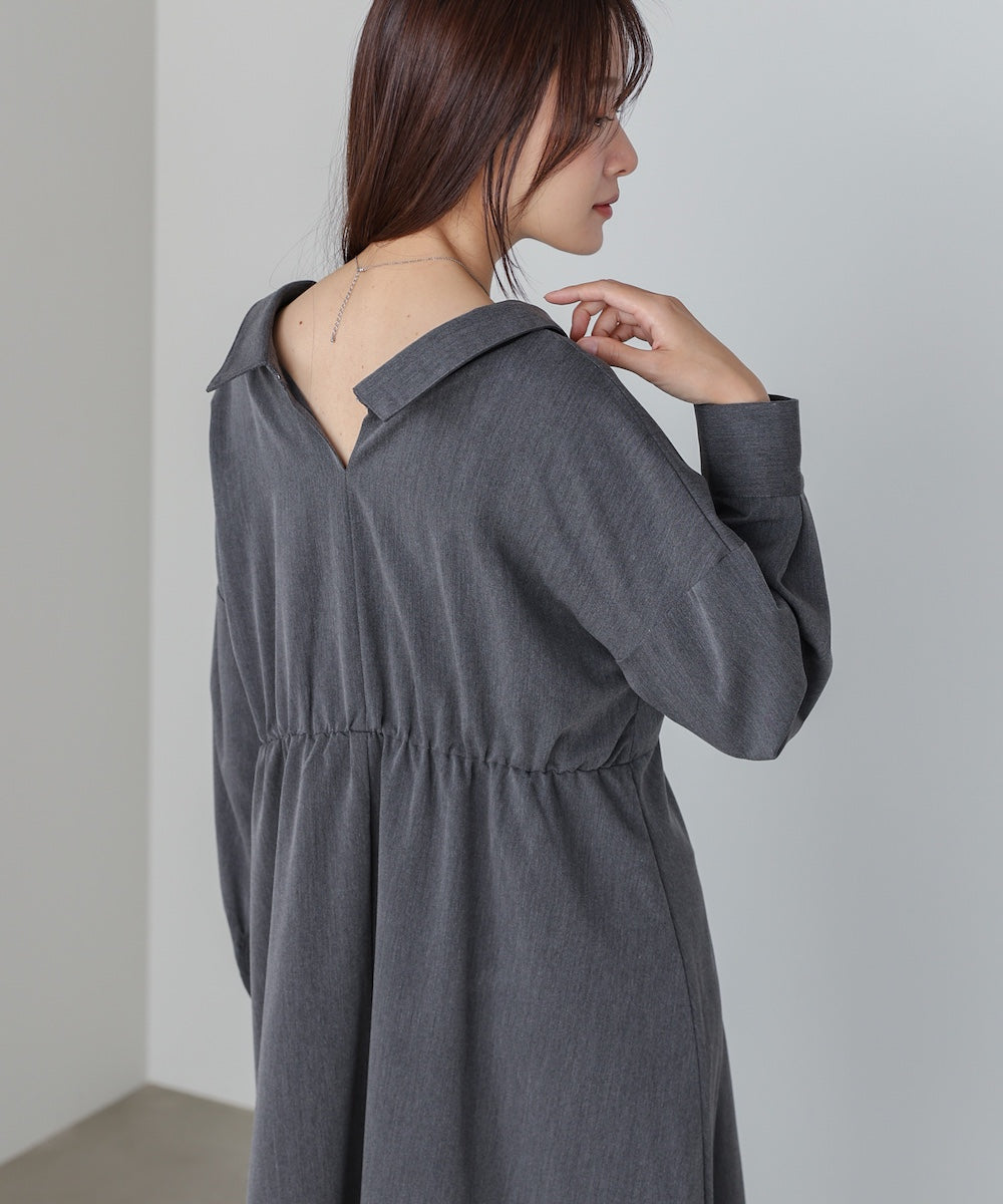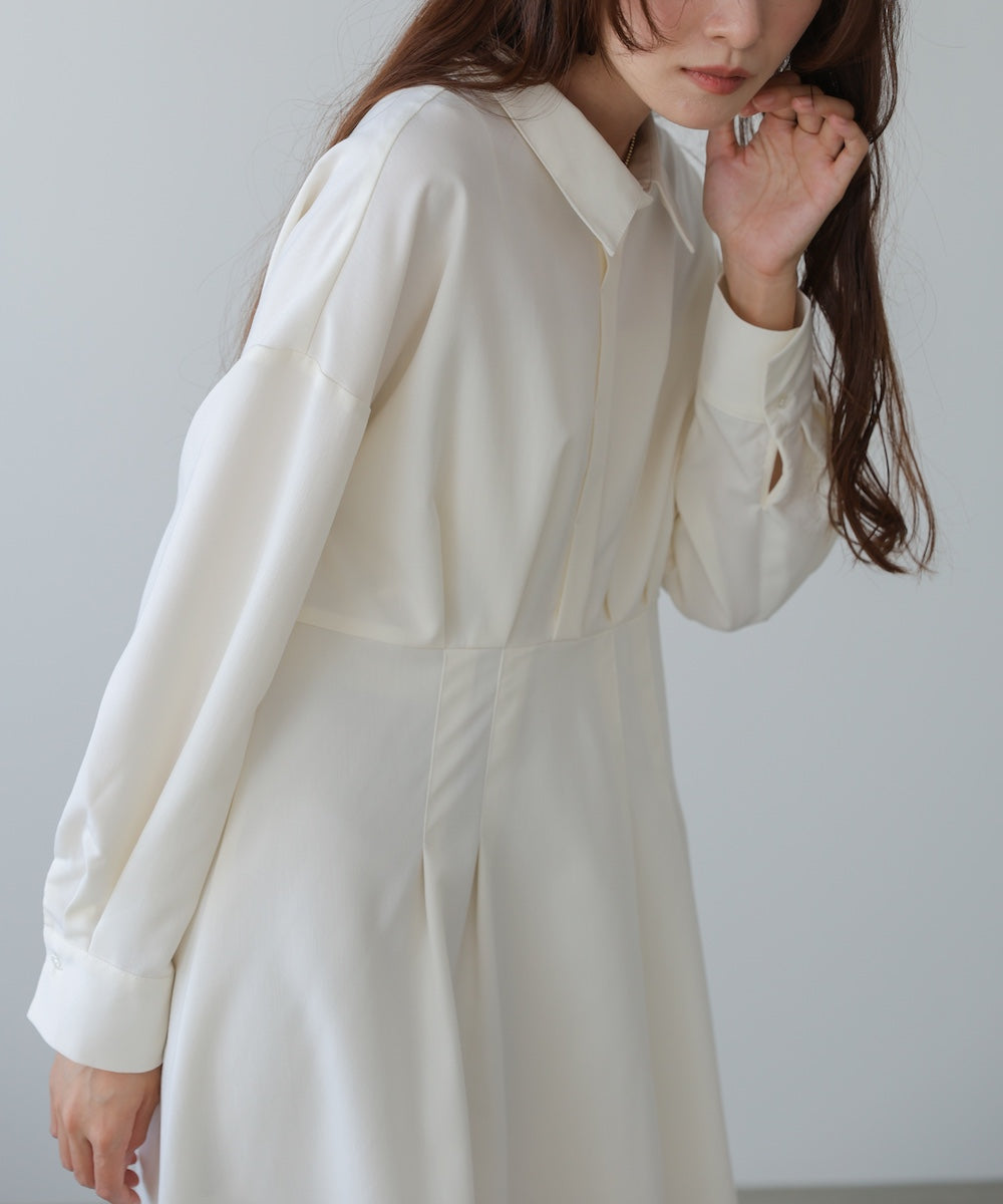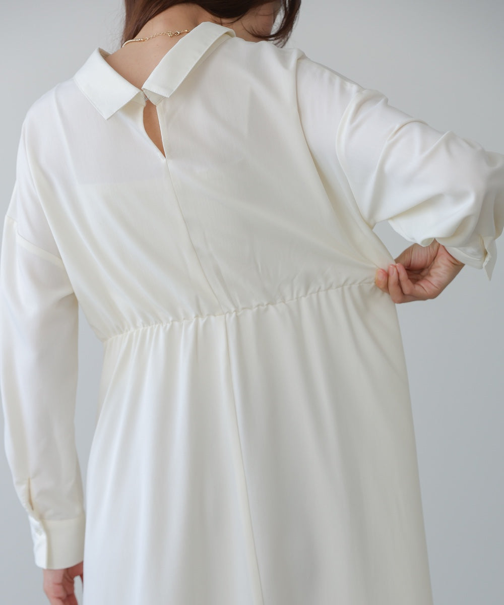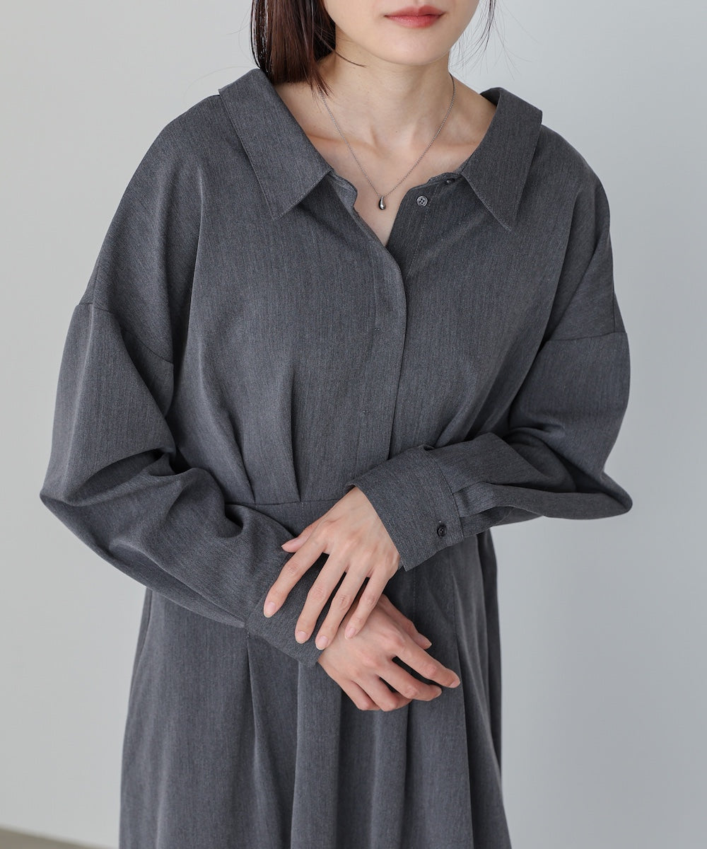 シンプルながらも細部までこだわったデザインが魅力のシャツワンピース。小ぶりな前ボタンやウエストタックが上品な印象を与え、さりげなくウエストマークできる2WAY仕様でシルエットの変化も楽しめます。後ろのホックディテールや控えめな襟元が、洗練された“大人かわいい”雰囲気を演出。お仕事から休日のおでかけまで、シーンを選ばず活躍する万能アイテムです。