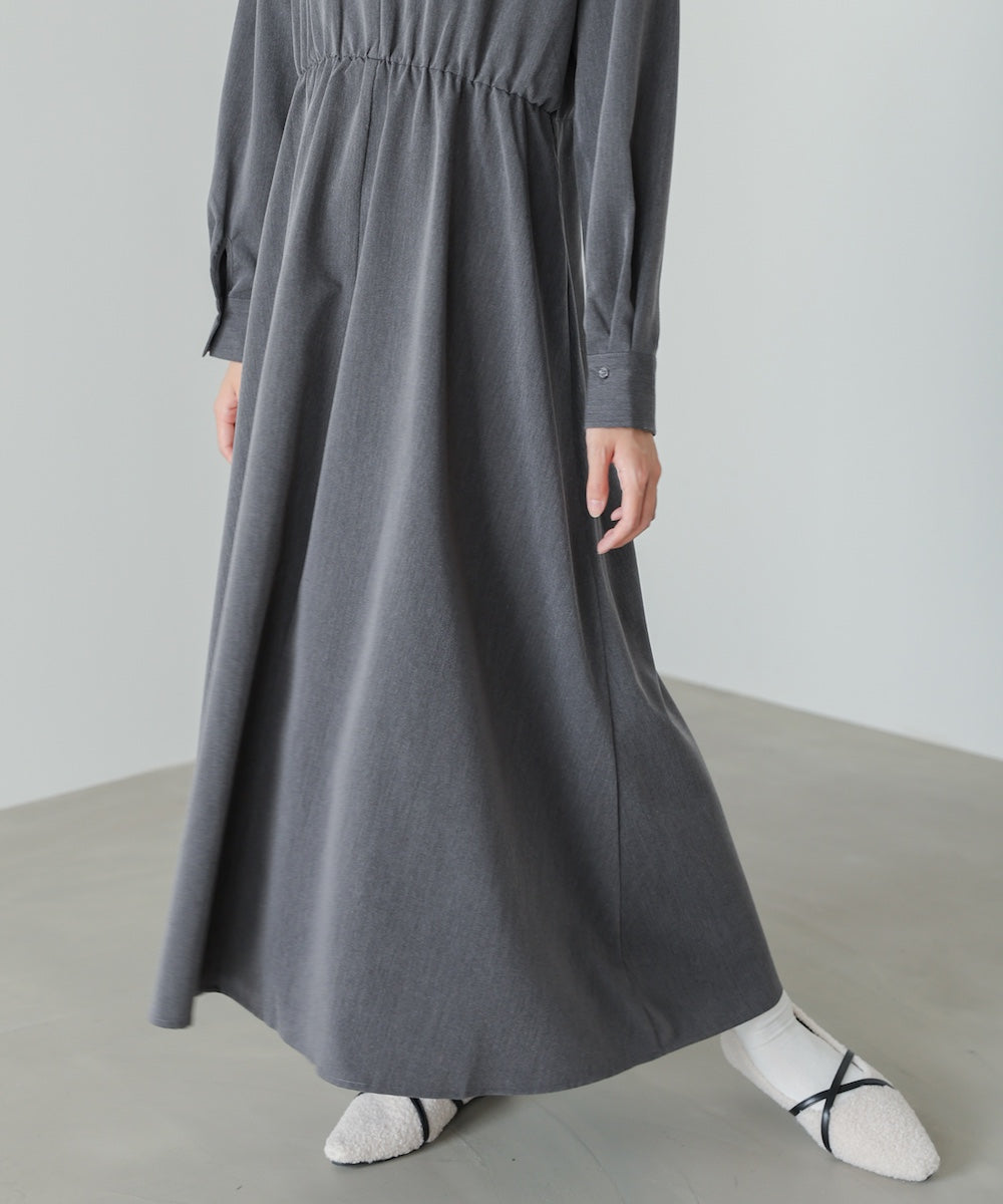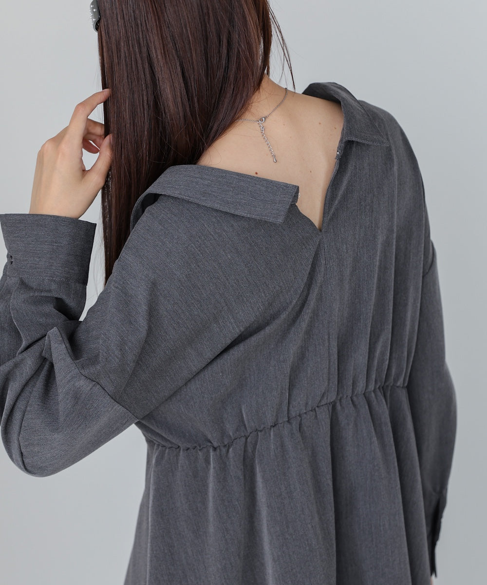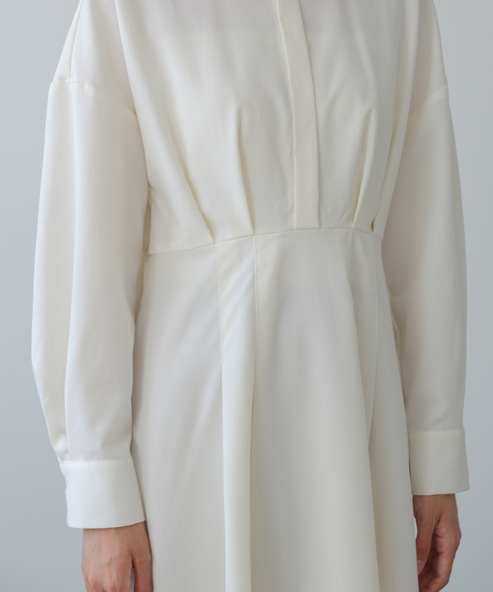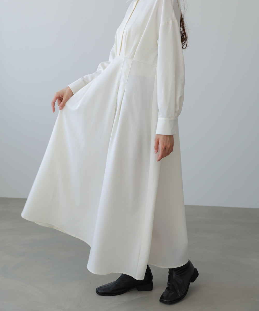 シンプルながらも細部までこだわったデザインが魅力のシャツワンピース。小ぶりな前ボタンやウエストタックが上品な印象を与え、さりげなくウエストマークできる2WAY仕様でシルエットの変化も楽しめます。後ろのホックディテールや控えめな襟元が、洗練された“大人かわいい”雰囲気を演出。お仕事から休日のおでかけまで、シーンを選ばず活躍する万能アイテムです。