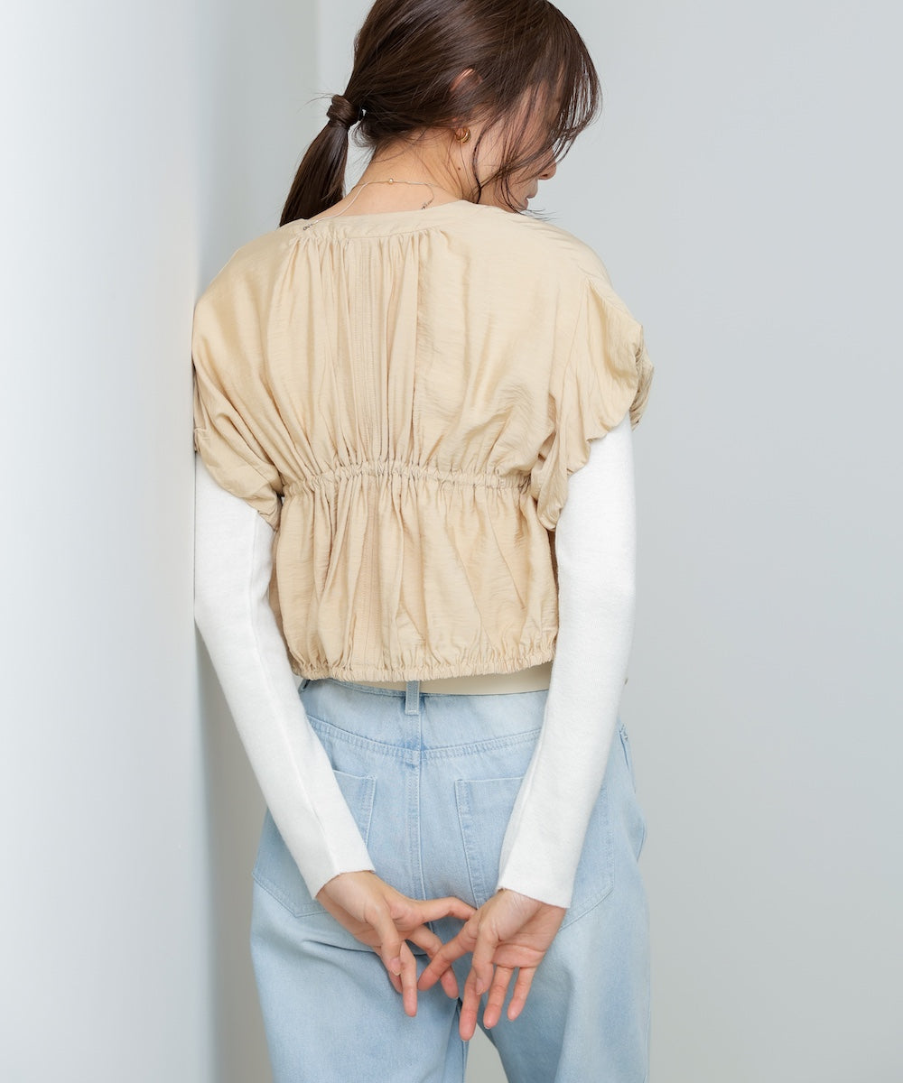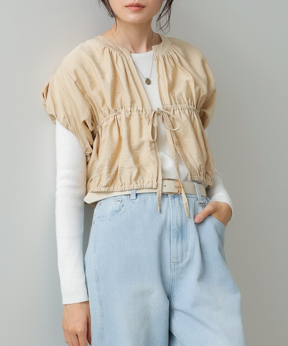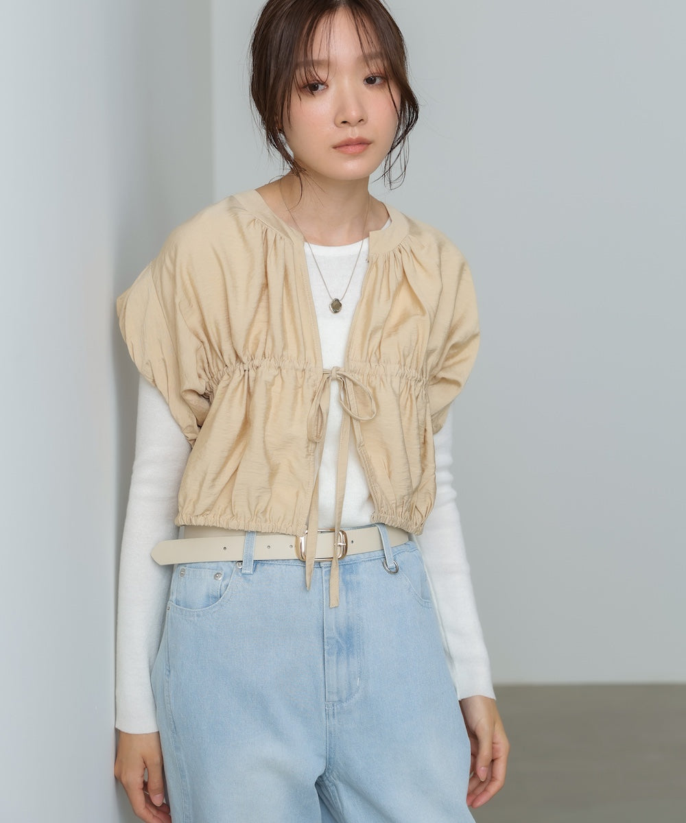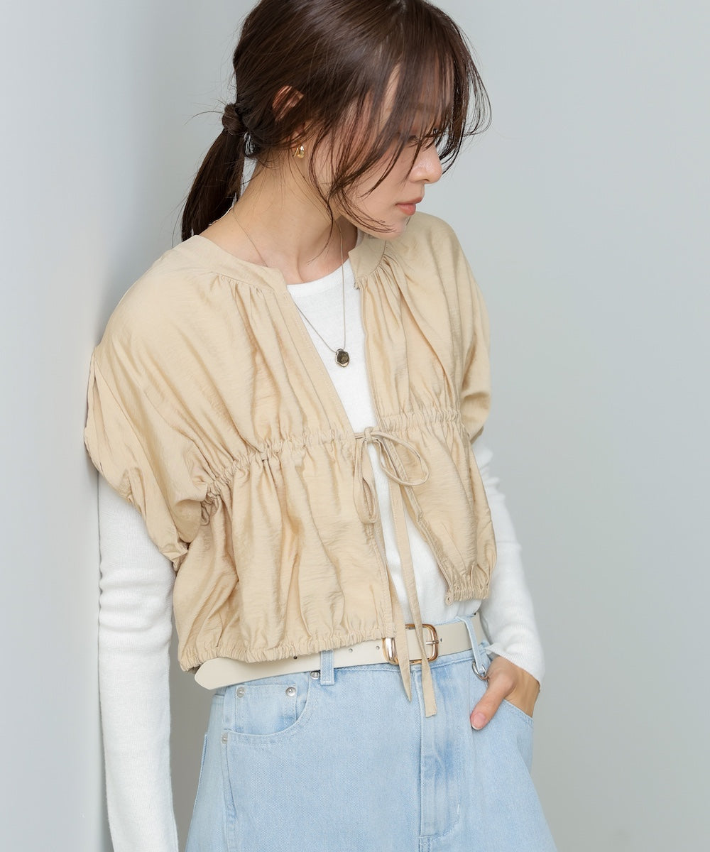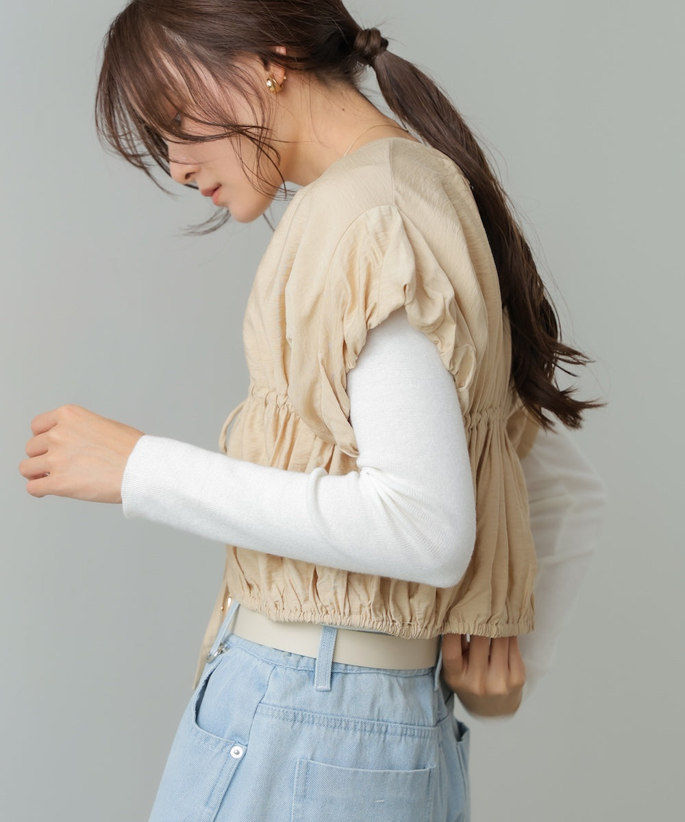 羽織としてもベストとしても使える万能アイテムの登場です!電車の中や会社の中など室内で寒さを感じるときに羽織として使うのにちょうど良い厚さと生地感になっています。中央部分にギャザーが集まっていてウエスト部分が絞れるのもポイントです。袖の部分はふわっとしていて広がりすぎないバルーン袖になっていて、トレンドライクな形になっています。1枚でベストの役割にもなるので、1枚二役で今の季節に大活躍間違いなしです!