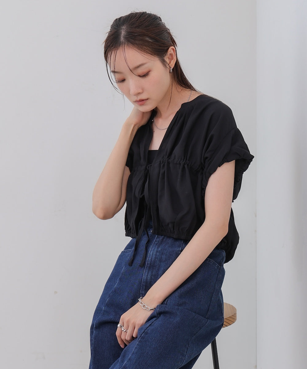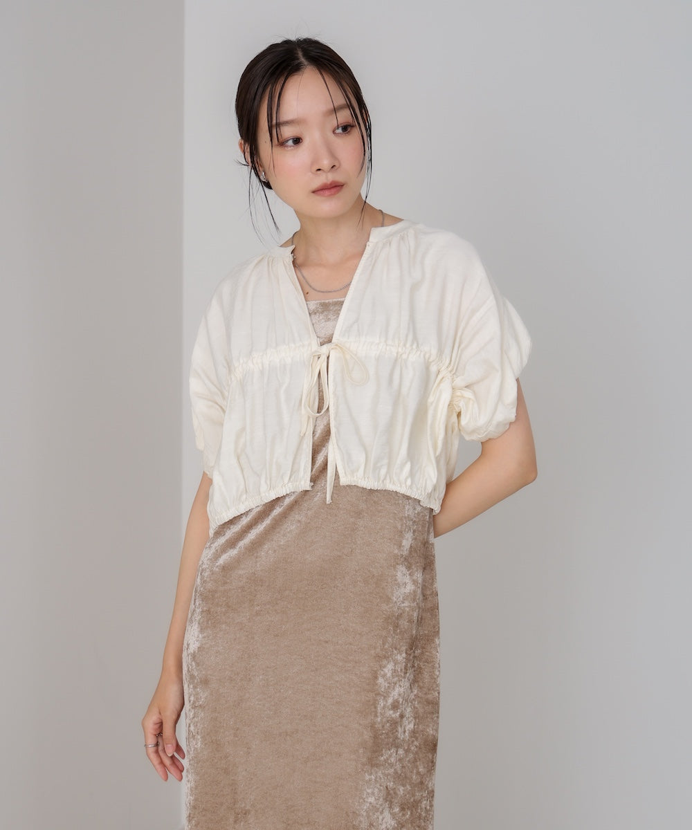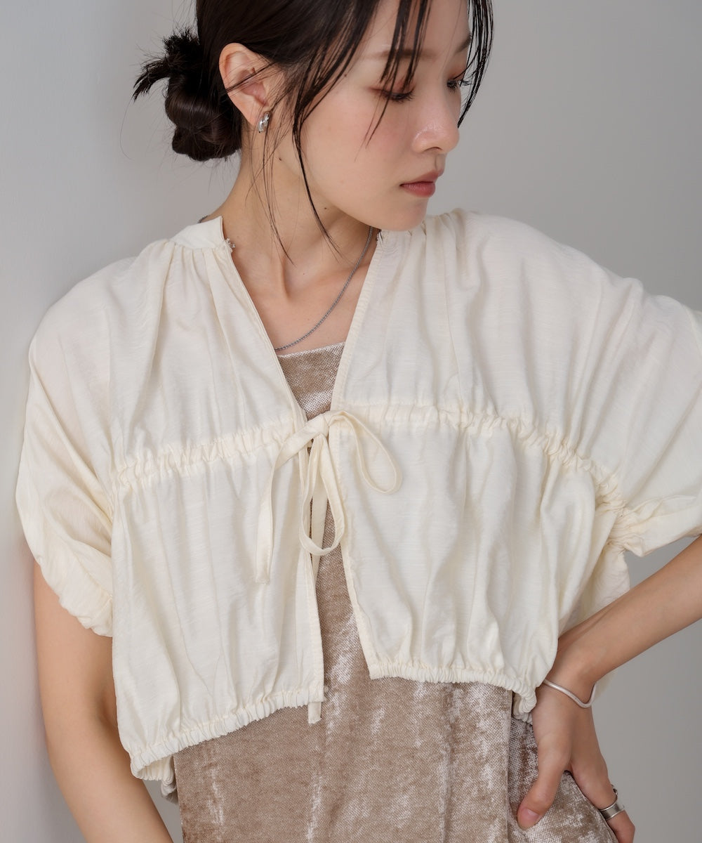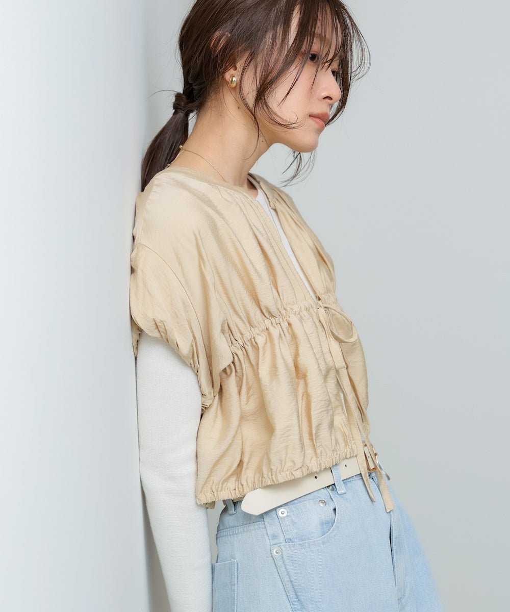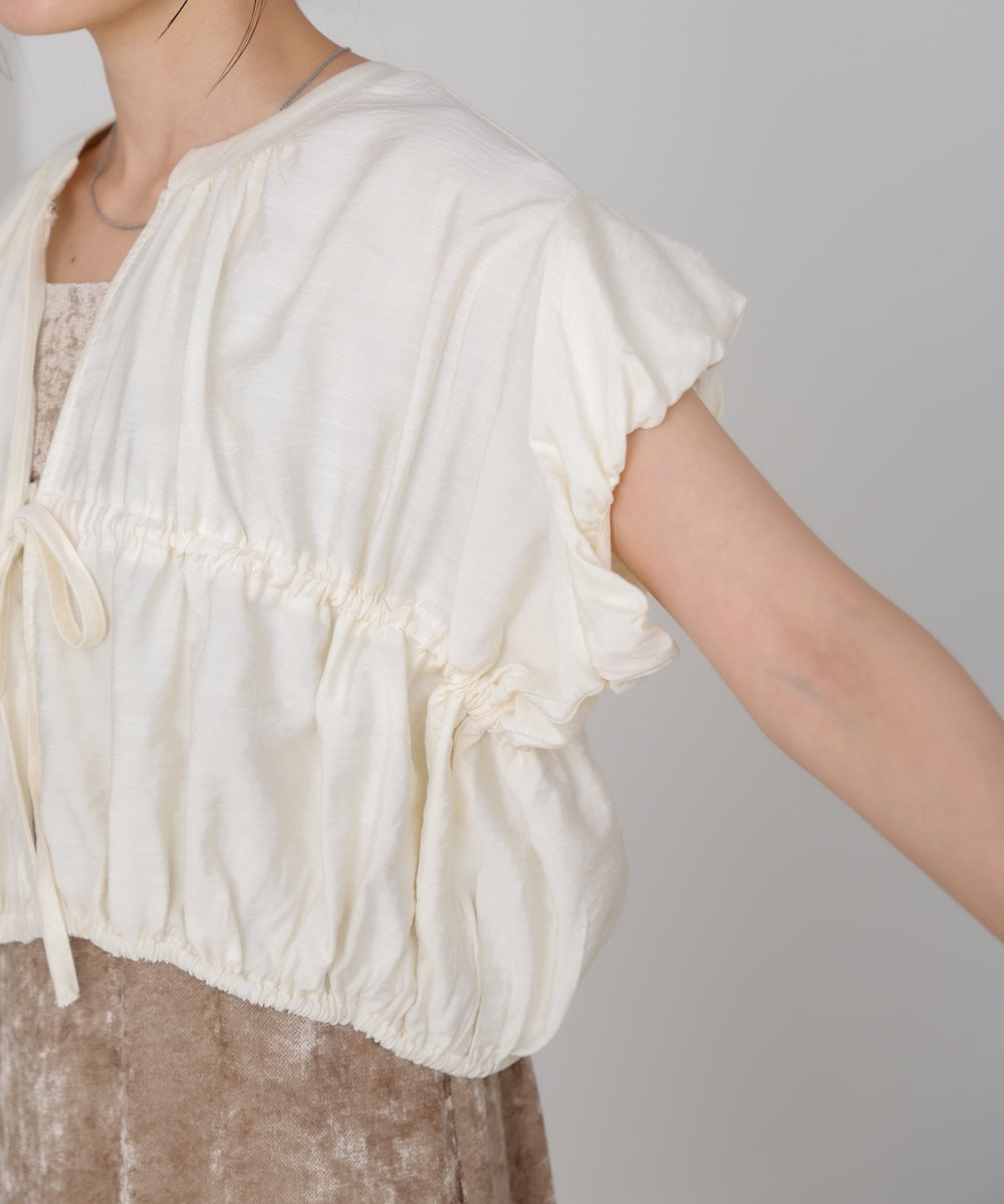 羽織としてもベストとしても使える万能アイテムの登場です!電車の中や会社の中など室内で寒さを感じるときに羽織として使うのにちょうど良い厚さと生地感になっています。中央部分にギャザーが集まっていてウエスト部分が絞れるのもポイントです。袖の部分はふわっとしていて広がりすぎないバルーン袖になっていて、トレンドライクな形になっています。1枚でベストの役割にもなるので、1枚二役で今の季節に大活躍間違いなしです!