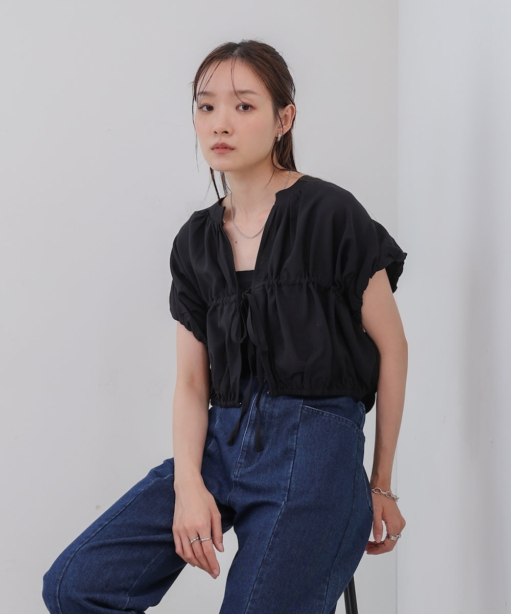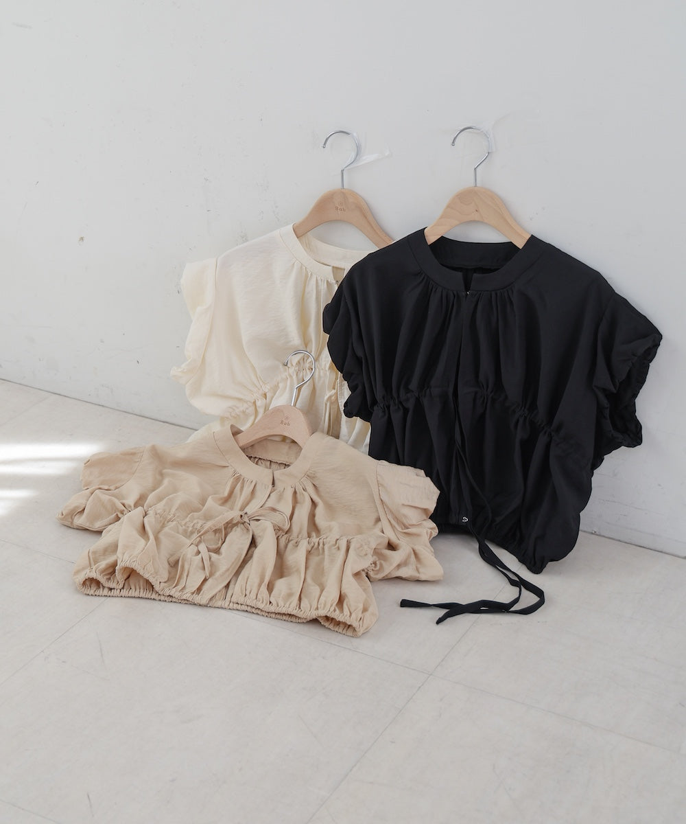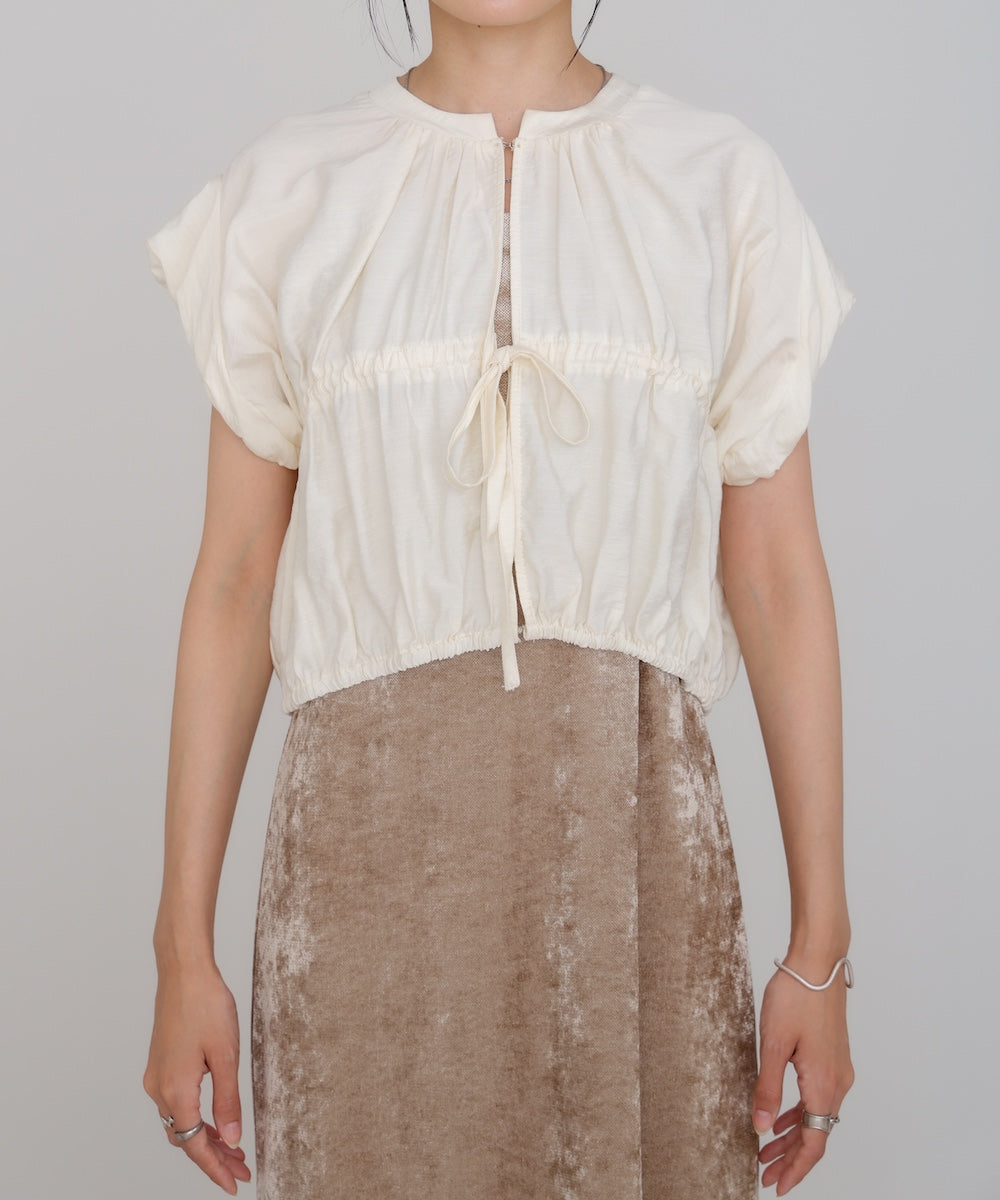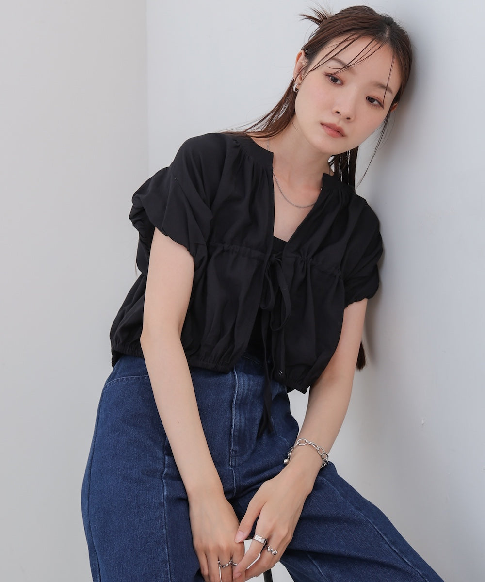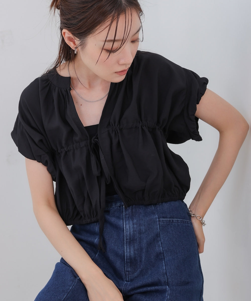 羽織としてもベストとしても使える万能アイテムの登場です!電車の中や会社の中など室内で寒さを感じるときに羽織として使うのにちょうど良い厚さと生地感になっています。中央部分にギャザーが集まっていてウエスト部分が絞れるのもポイントです。袖の部分はふわっとしていて広がりすぎないバルーン袖になっていて、トレンドライクな形になっています。1枚でベストの役割にもなるので、1枚二役で今の季節に大活躍間違いなしです!