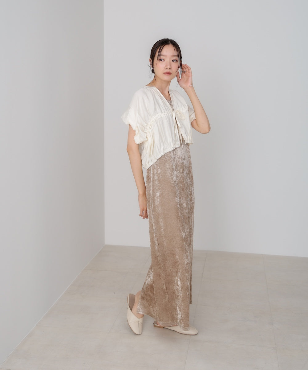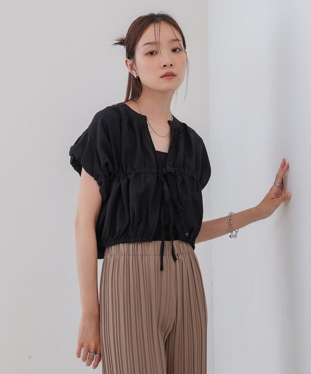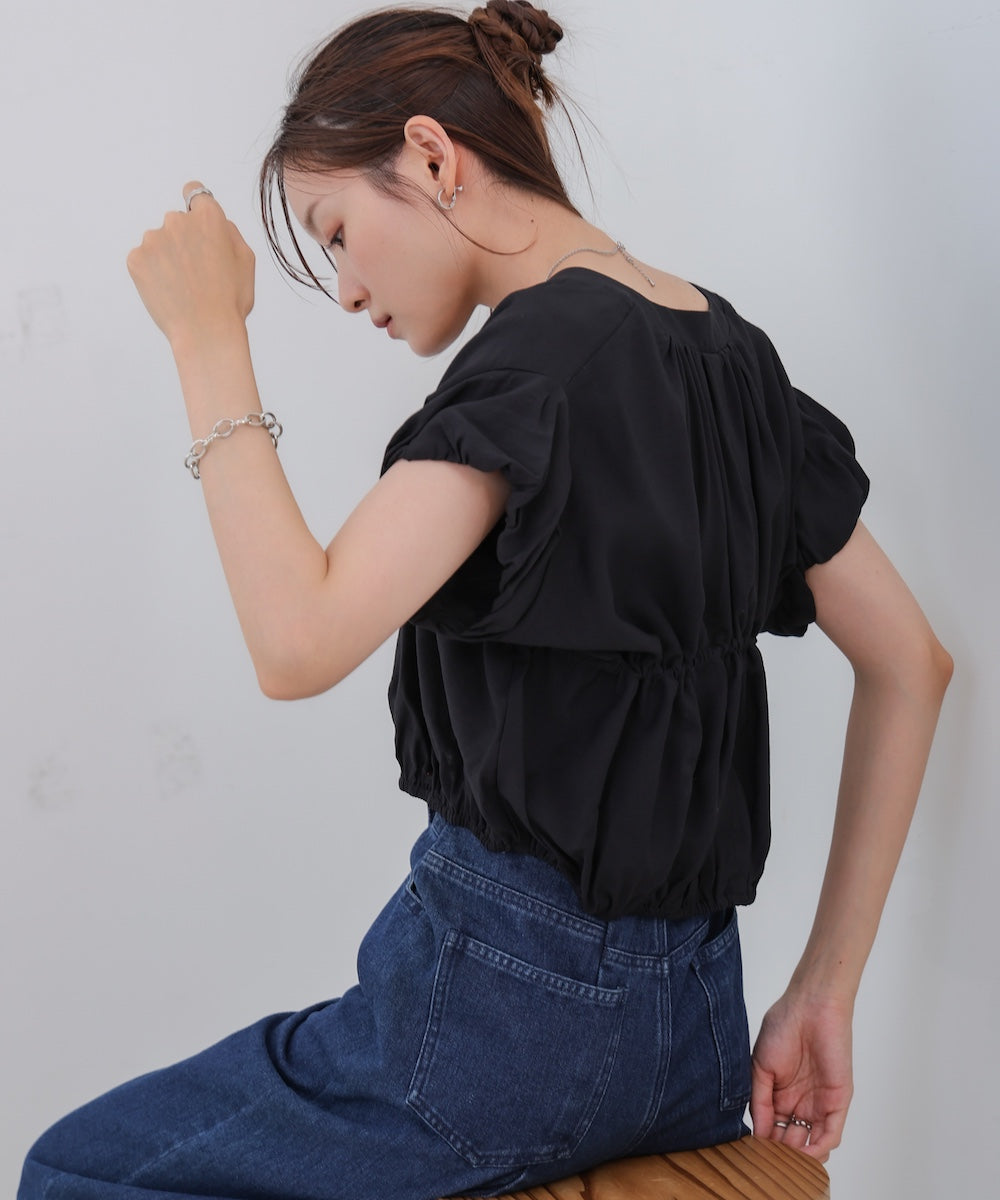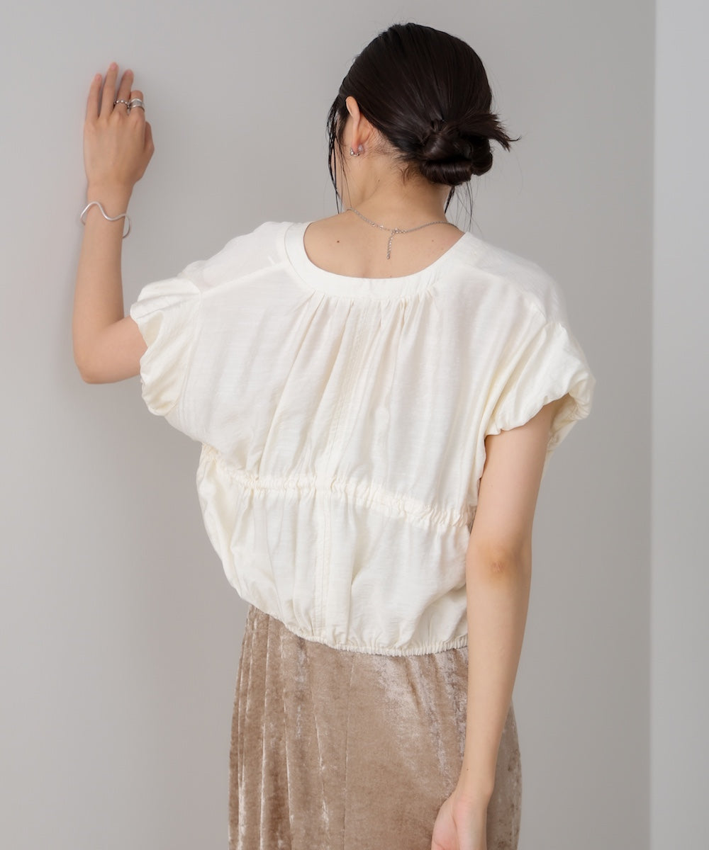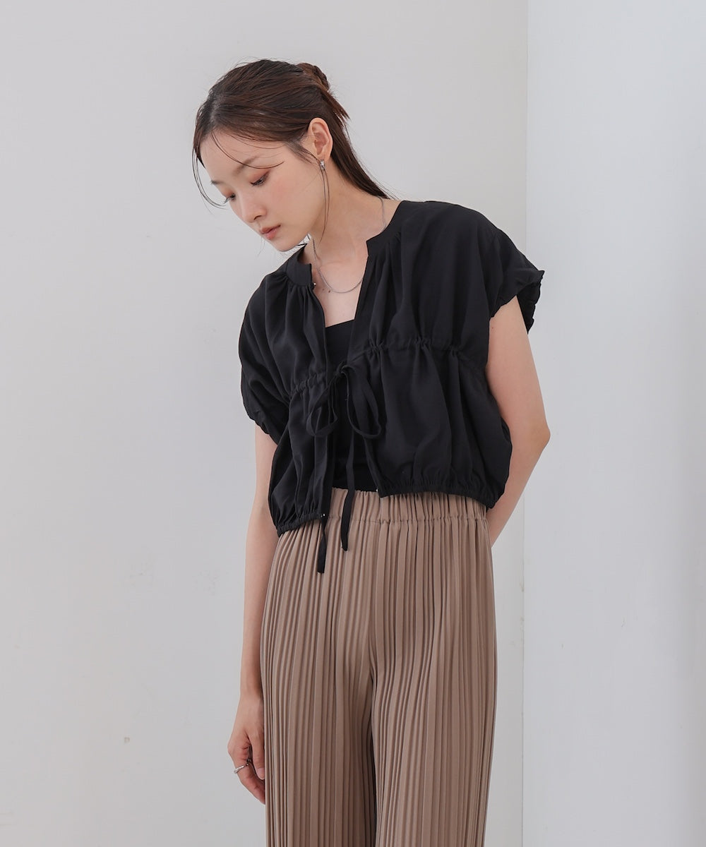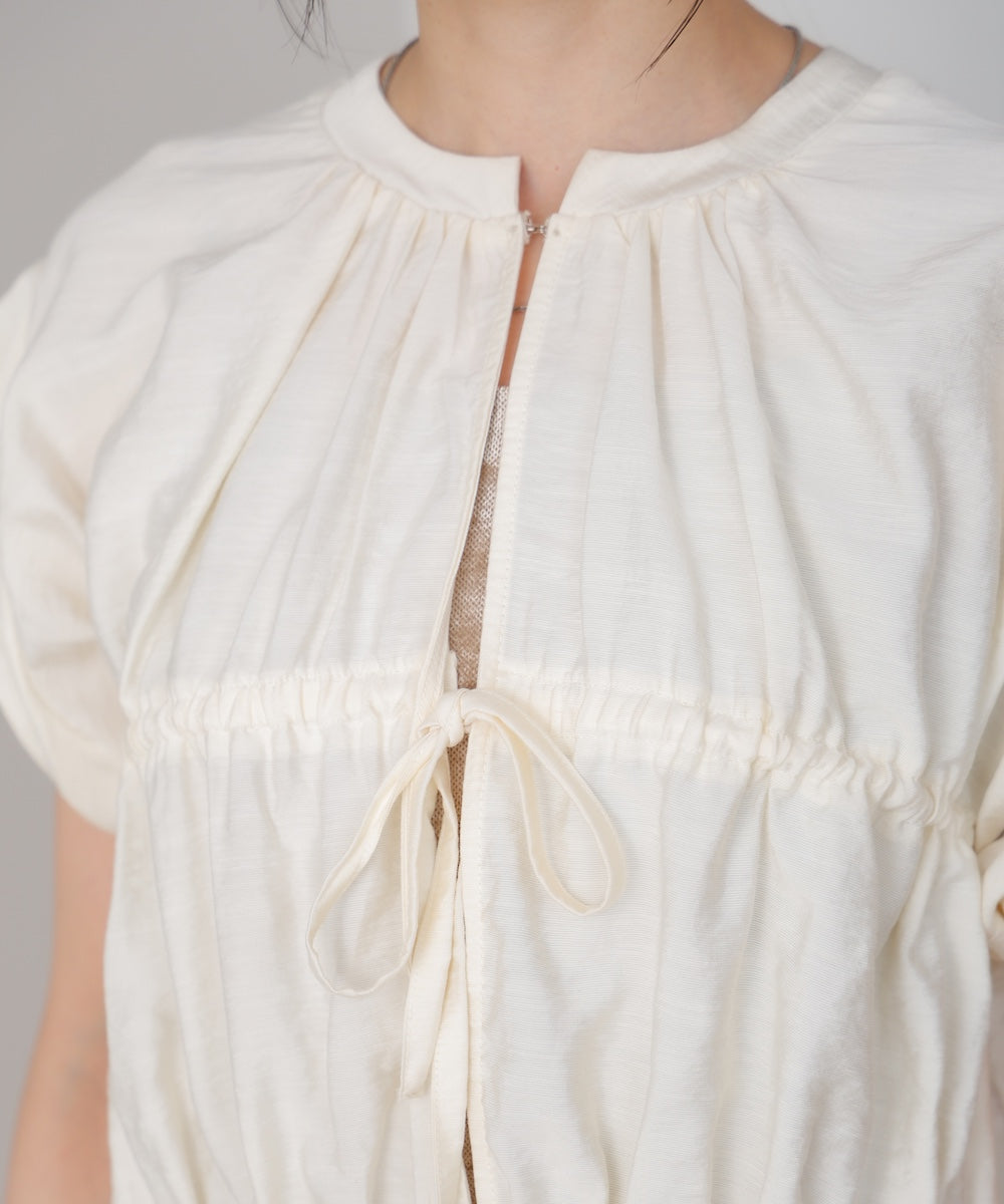羽織としてもベストとしても使える万能アイテムの登場です!電車の中や会社の中など室内で寒さを感じるときに羽織として使うのにちょうど良い厚さと生地感になっています。中央部分にギャザーが集まっていてウエスト部分が絞れるのもポイントです。袖の部分はふわっとしていて広がりすぎないバルーン袖になっていて、トレンドライクな形になっています。1枚でベストの役割にもなるので、1枚二役で今の季節に大活躍間違いなしです!