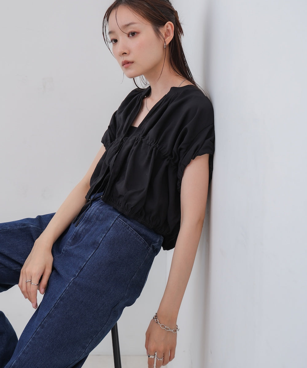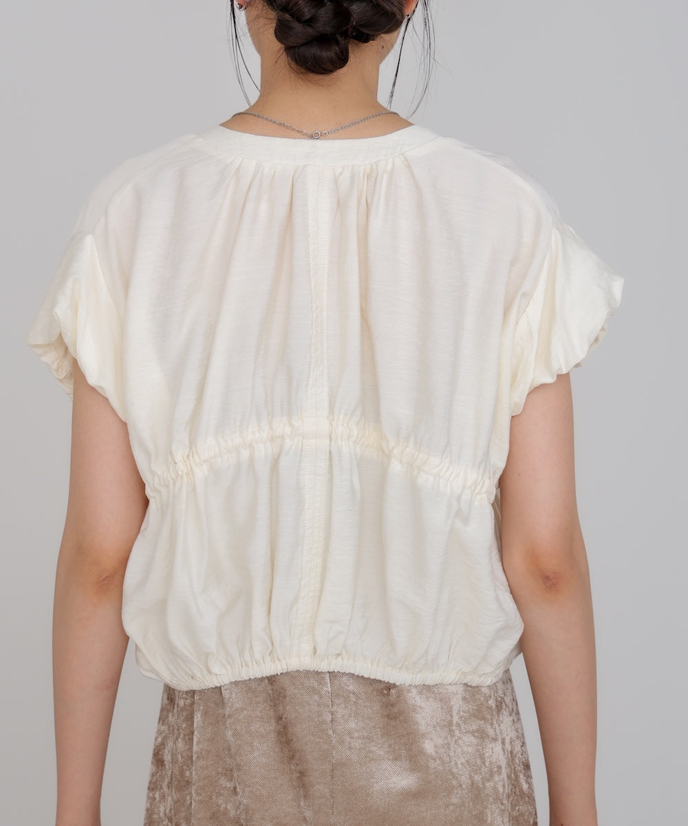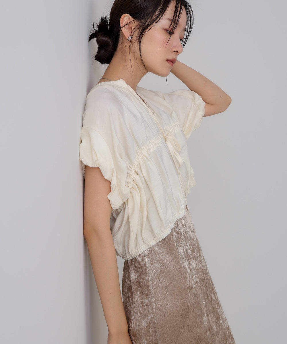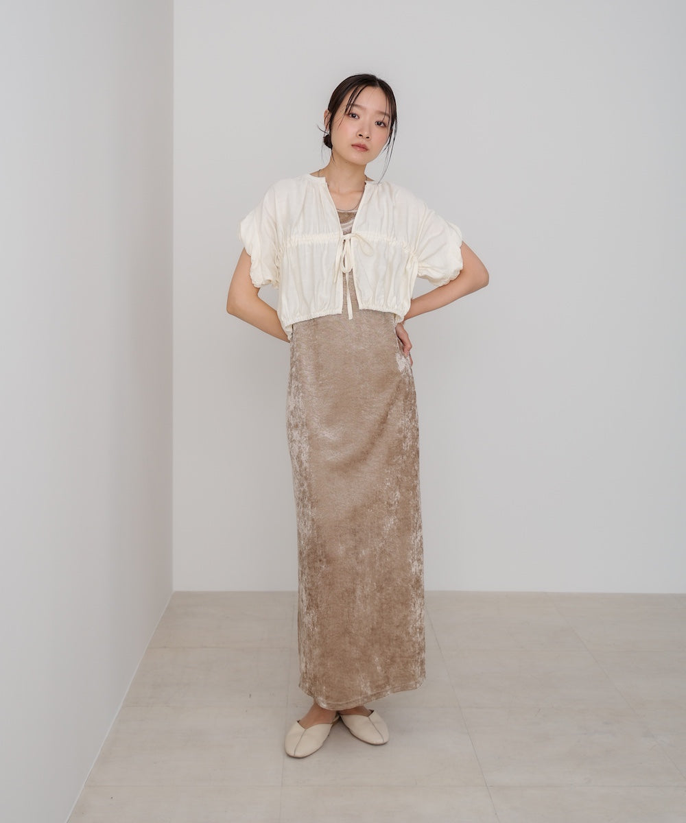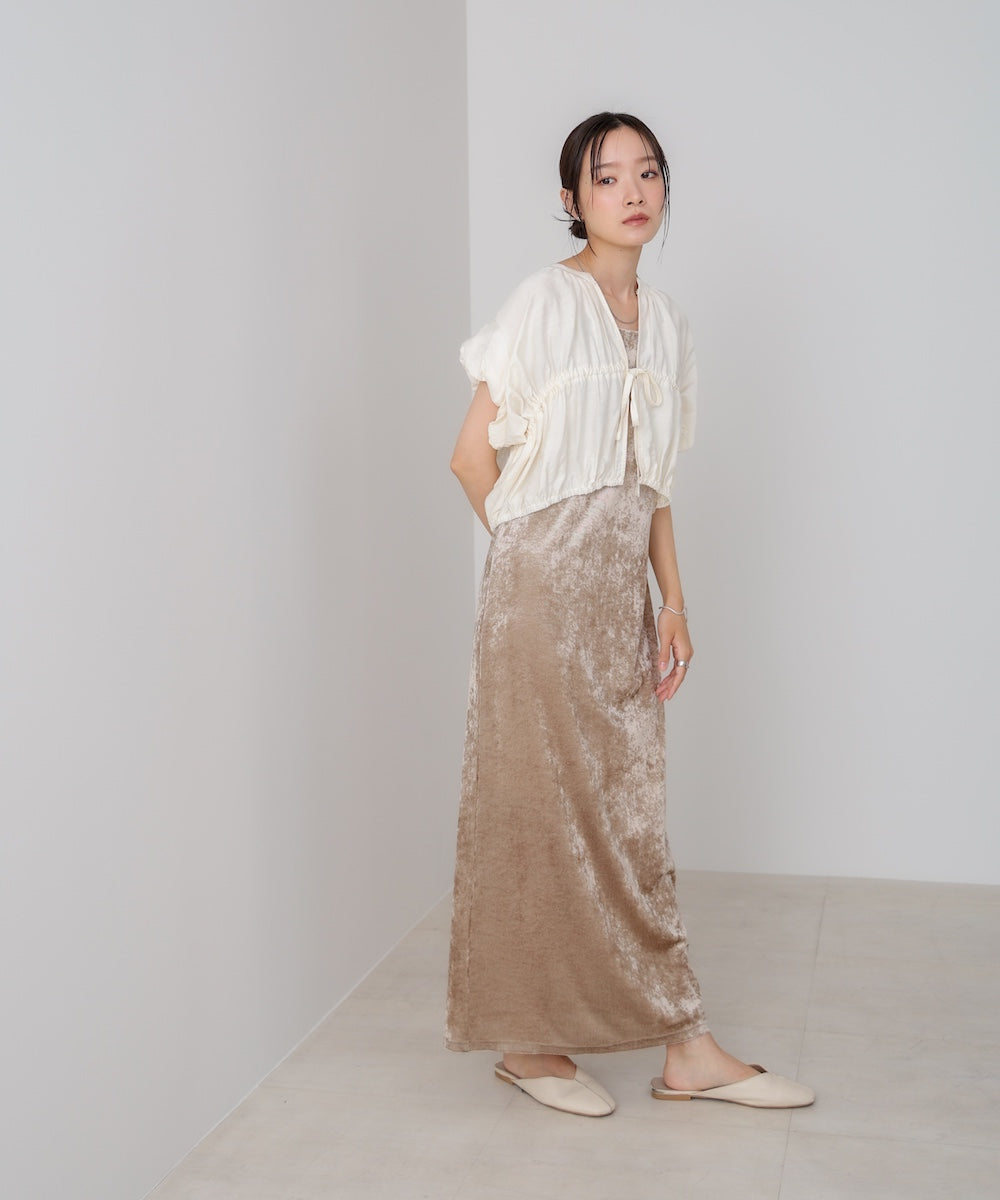 羽織としてもベストとしても使える万能アイテムの登場です!電車の中や会社の中など室内で寒さを感じるときに羽織として使うのにちょうど良い厚さと生地感になっています。中央部分にギャザーが集まっていてウエスト部分が絞れるのもポイントです。袖の部分はふわっとしていて広がりすぎないバルーン袖になっていて、トレンドライクな形になっています。1枚でベストの役割にもなるので、1枚二役で今の季節に大活躍間違いなしです!