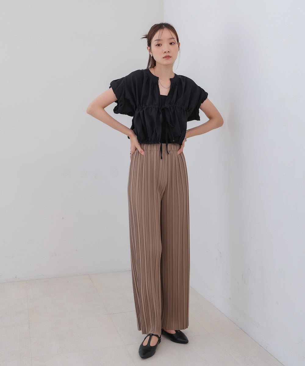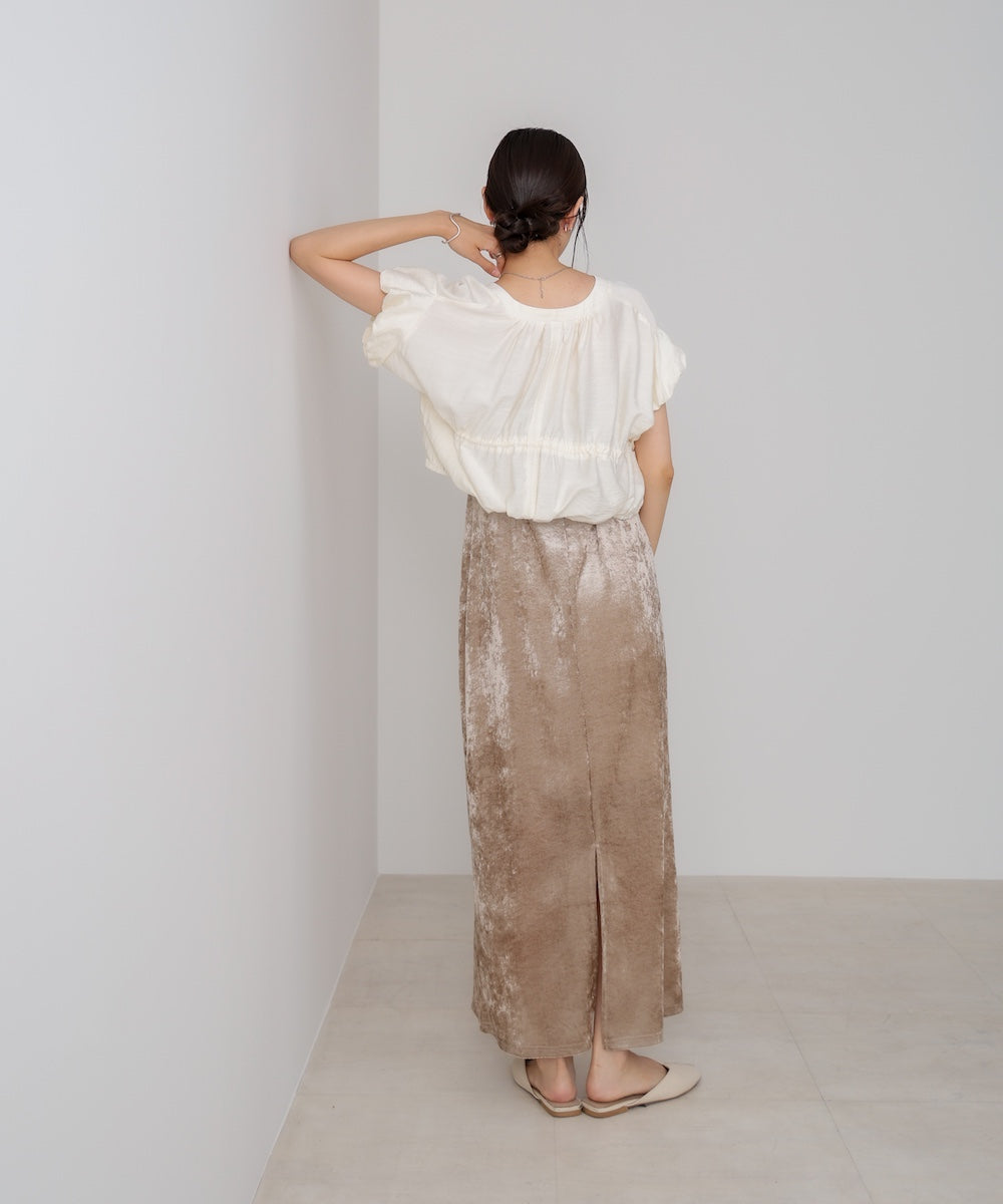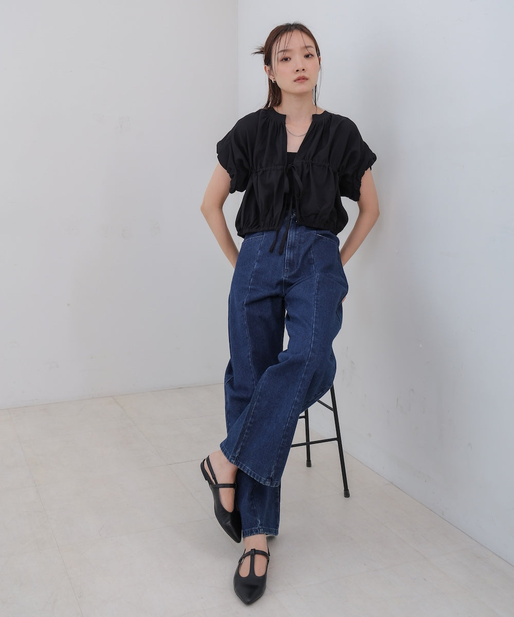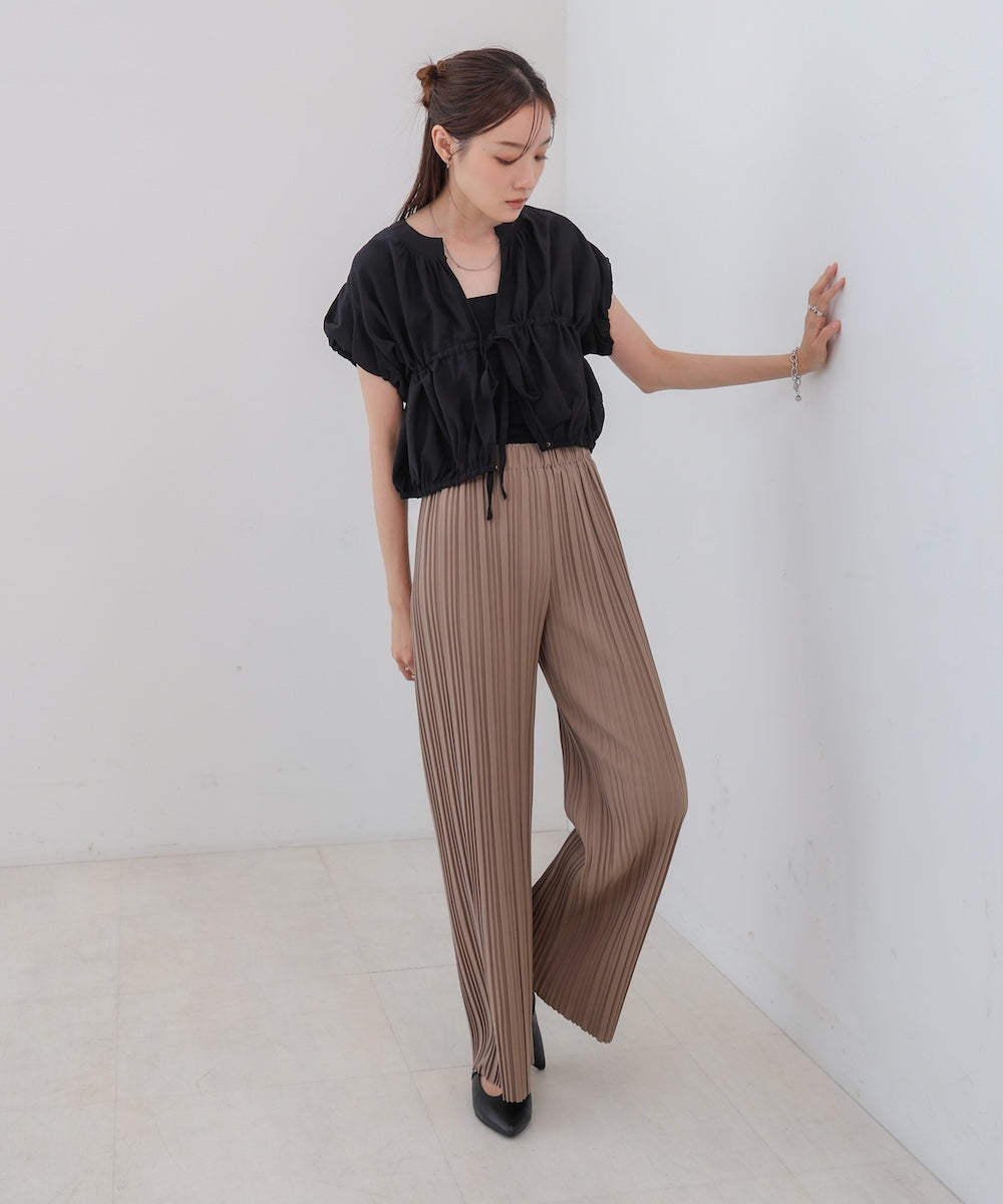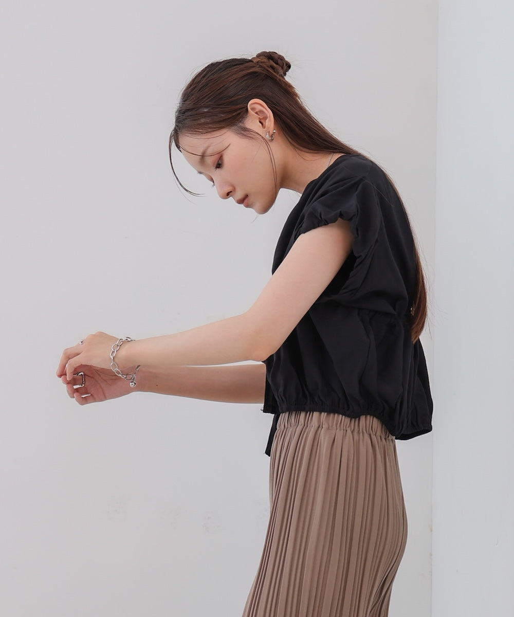 羽織としてもベストとしても使える万能アイテムの登場です!電車の中や会社の中など室内で寒さを感じるときに羽織として使うのにちょうど良い厚さと生地感になっています。中央部分にギャザーが集まっていてウエスト部分が絞れるのもポイントです。袖の部分はふわっとしていて広がりすぎないバルーン袖になっていて、トレンドライクな形になっています。1枚でベストの役割にもなるので、1枚二役で今の季節に大活躍間違いなしです!