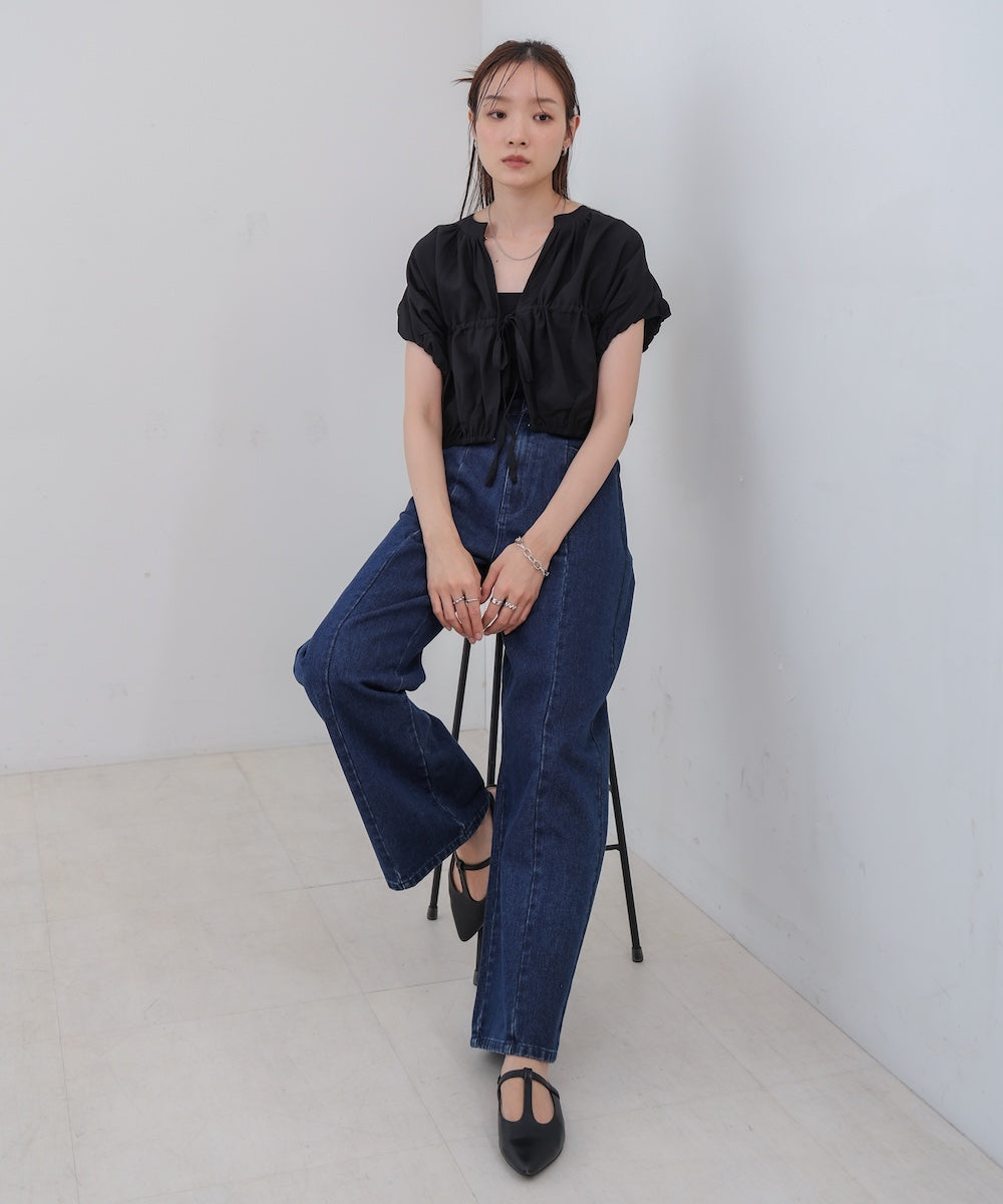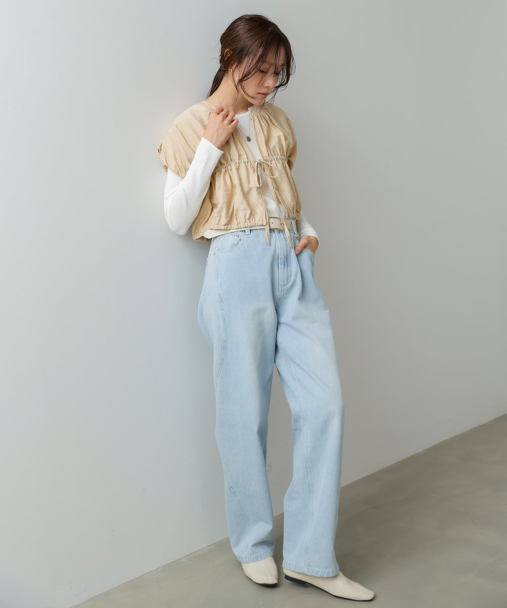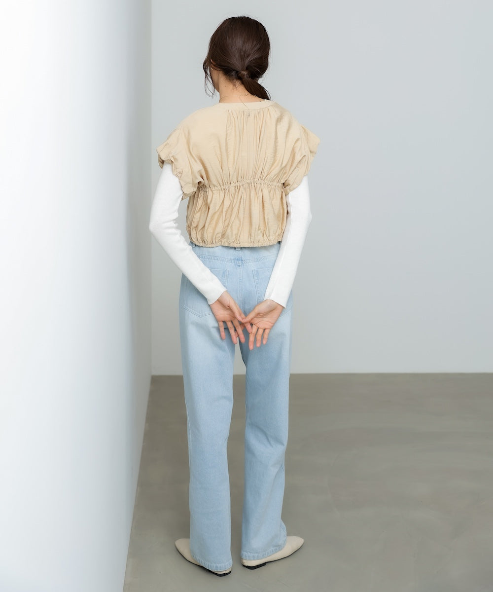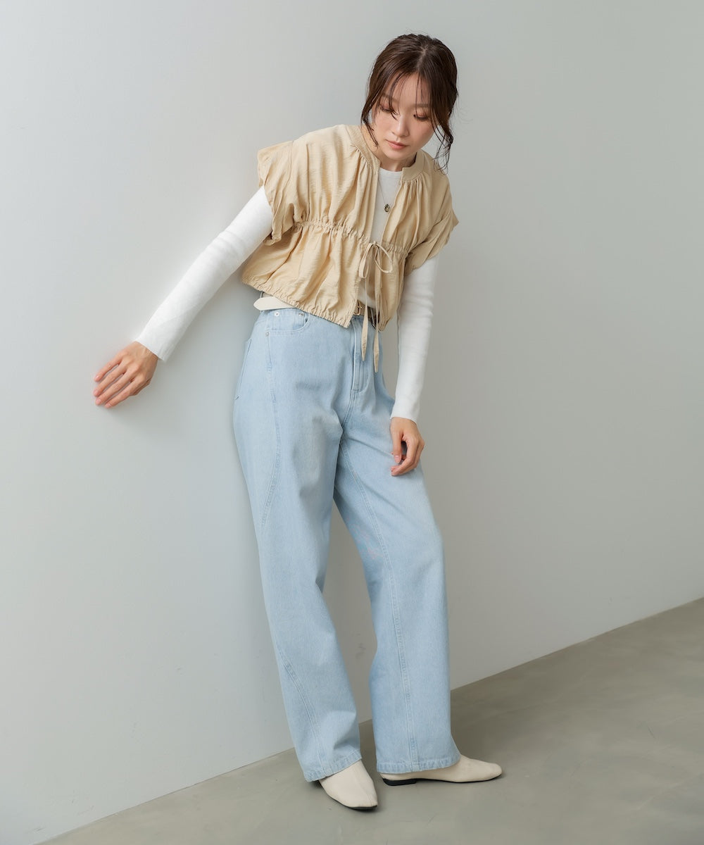 ワンピースの上に重ねるとベストがショート丈なのでスタイルアップして見えます。デニムと合わせてもベストが1枚で主役級になるのでカジュアルフェミニンなスタイリングになります!