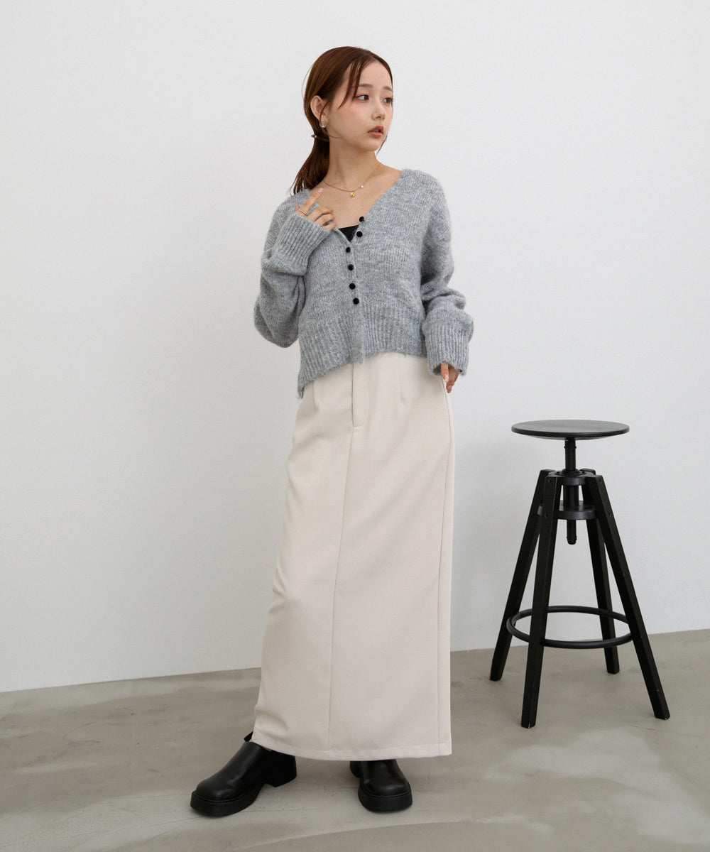タイトスカートはニットやカーディガンなど少し厚手のものと合わせたり、ロンTなどと合わせたりしてもカジュアルフェミニンなスタイリングになります。フレアスカートはベロアのカットソーなどデザイン性のある薄手トップスやショート丈のカーディガンなどと合わせるのがメリハリがしっかりあるスタイリングになるのでおすすめです。