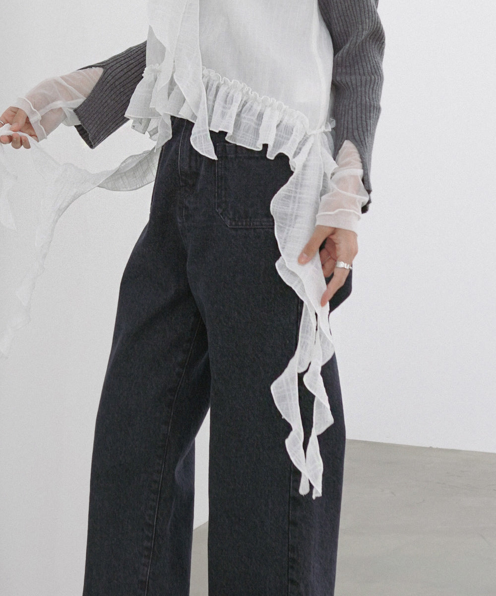 ワイドパンツとシアーインナーや薄手トップスと組み合わせるとトレンドライクなコーディングになります。ヒールと合わせるとより韓国フェミニンなスタイリングになります。