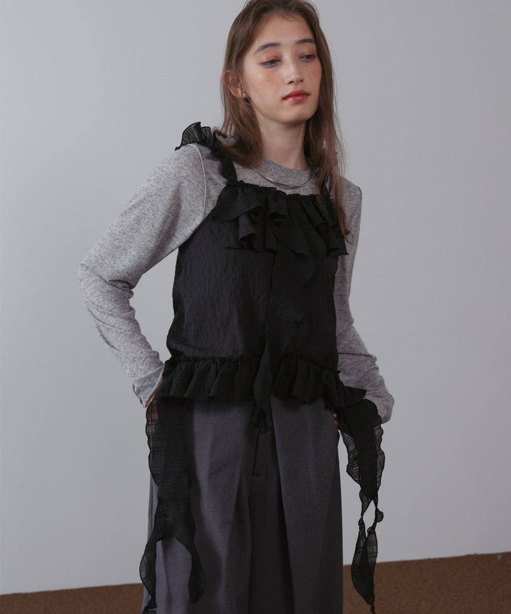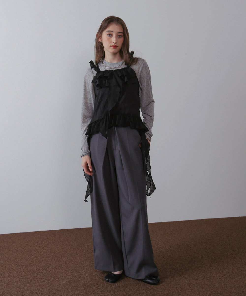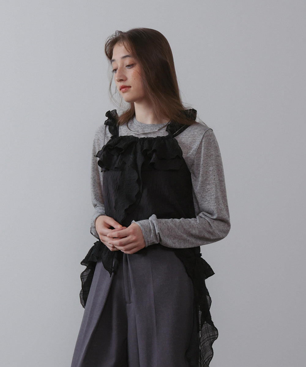 フェミニンムード漂うラッフルフリルキャミソール。胸元にあしらったラッフルフリルが華やかさをプラスし、動くたびに揺れるレースディテールが女性らしさを引き立てます。キャミソールながらも存在感があり、1枚で主役になるアイテムです。さらりとした落ち感のある素材で、軽やかな着心地が魅力。デニムと合わせたカジュアルMIXはもちろん、スカートやワイドパンツと合わせればきれいめにも着こなせます。カーディガンやジャケットのインナーとしても活躍し、シーズンレスに取り入れられる万能トップスです。