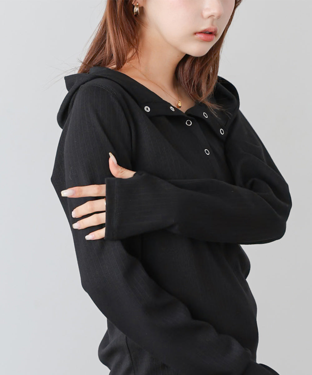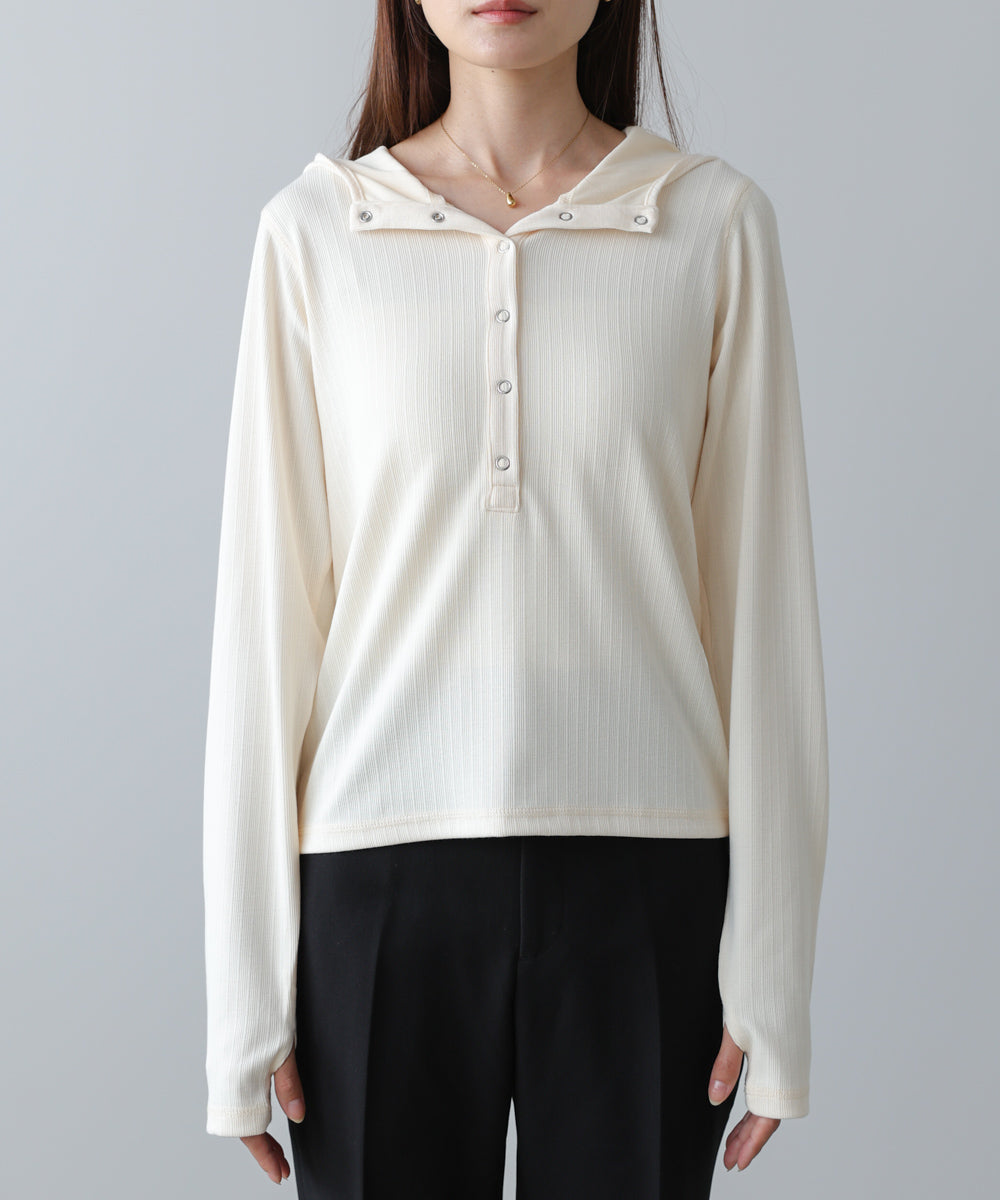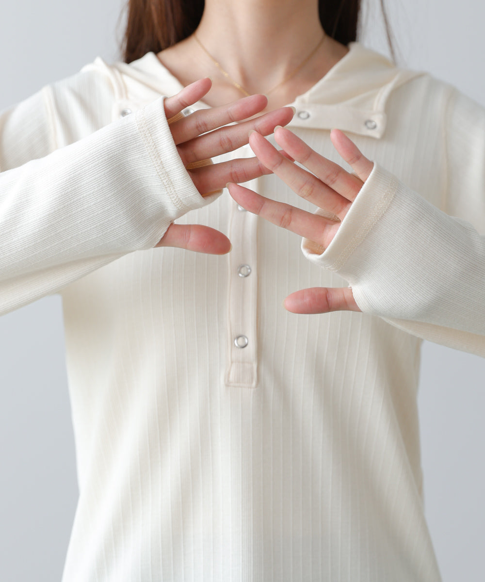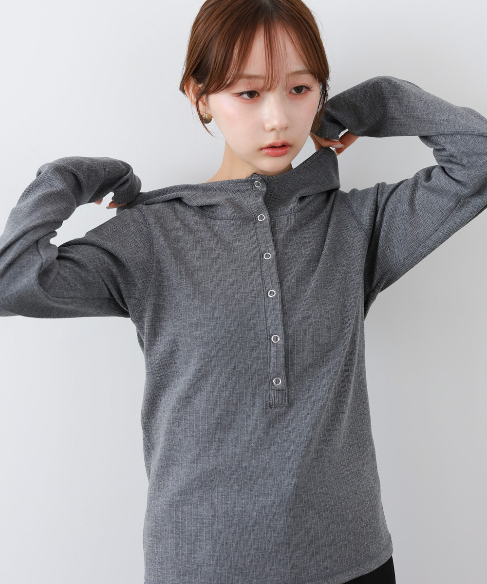 リブ素材で仕立てたフーディートップス。サムホール付きの袖やシルバー金具のボタンがポイントになり、シンプルながらもこなれ感を演出します。アイボリー・グレー・ブラックのベーシックな3色展開で、カジュアルスタイルから大人フェミニンな着こなしまで幅広く活躍。休日のおでかけにぴったりな、程よくラフさのある一枚です。