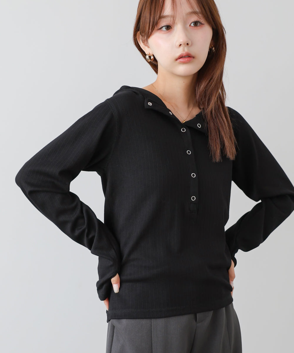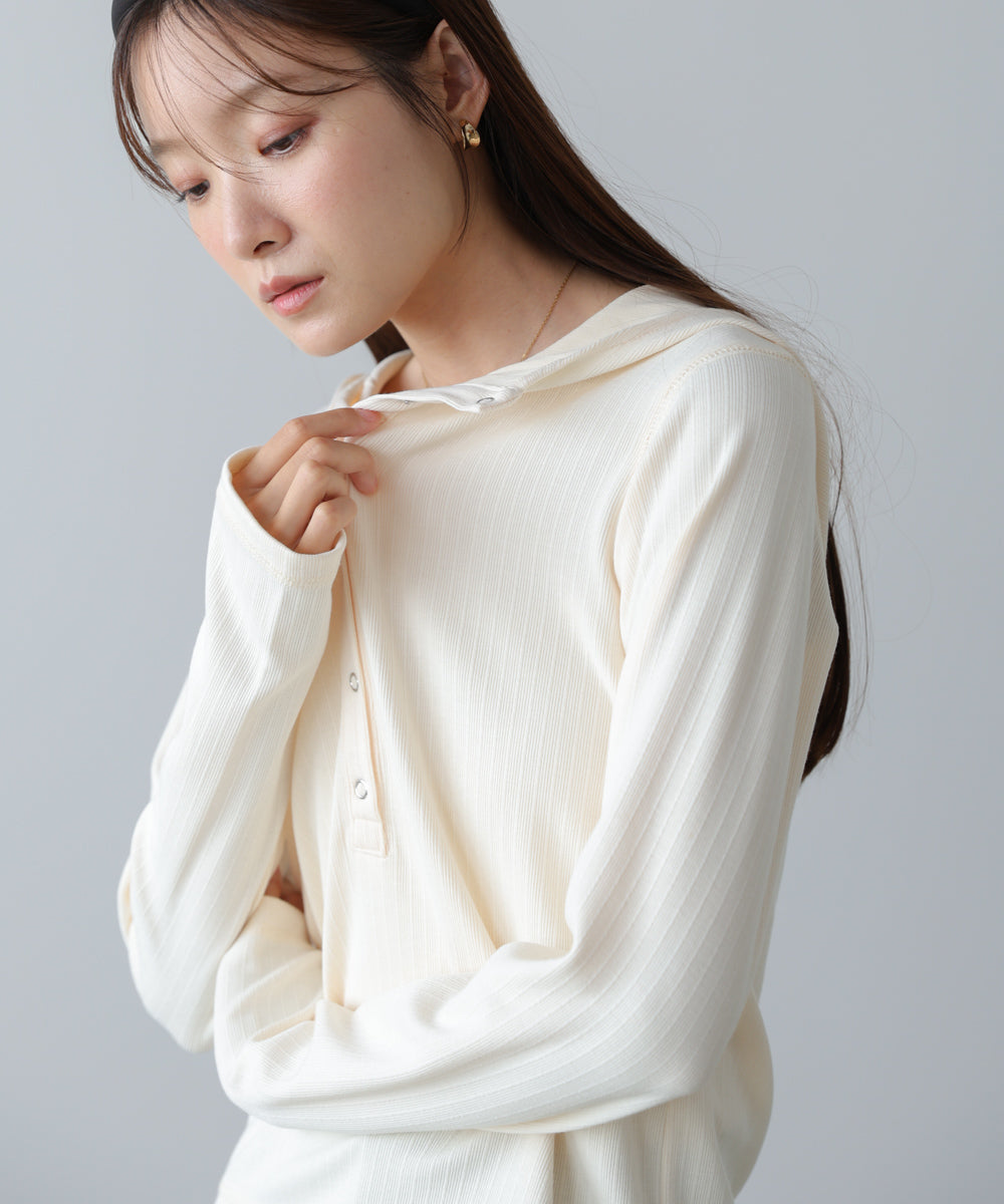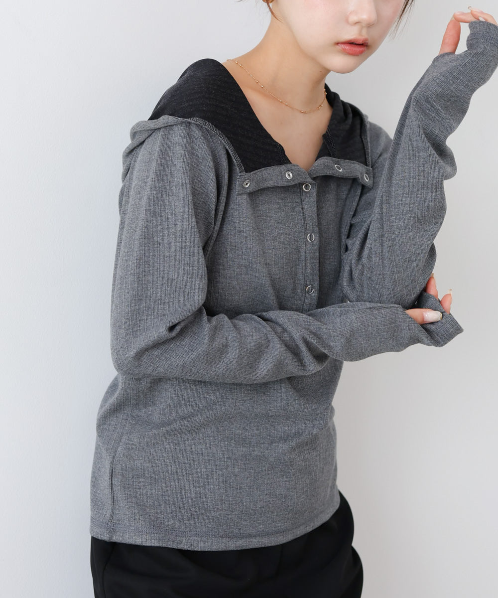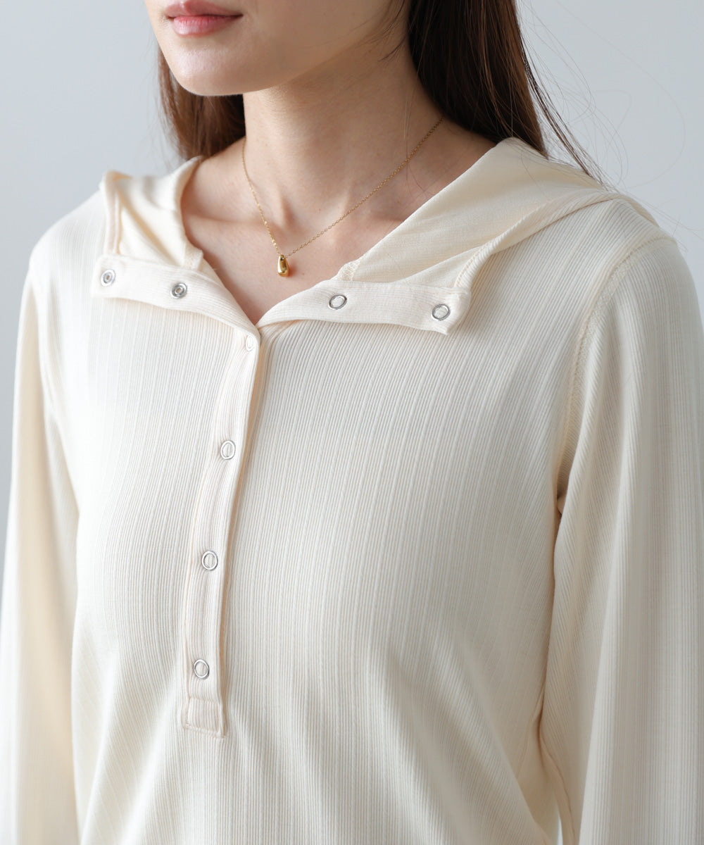 リブ素材で仕立てたフーディートップス。サムホール付きの袖やシルバー金具のボタンがポイントになり、シンプルながらもこなれ感を演出します。アイボリー・グレー・ブラックのベーシックな3色展開で、カジュアルスタイルから大人フェミニンな着こなしまで幅広く活躍。休日のおでかけにぴったりな、程よくラフさのある一枚です。