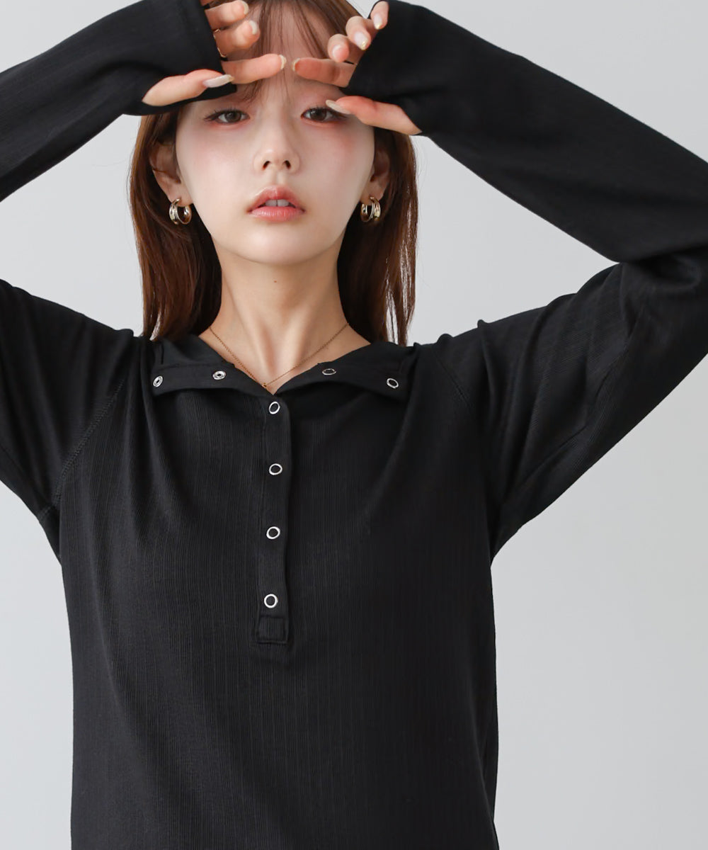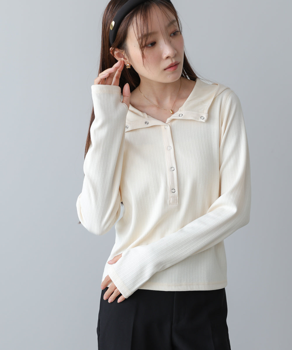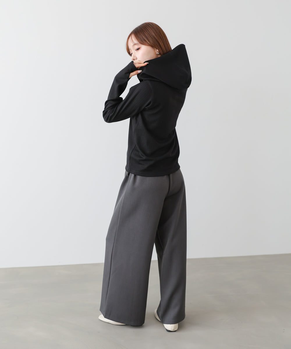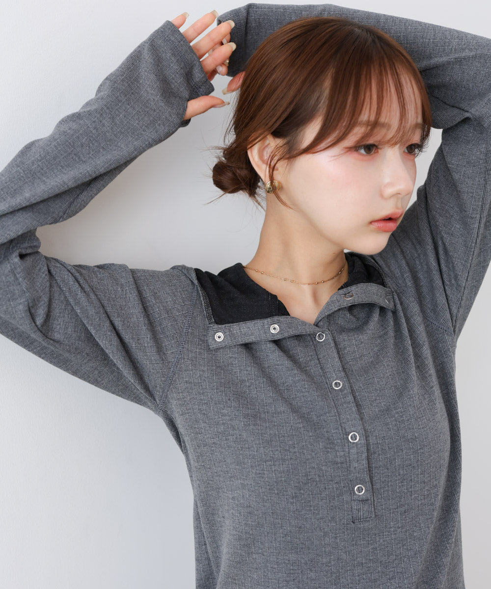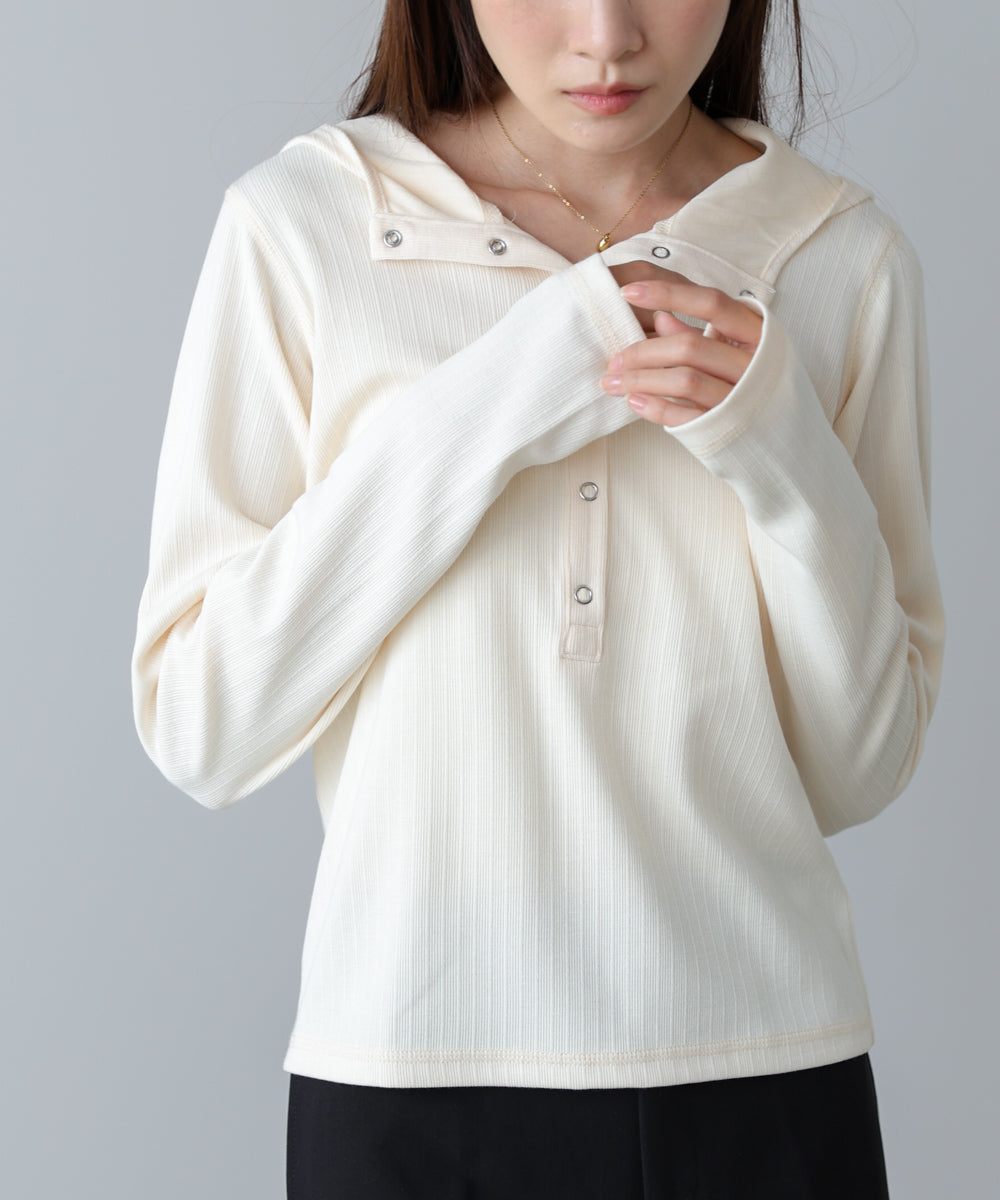 リブ素材で仕立てたフーディートップス。サムホール付きの袖やシルバー金具のボタンがポイントになり、シンプルながらもこなれ感を演出します。アイボリー・グレー・ブラックのベーシックな3色展開で、カジュアルスタイルから大人フェミニンな着こなしまで幅広く活躍。休日のおでかけにぴったりな、程よくラフさのある一枚です。