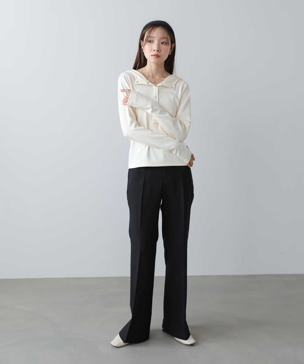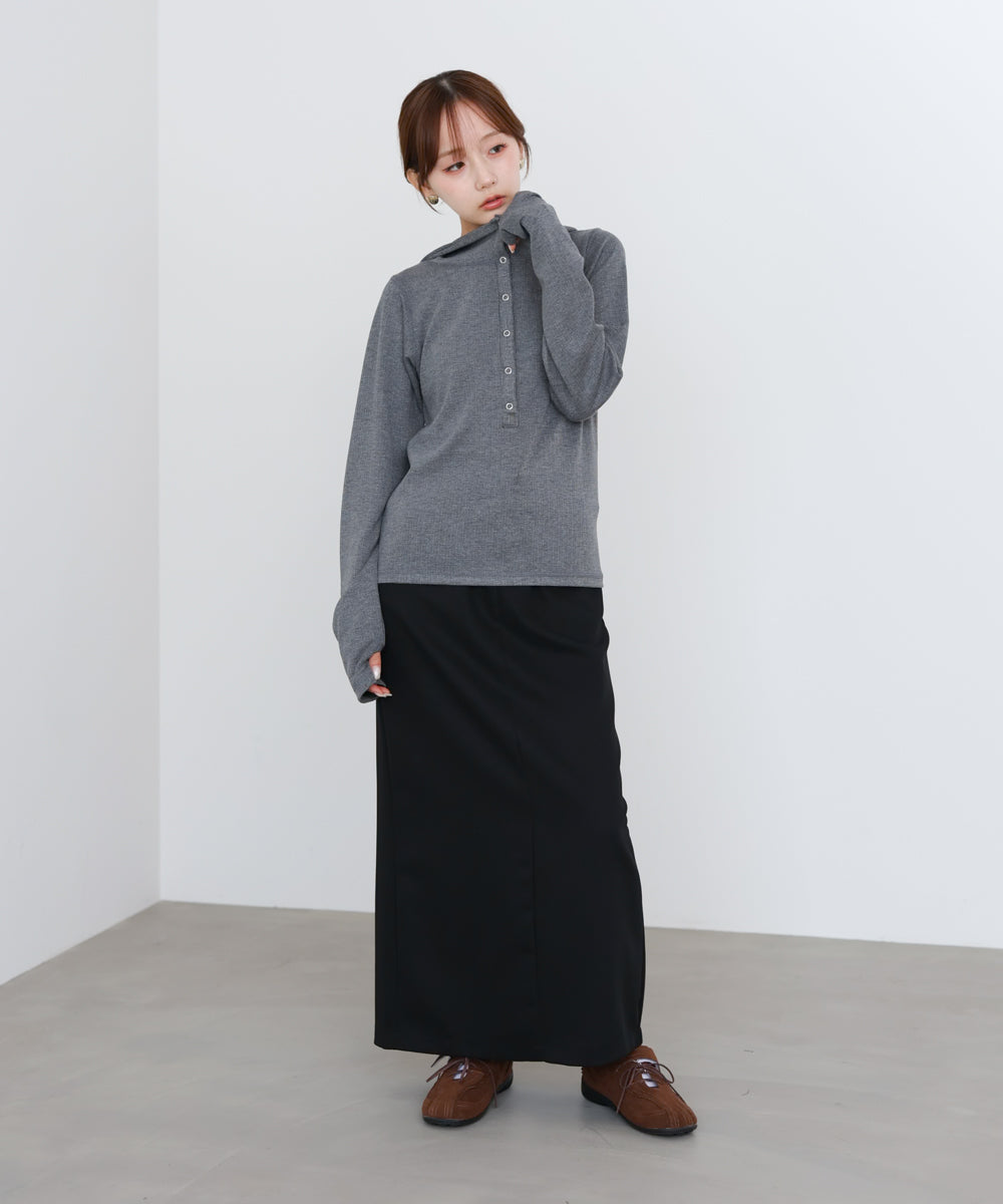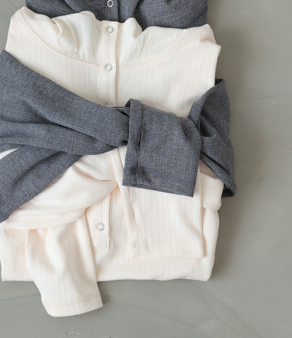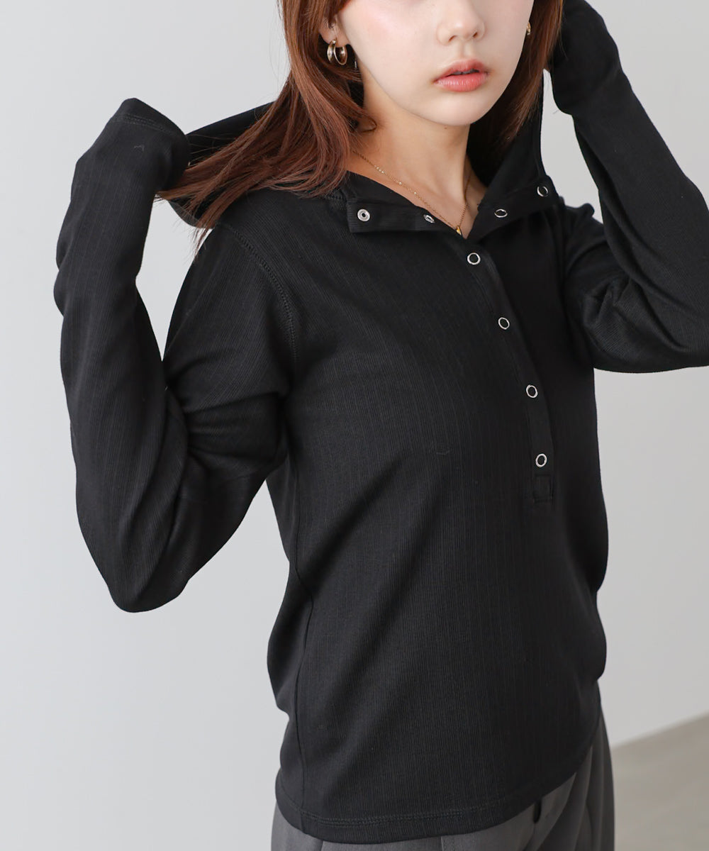 リブ素材で仕立てたフーディートップス。サムホール付きの袖やシルバー金具のボタンがポイントになり、シンプルながらもこなれ感を演出します。アイボリー・グレー・ブラックのベーシックな3色展開で、カジュアルスタイルから大人フェミニンな着こなしまで幅広く活躍。休日のおでかけにぴったりな、程よくラフさのある一枚です。