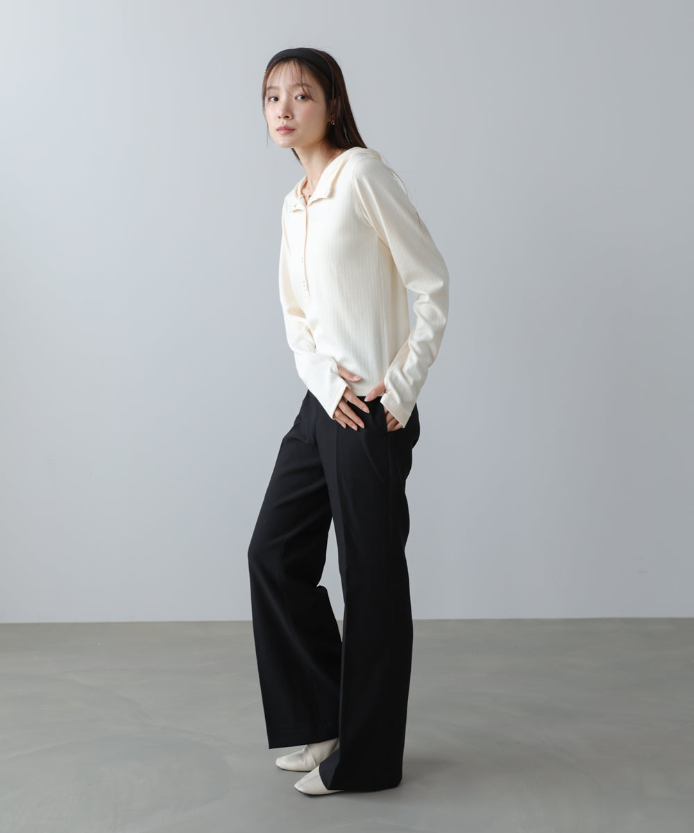 柔らかな肌触りと伸縮性があり、リラックスした着心地を叶えます。しなやかさと軽さを兼ね備えているので、デイリーに取り入れやすい素材感です。