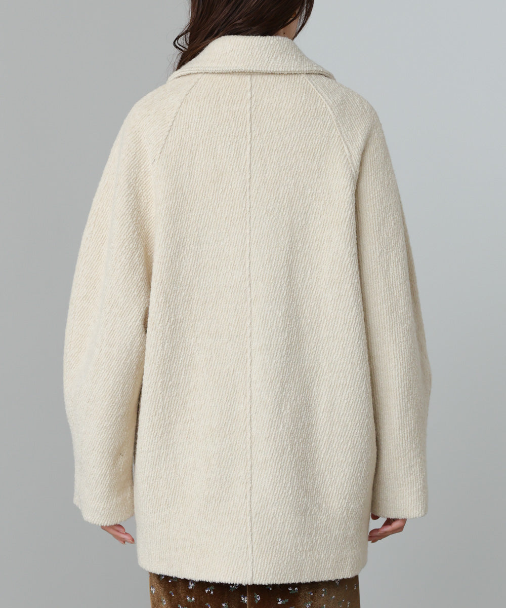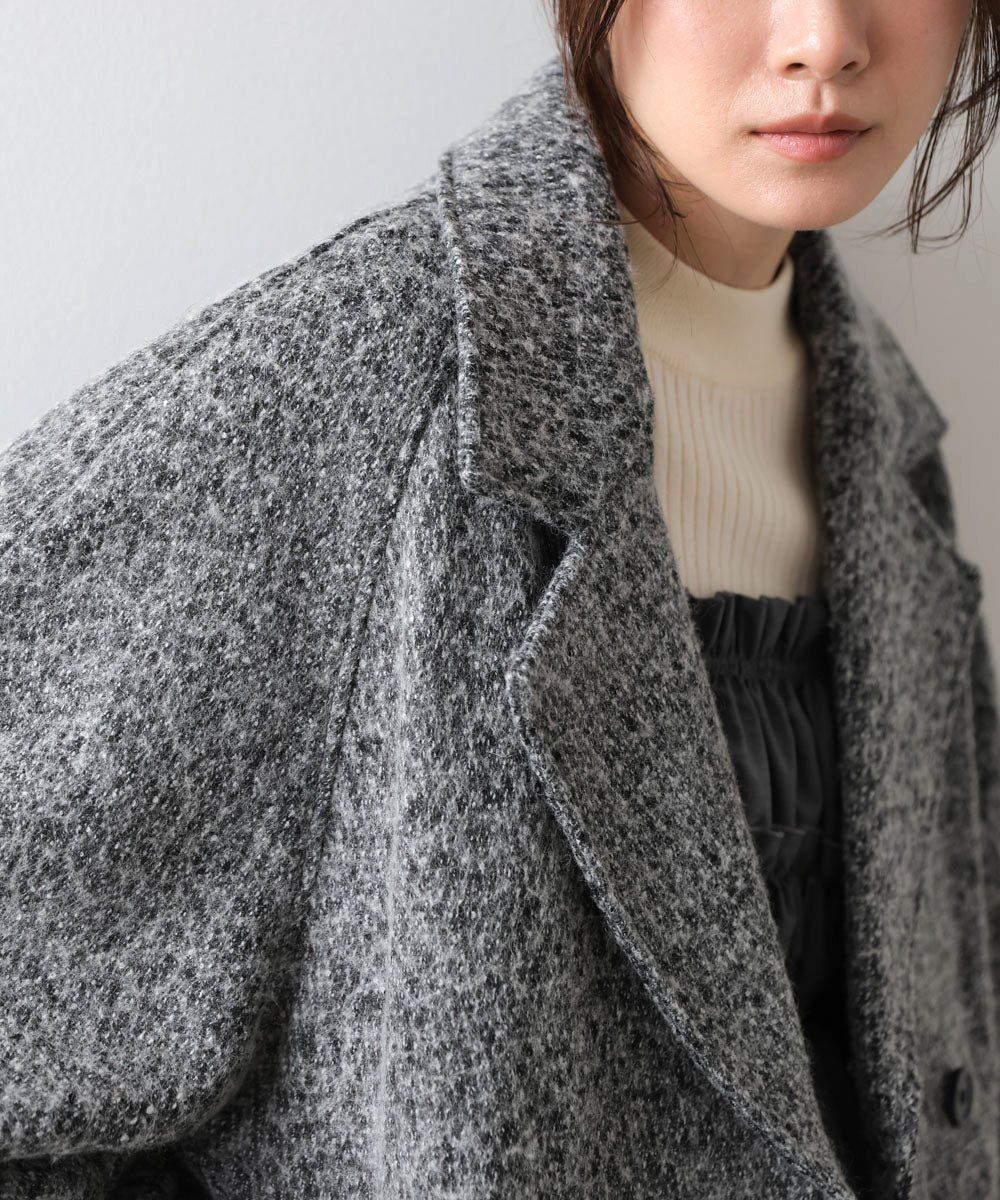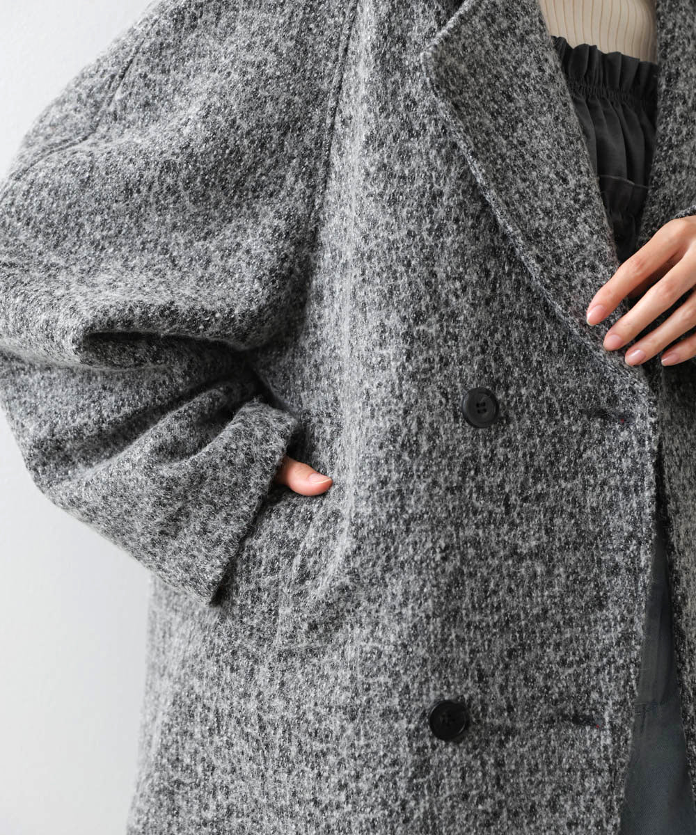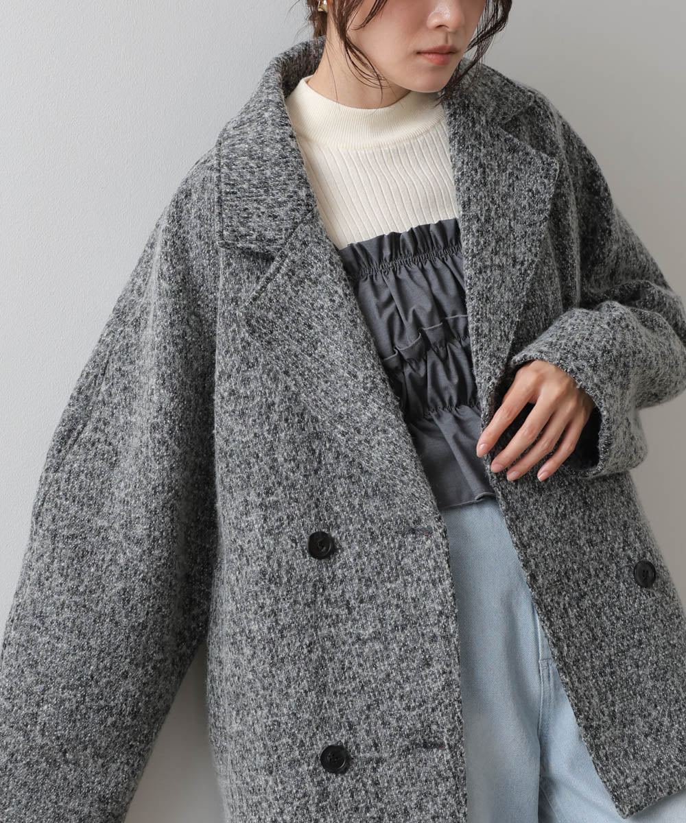 ゆったりとしたシルエットに、袖のデザインがアクセントになったハーフ丈コート。ざっくりと開いたVネックが顔まわりをすっきり見せ、女性らしい抜け感をプラスします。左右対称に並んだ4つのボタンがクラシカルな印象を引き立て、上品さと可愛らしさを両立。通勤にも休日のお出かけにも活躍する、秋冬の万能アウターです。