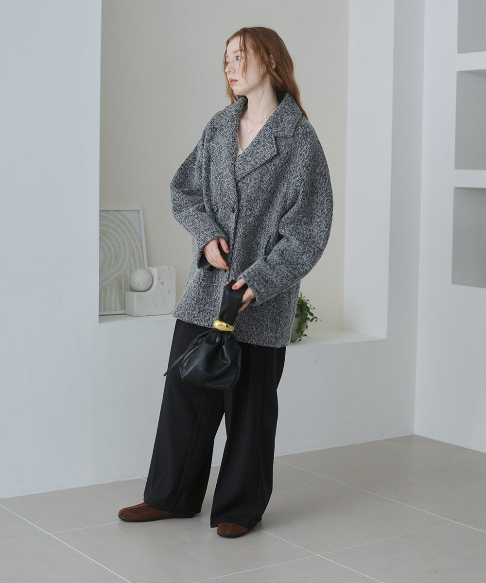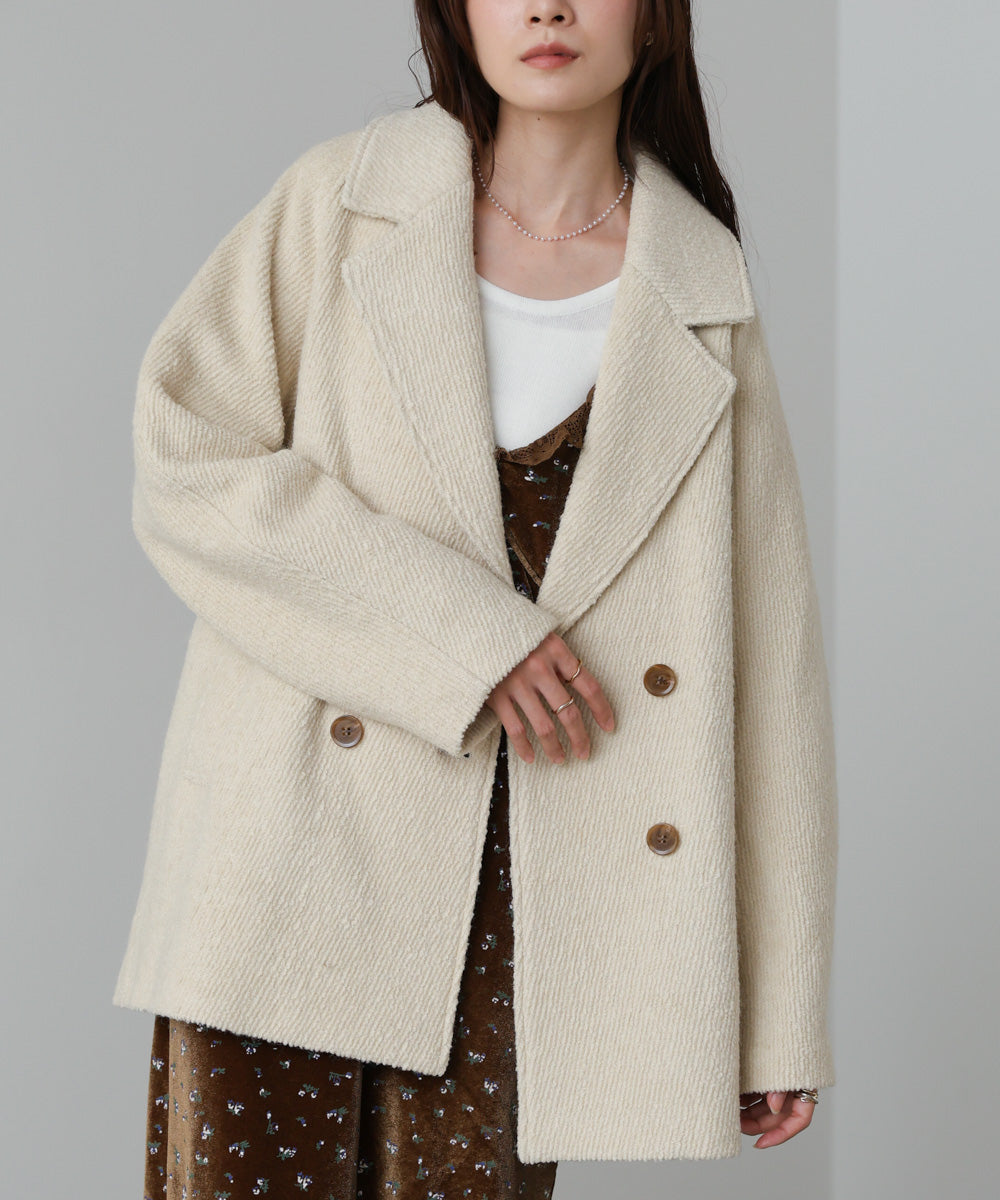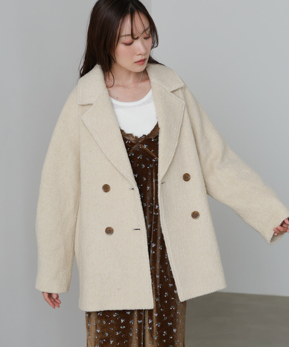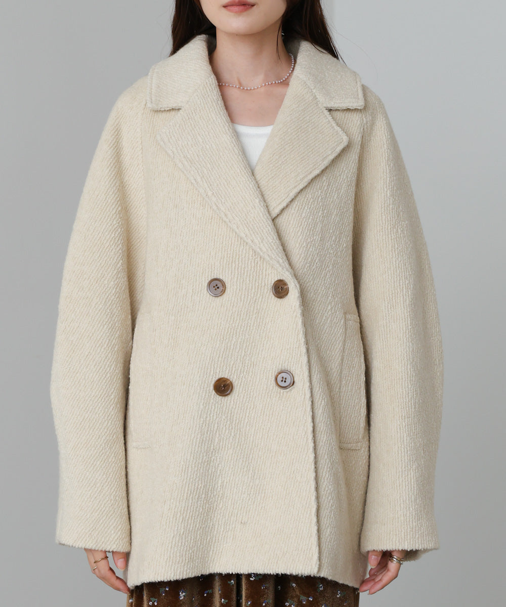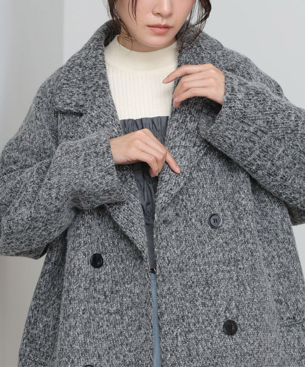 ゆったりとしたシルエットに、袖のデザインがアクセントになったハーフ丈コート。ざっくりと開いたVネックが顔まわりをすっきり見せ、女性らしい抜け感をプラスします。左右対称に並んだ4つのボタンがクラシカルな印象を引き立て、上品さと可愛らしさを両立。通勤にも休日のお出かけにも活躍する、秋冬の万能アウターです。