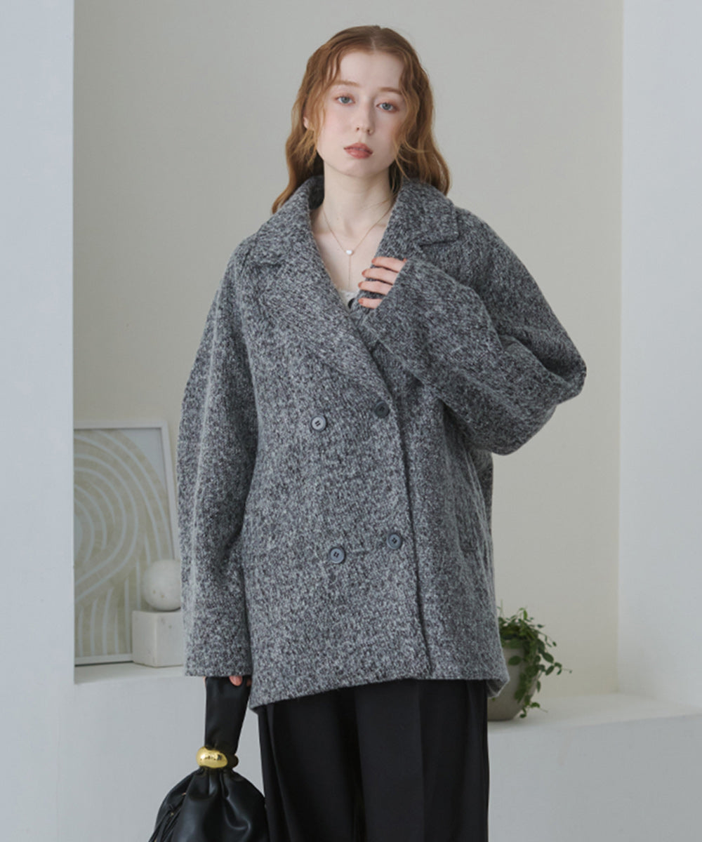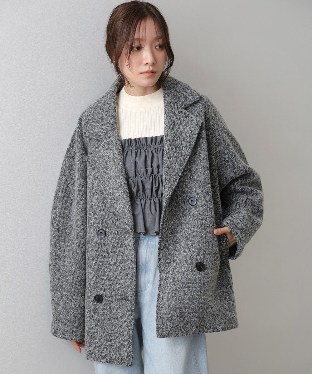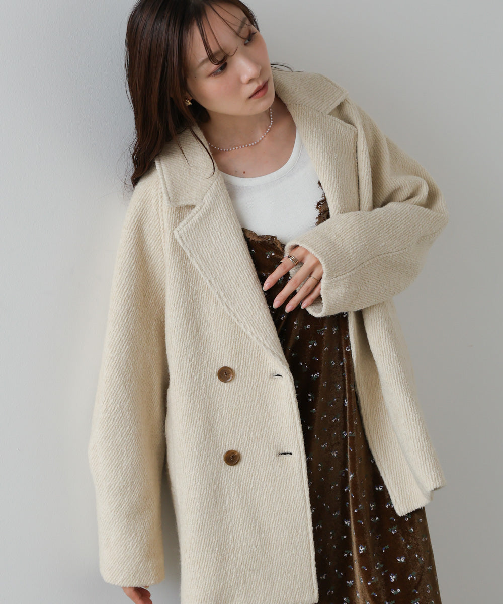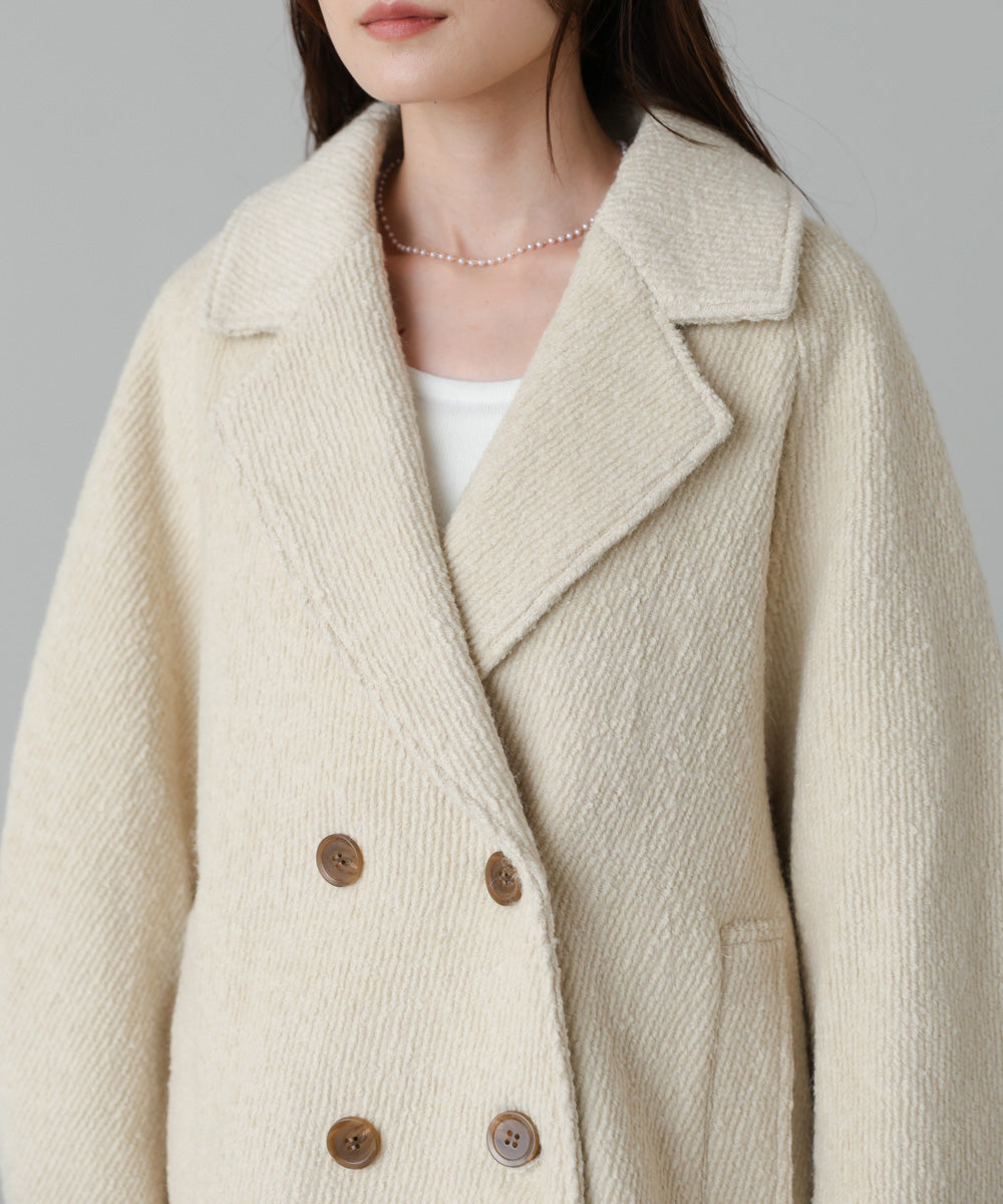 ゆったりとしたシルエットに、袖のデザインがアクセントになったハーフ丈コート。ざっくりと開いたVネックが顔まわりをすっきり見せ、女性らしい抜け感をプラスします。左右対称に並んだ4つのボタンがクラシカルな印象を引き立て、上品さと可愛らしさを両立。通勤にも休日のお出かけにも活躍する、秋冬の万能アウターです。