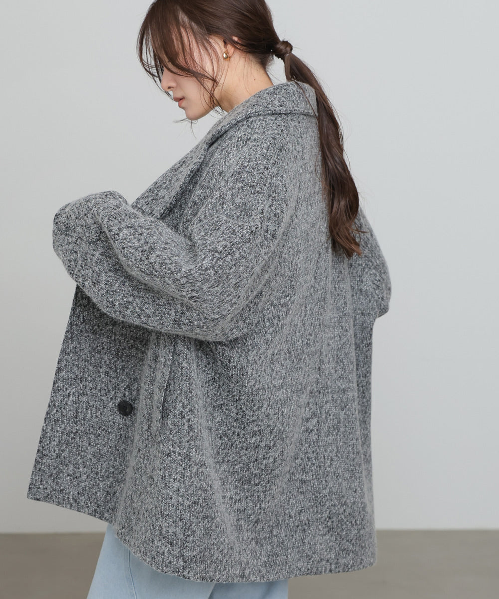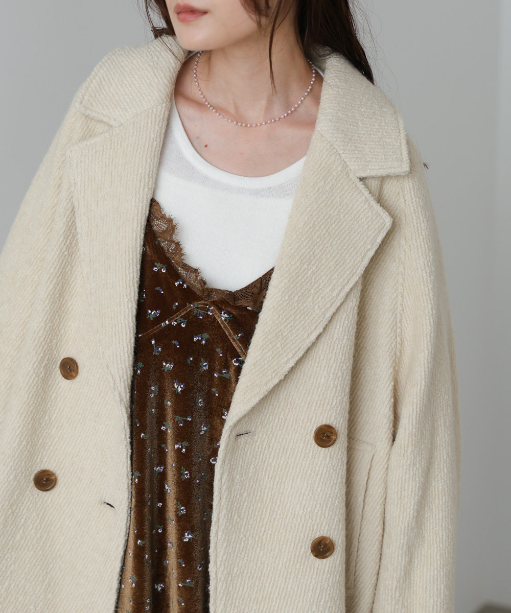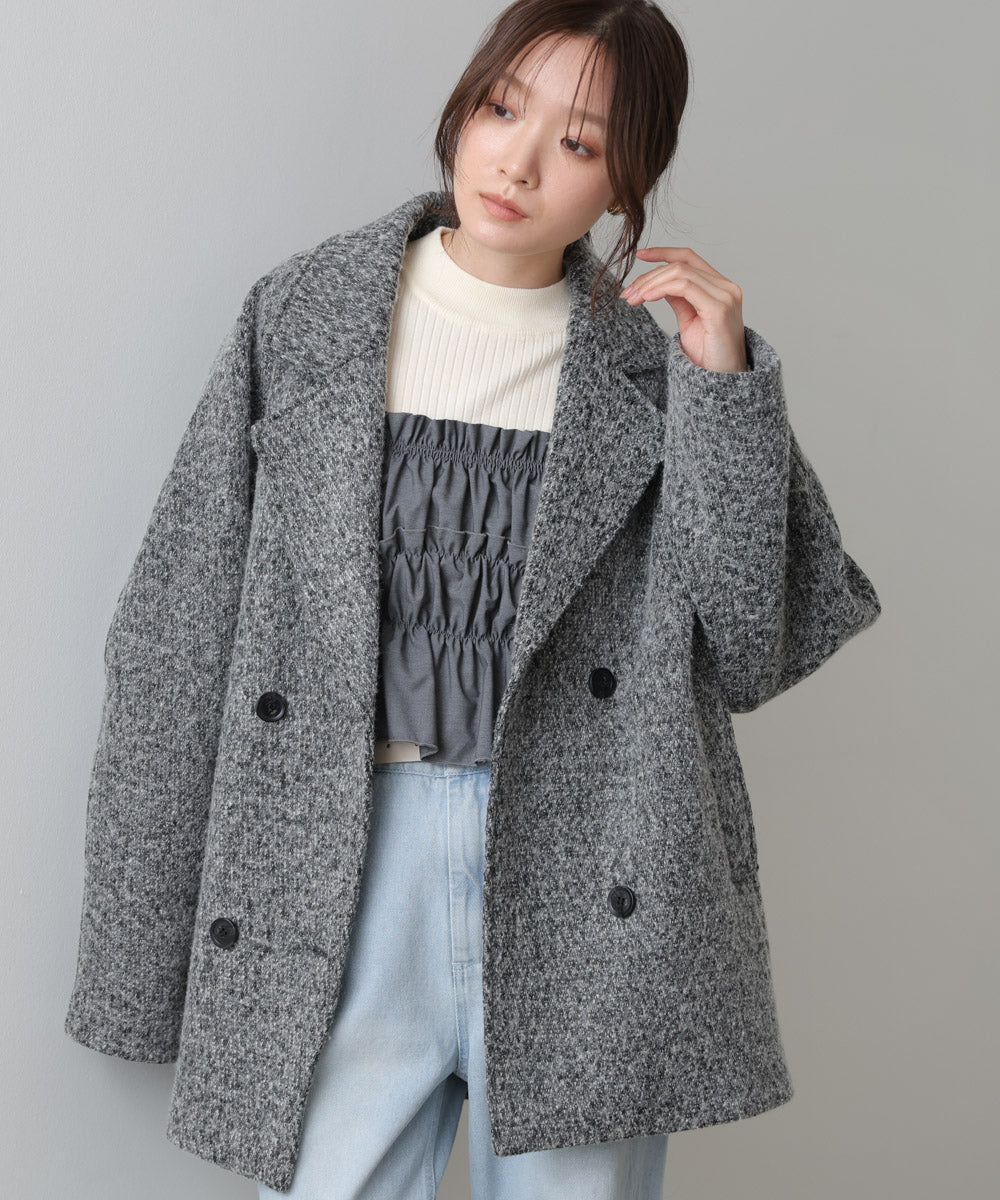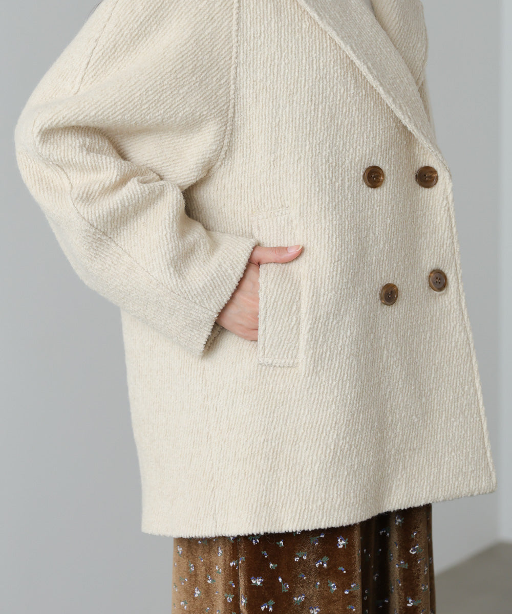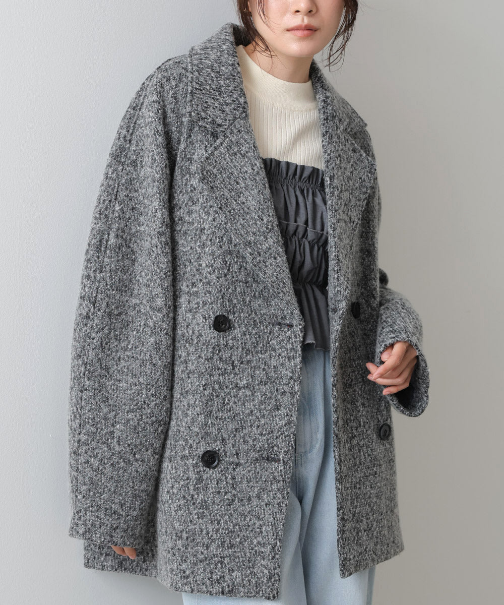 ゆったりとしたシルエットに、袖のデザインがアクセントになったハーフ丈コート。ざっくりと開いたVネックが顔まわりをすっきり見せ、女性らしい抜け感をプラスします。左右対称に並んだ4つのボタンがクラシカルな印象を引き立て、上品さと可愛らしさを両立。通勤にも休日のお出かけにも活躍する、秋冬の万能アウターです。