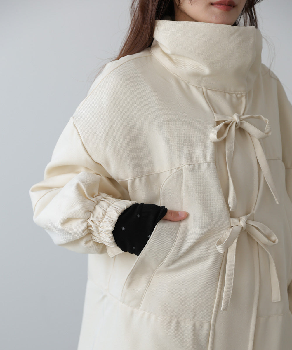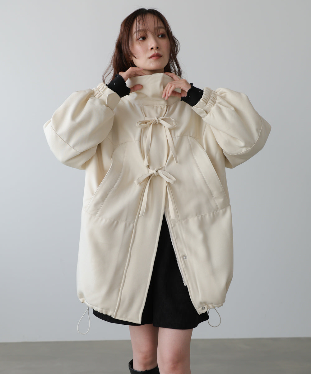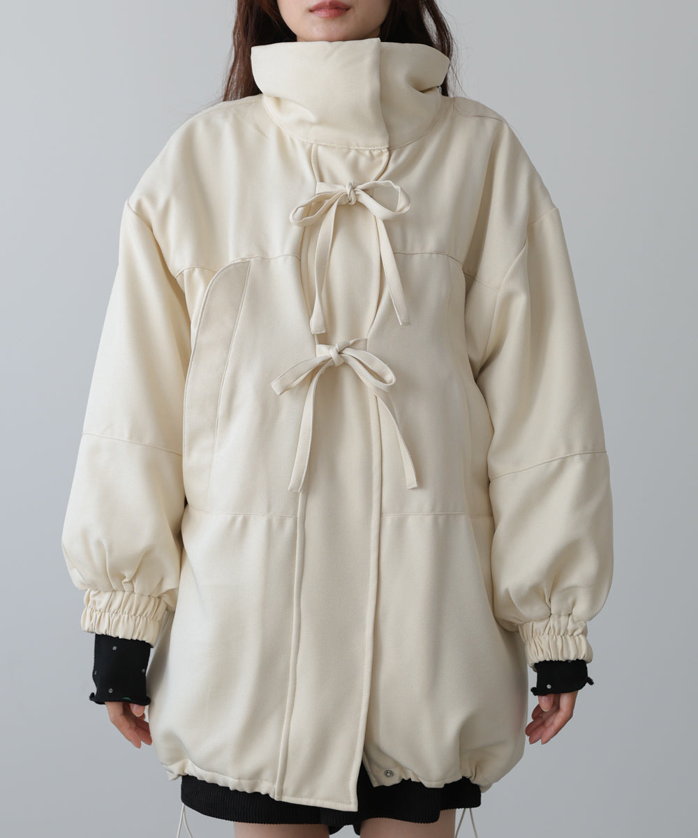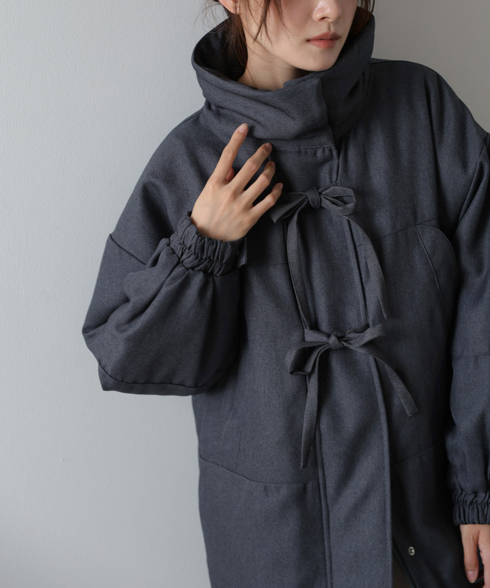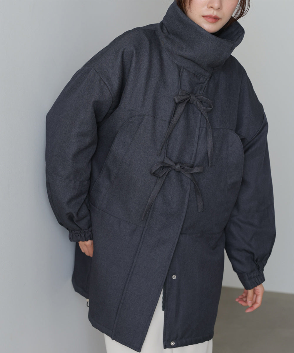 大きめのフロントリボンが目を惹く中綿モンスターコート。首元までしっかり包み込むハイネック仕様で、防寒性と可愛らしさを両立した1枚です。リボンの裏にはジップとボタンが隠れており、見た目はフェミニンながら機能面も抜群。ふっくらとしたシルエットが季節感を引き立て、冬の街歩きにも映えるアウターです。