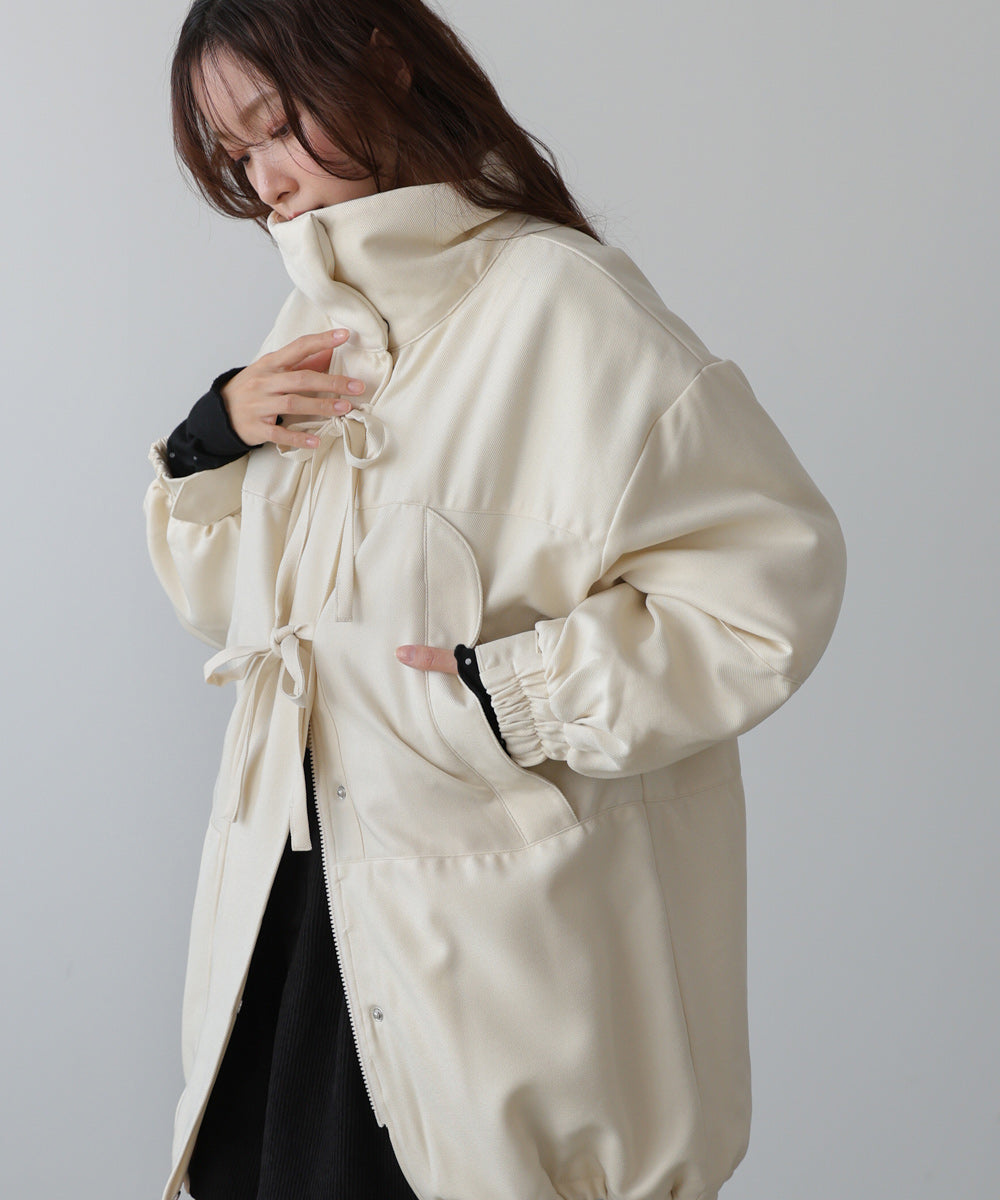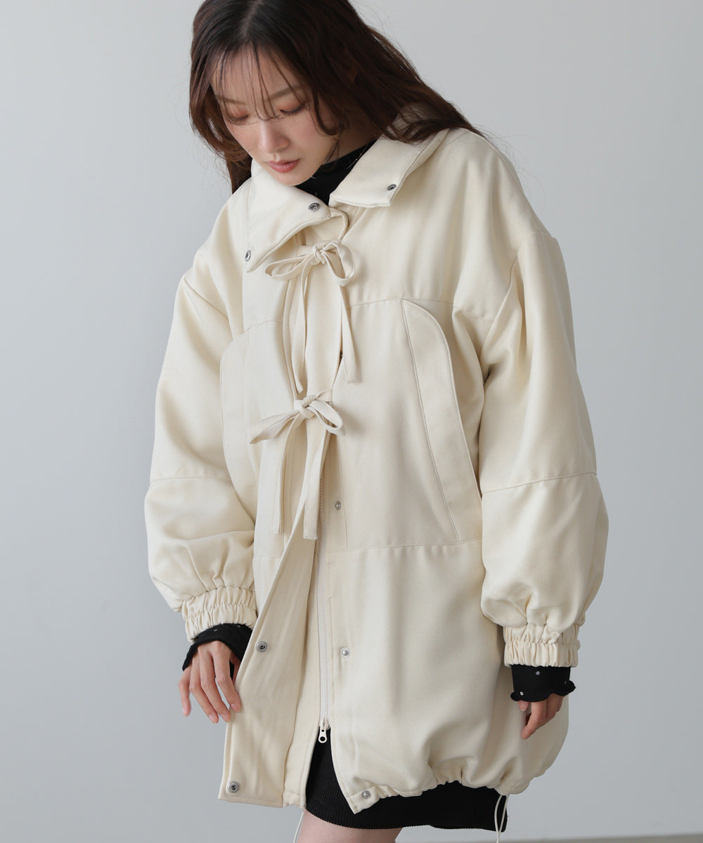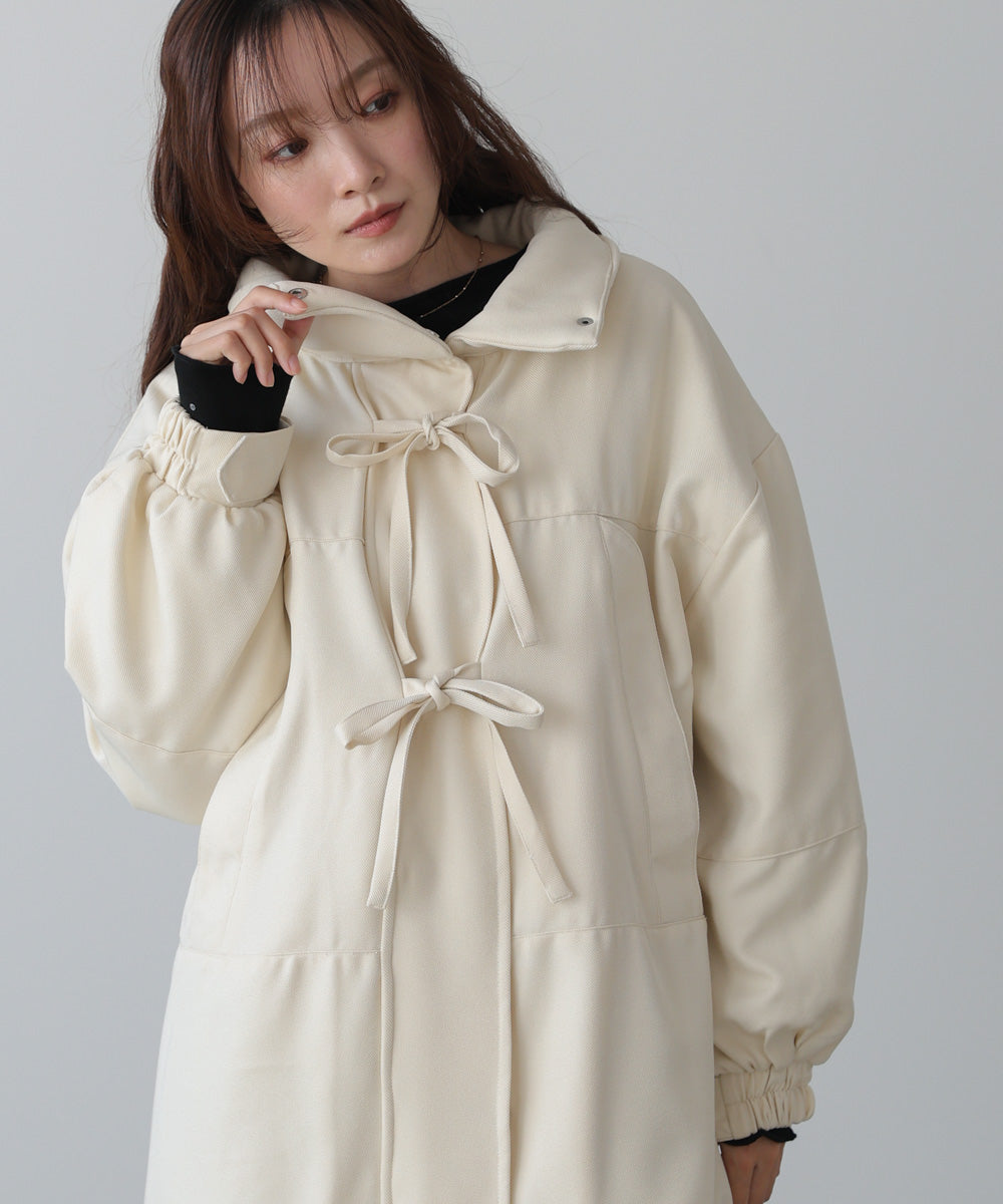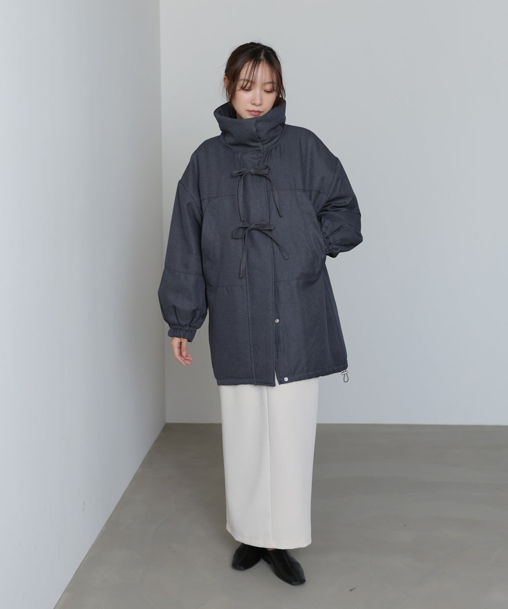 大きめのフロントリボンが目を惹く中綿モンスターコート。首元までしっかり包み込むハイネック仕様で、防寒性と可愛らしさを両立した1枚です。リボンの裏にはジップとボタンが隠れており、見た目はフェミニンながら機能面も抜群。ふっくらとしたシルエットが季節感を引き立て、冬の街歩きにも映えるアウターです。