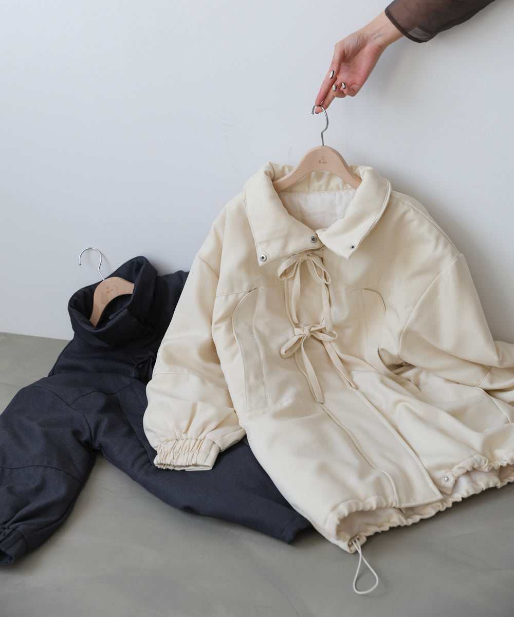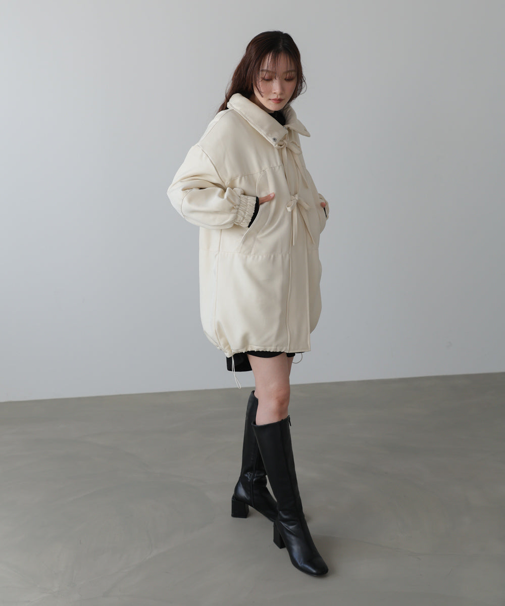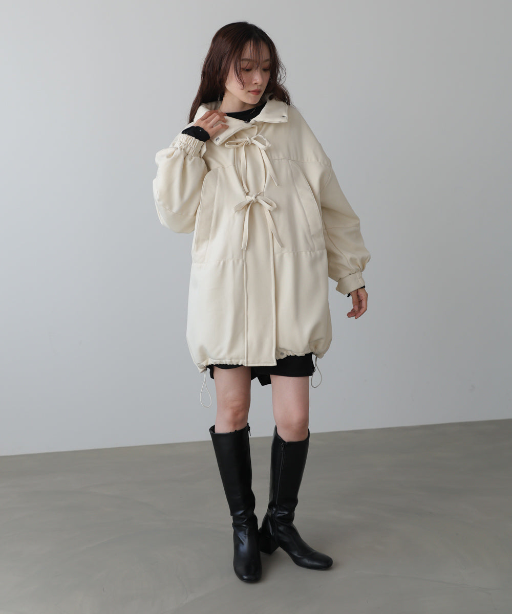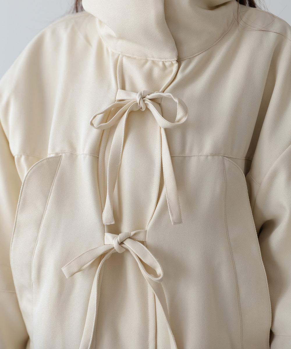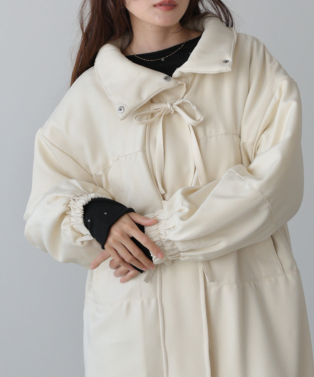 大きめのフロントリボンが目を惹く中綿モンスターコート。首元までしっかり包み込むハイネック仕様で、防寒性と可愛らしさを両立した1枚です。リボンの裏にはジップとボタンが隠れており、見た目はフェミニンながら機能面も抜群。ふっくらとしたシルエットが季節感を引き立て、冬の街歩きにも映えるアウターです。