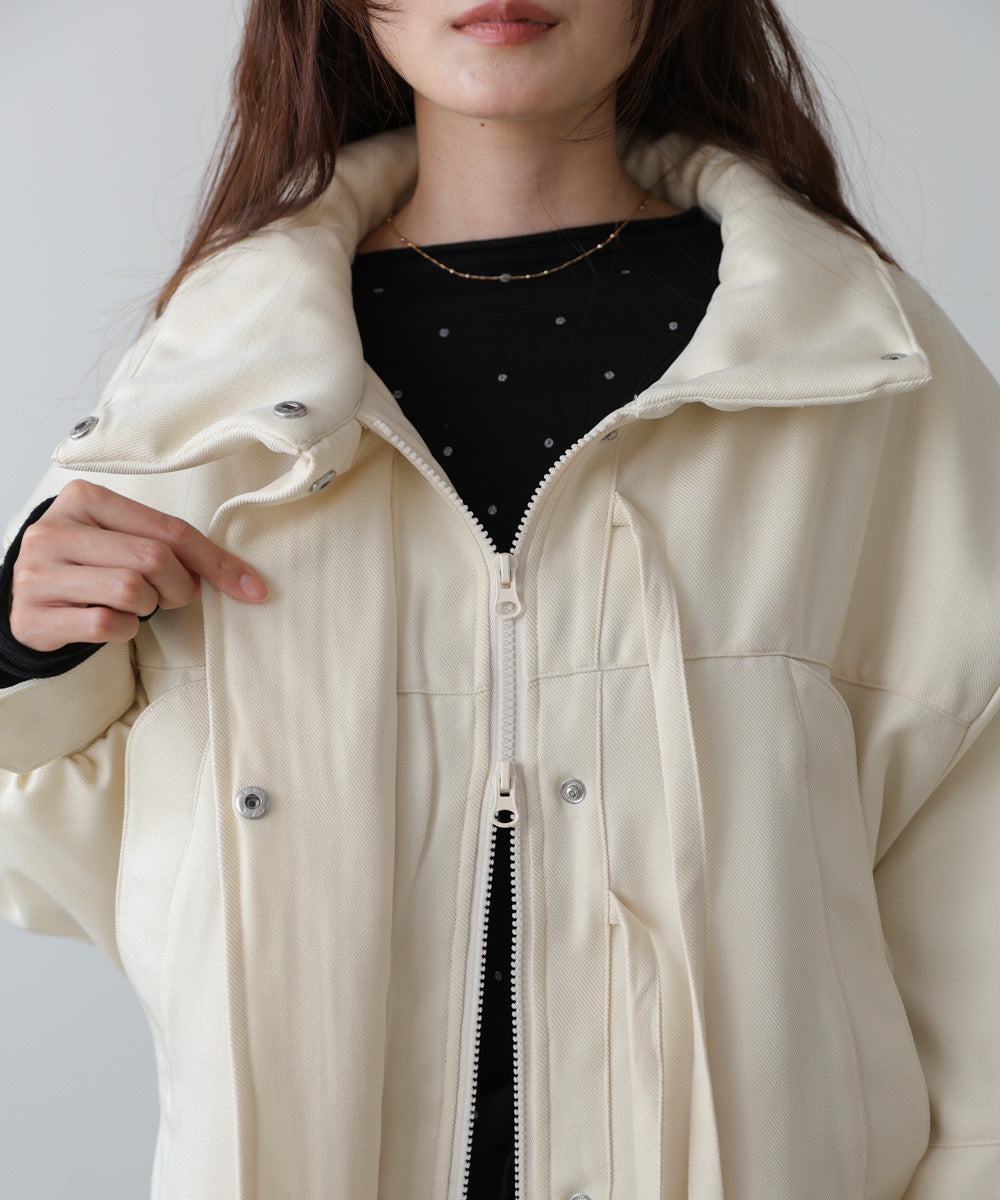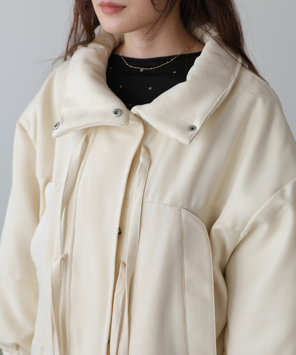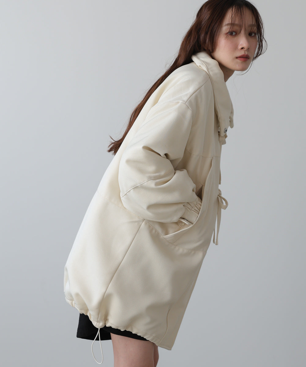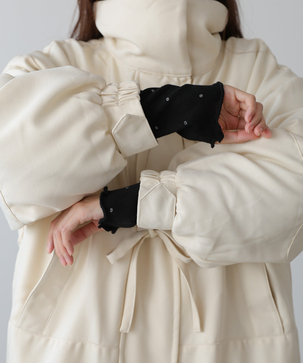 大きめのフロントリボンが目を惹く中綿モンスターコート。首元までしっかり包み込むハイネック仕様で、防寒性と可愛らしさを両立した1枚です。リボンの裏にはジップとボタンが隠れており、見た目はフェミニンながら機能面も抜群。ふっくらとしたシルエットが季節感を引き立て、冬の街歩きにも映えるアウターです。
