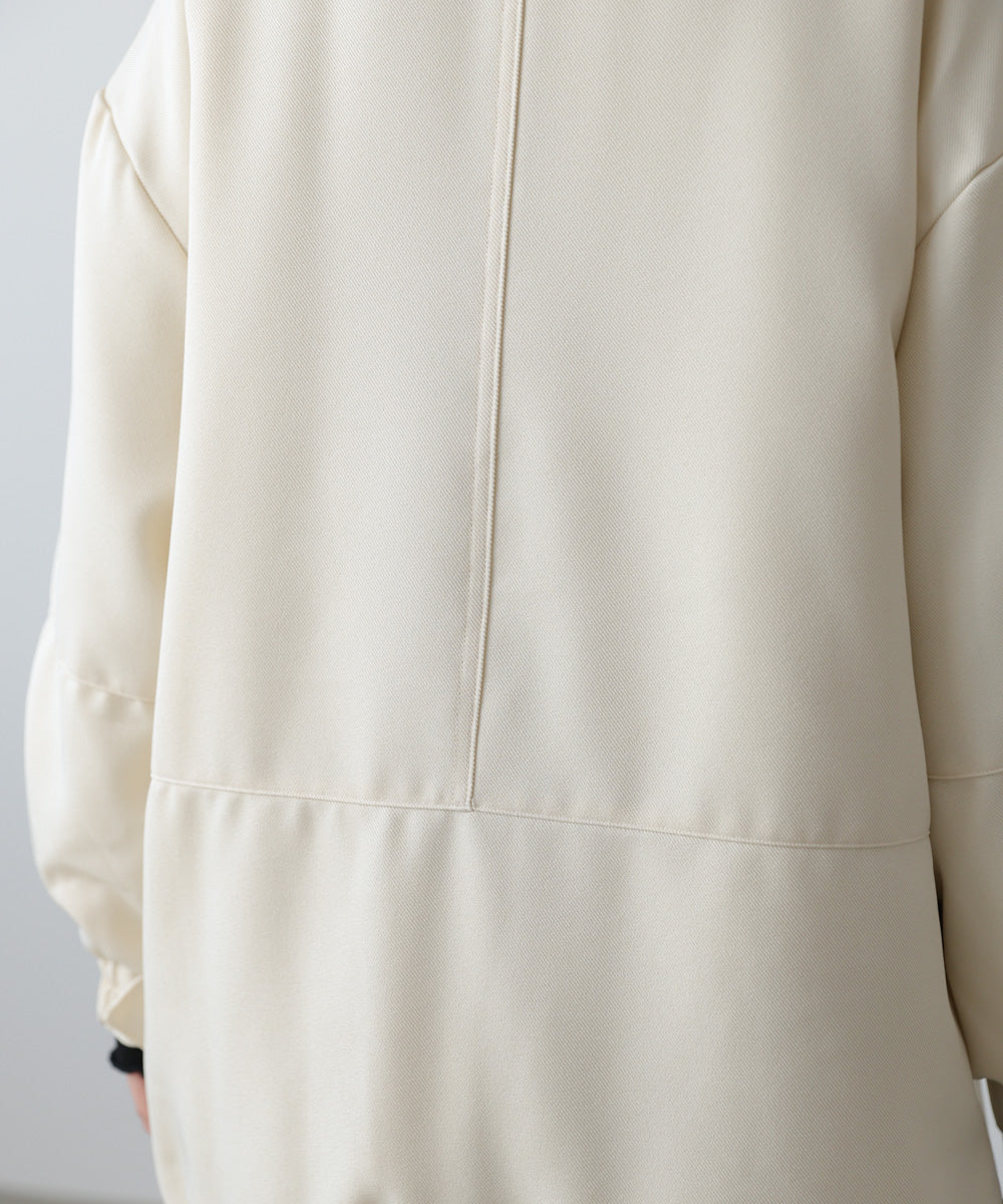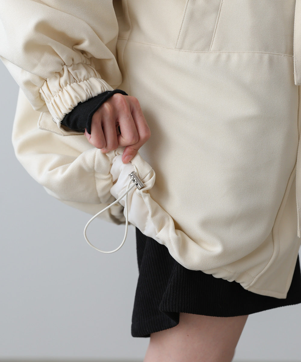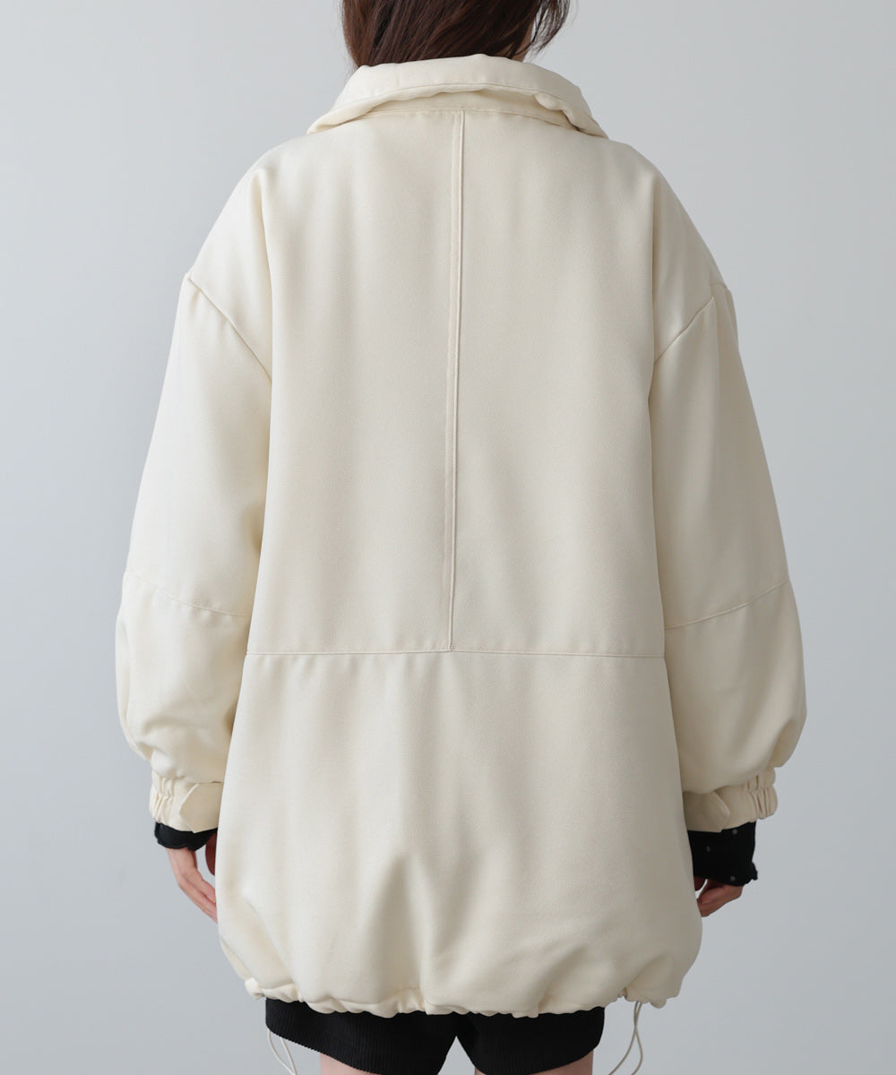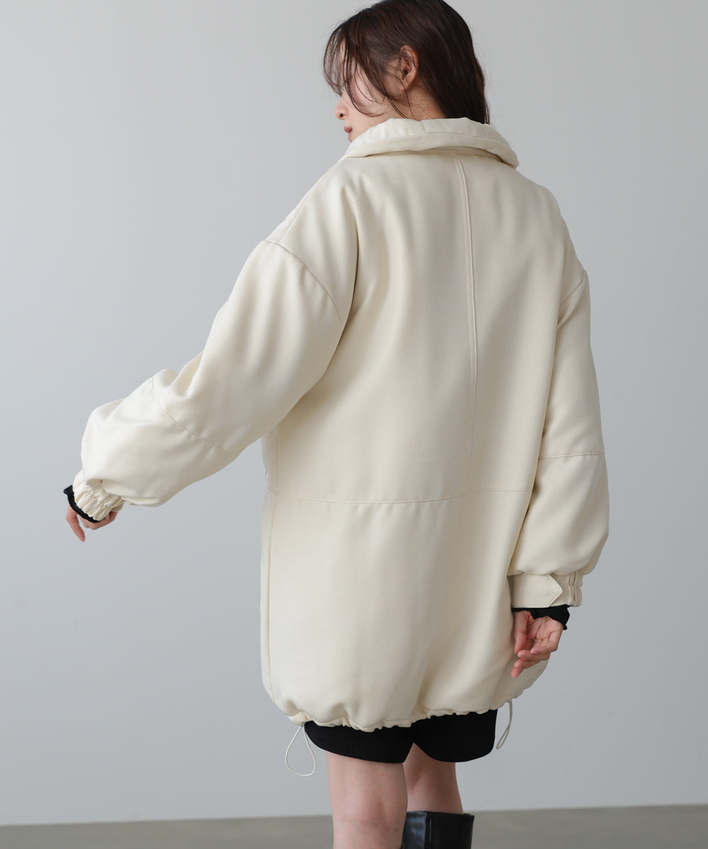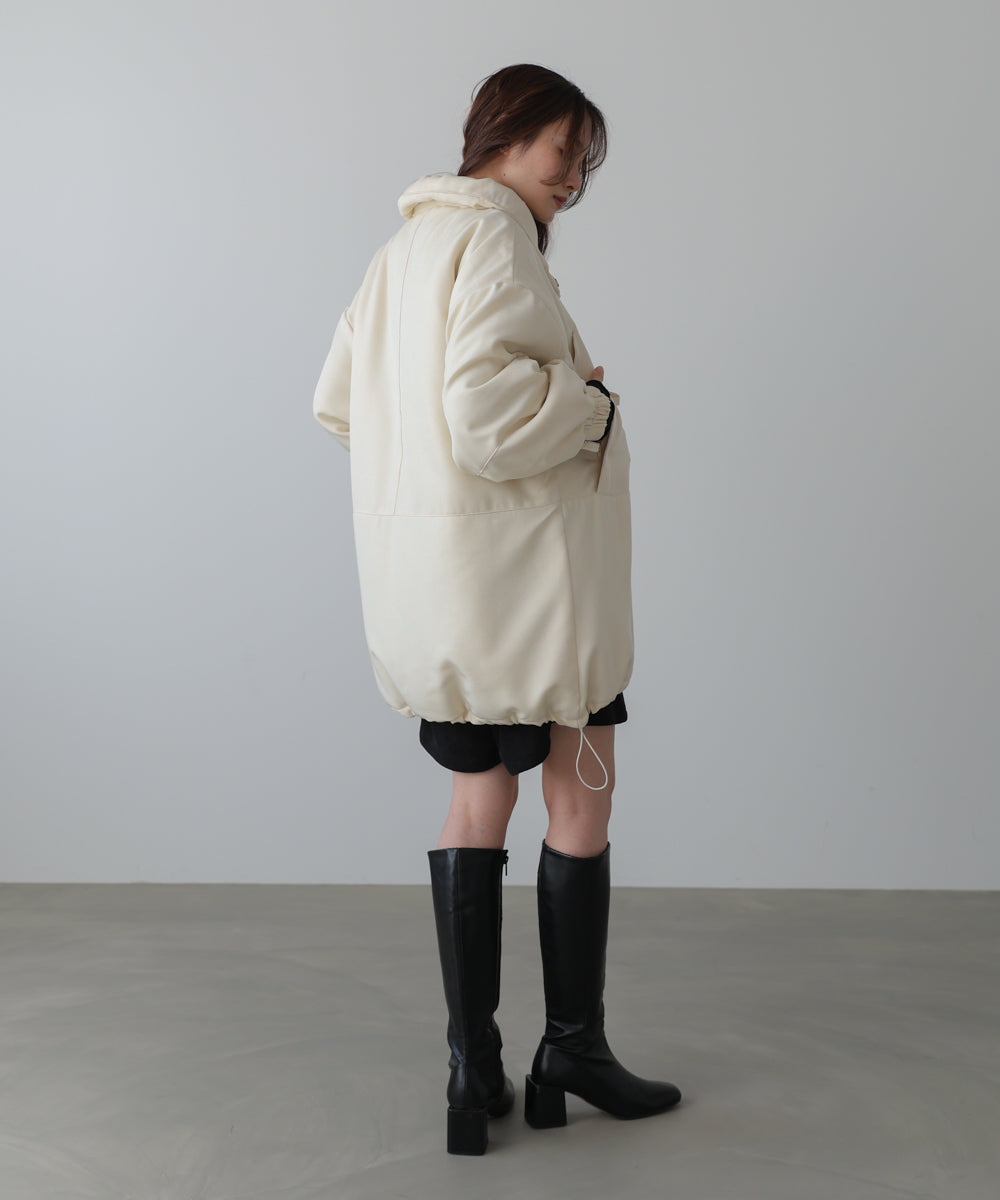 大きめのフロントリボンが目を惹く中綿モンスターコート。首元までしっかり包み込むハイネック仕様で、防寒性と可愛らしさを両立した1枚です。リボンの裏にはジップとボタンが隠れており、見た目はフェミニンながら機能面も抜群。ふっくらとしたシルエットが季節感を引き立て、冬の街歩きにも映えるアウターです。