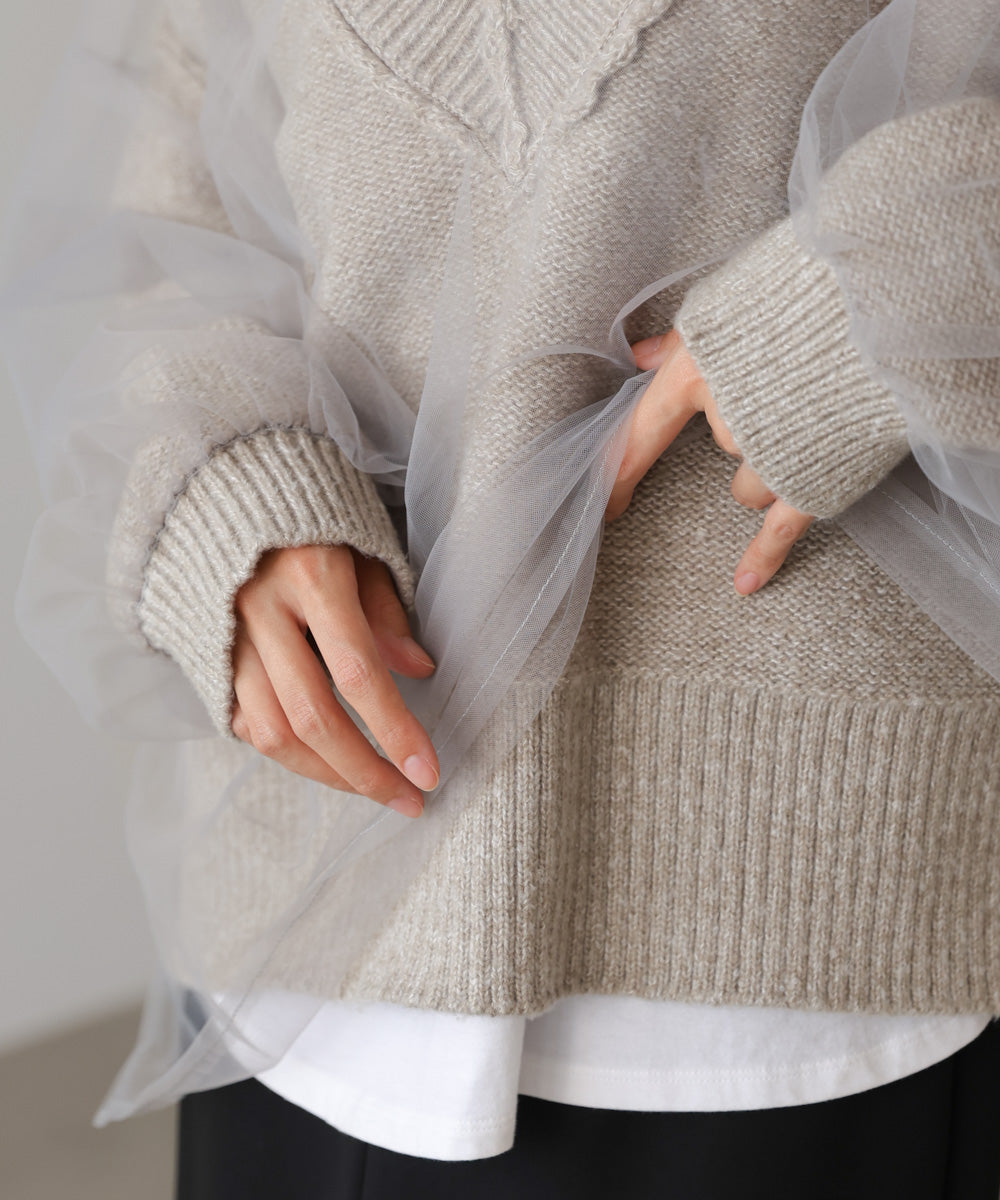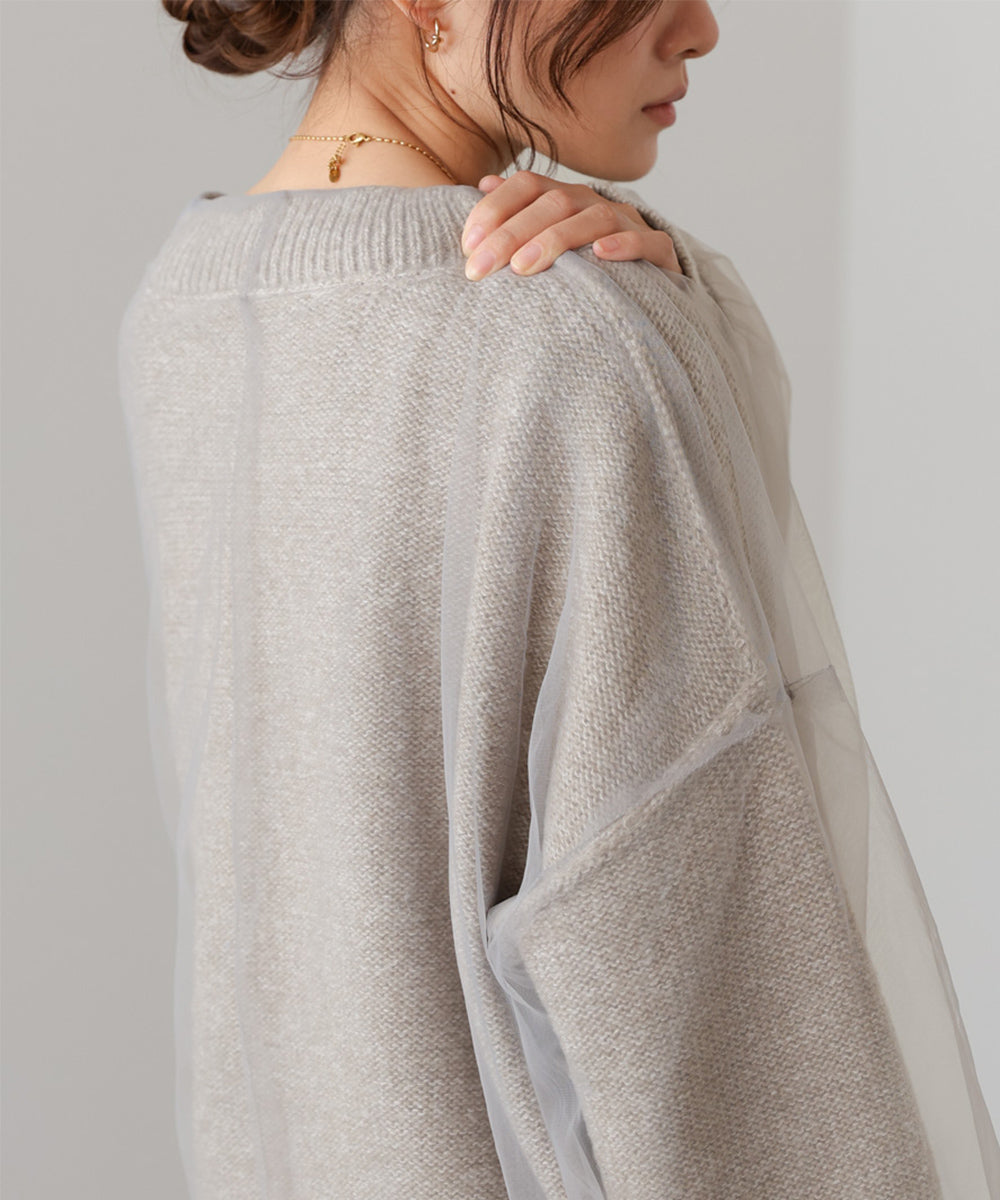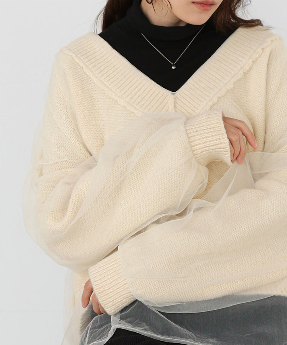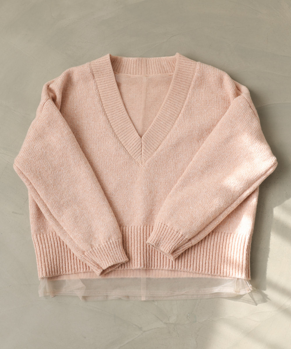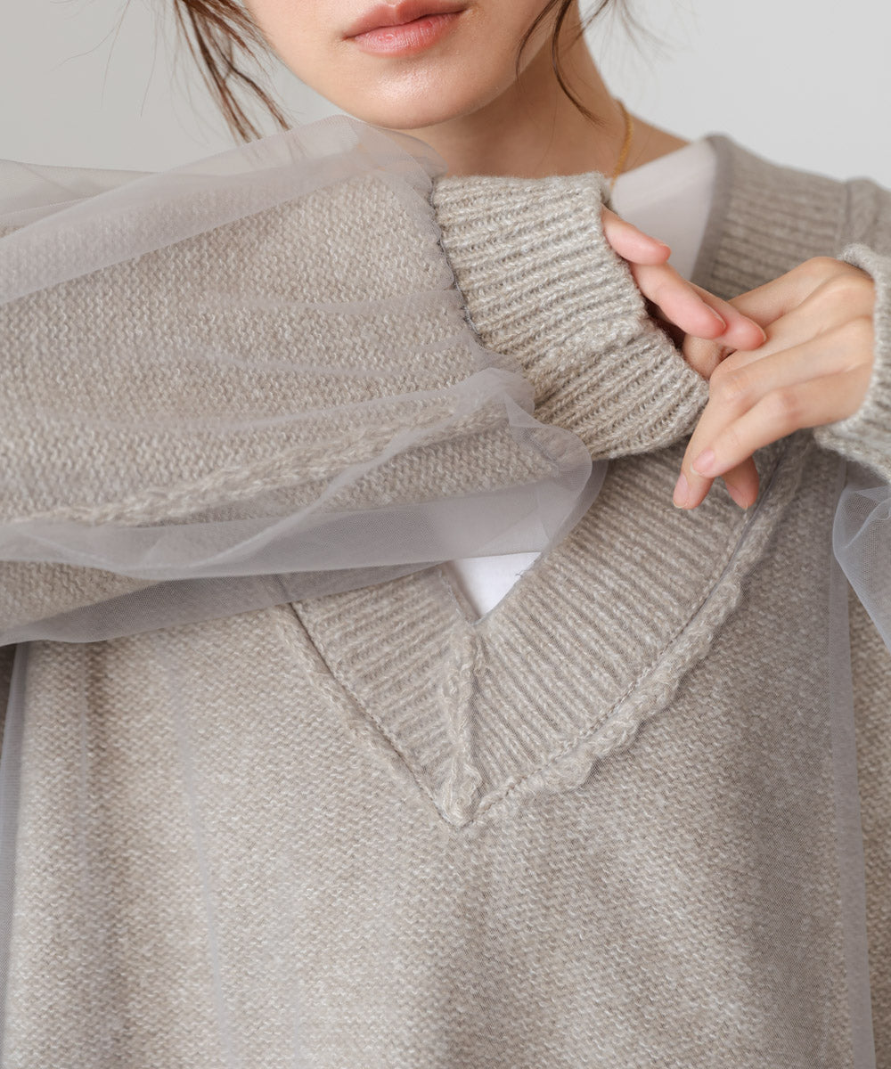 ふんわりチュールをレイヤードした、気分に合わせて表情を変えられるリバーシブルニット。前後で“チュールあり”と“シンプルニット”を楽しめるデザインで、1枚で着こなしの幅がぐっと広がります。デコルテをすっきり見せる深めのVネックは、インナー合わせが映えるシルエット。タートルやシャツなど、冬の重ね着を上品に見せてくれるバランス感が魅力です。アイボリー・ライトグレー・ピンクの柔らかい3色展開で、女性らしさと抜け感を両立した一着に仕上がっています。