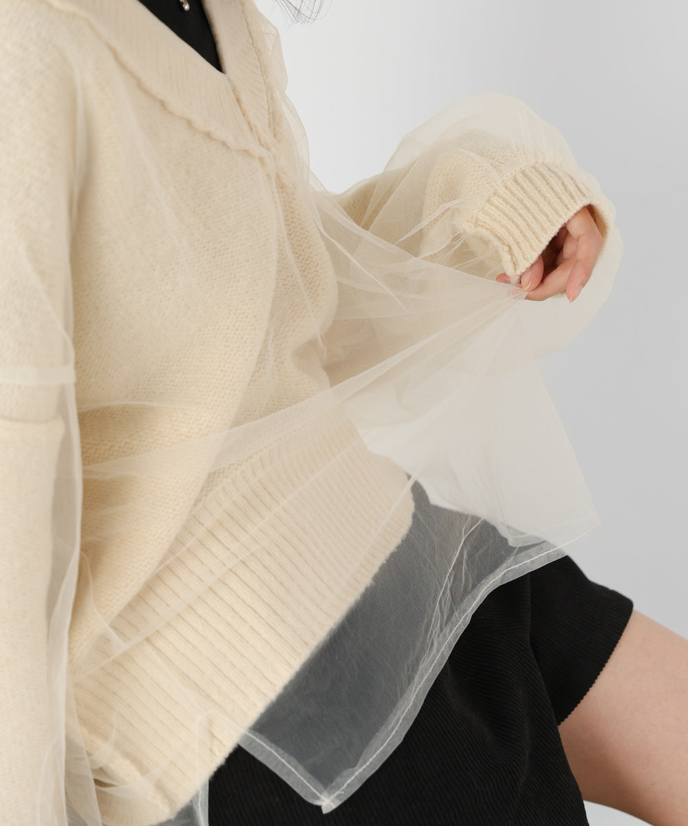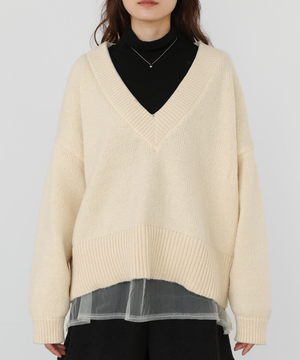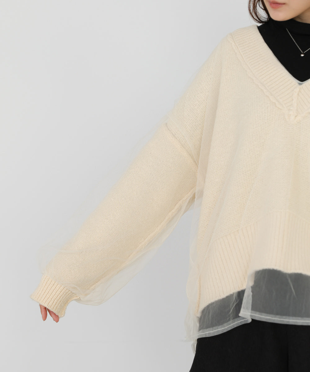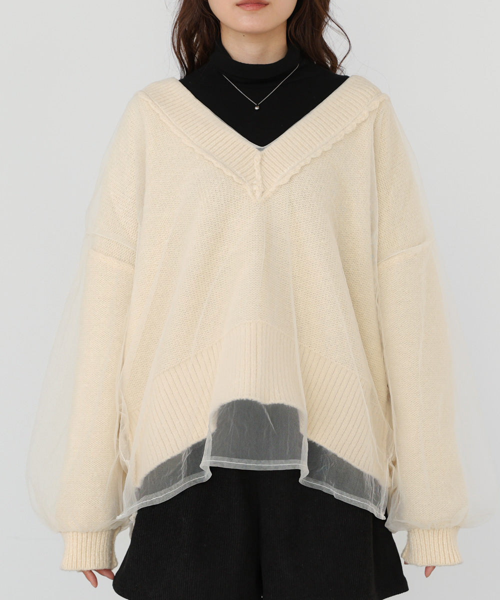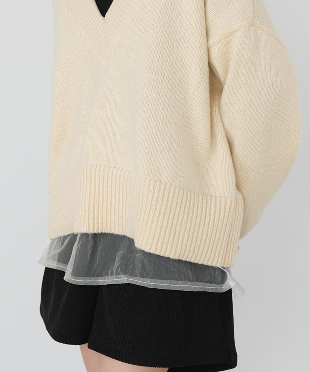 ふんわりチュールをレイヤードした、気分に合わせて表情を変えられるリバーシブルニット。前後で“チュールあり”と“シンプルニット”を楽しめるデザインで、1枚で着こなしの幅がぐっと広がります。デコルテをすっきり見せる深めのVネックは、インナー合わせが映えるシルエット。タートルやシャツなど、冬の重ね着を上品に見せてくれるバランス感が魅力です。アイボリー・ライトグレー・ピンクの柔らかい3色展開で、女性らしさと抜け感を両立した一着に仕上がっています。