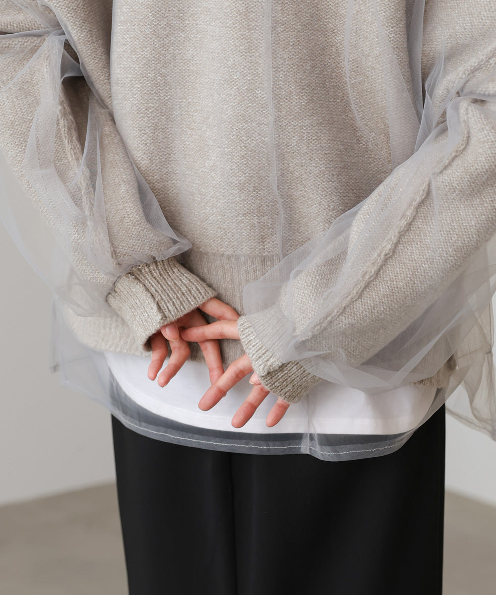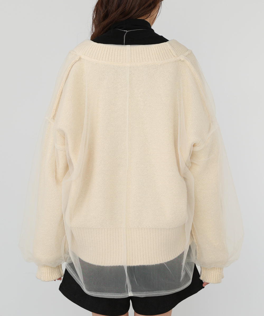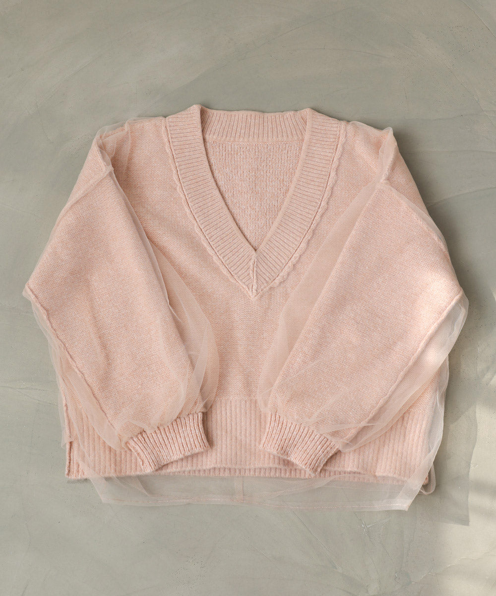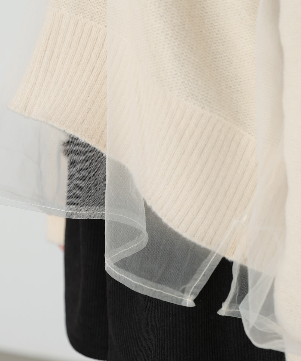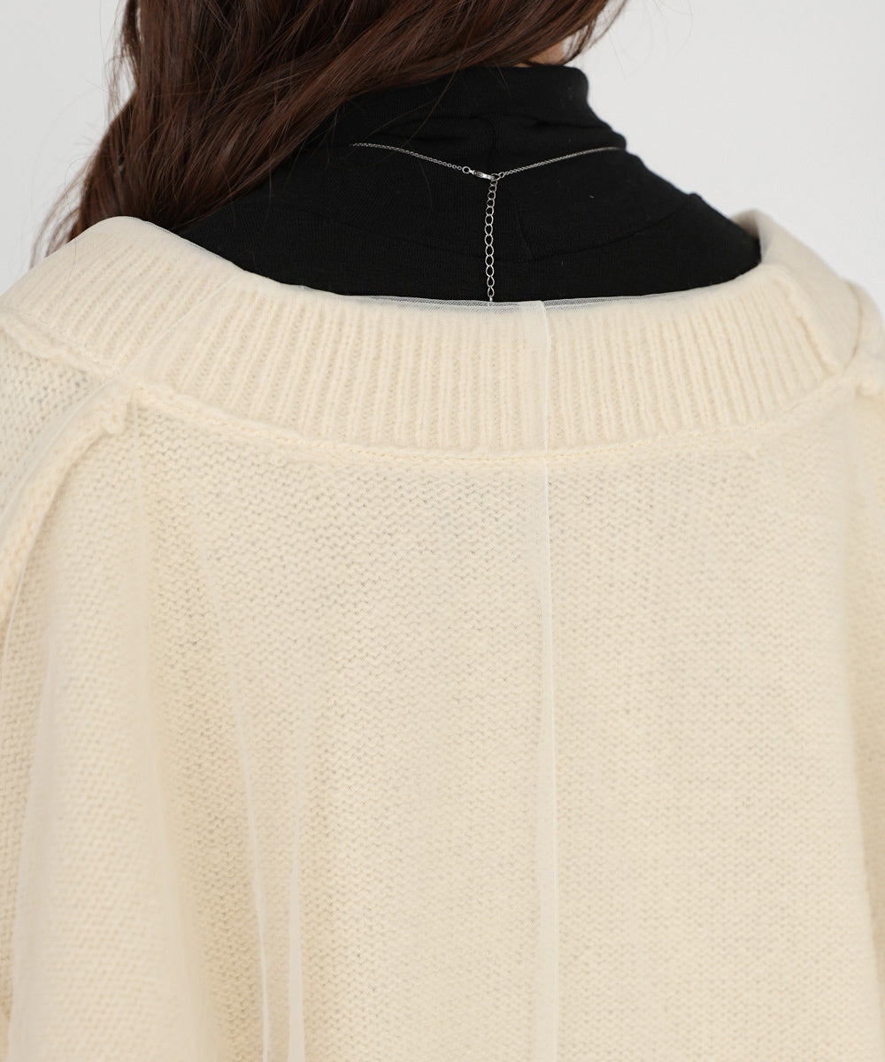 ふんわりチュールをレイヤードした、気分に合わせて表情を変えられるリバーシブルニット。前後で“チュールあり”と“シンプルニット”を楽しめるデザインで、1枚で着こなしの幅がぐっと広がります。デコルテをすっきり見せる深めのVネックは、インナー合わせが映えるシルエット。タートルやシャツなど、冬の重ね着を上品に見せてくれるバランス感が魅力です。アイボリー・ライトグレー・ピンクの柔らかい3色展開で、女性らしさと抜け感を両立した一着に仕上がっています。