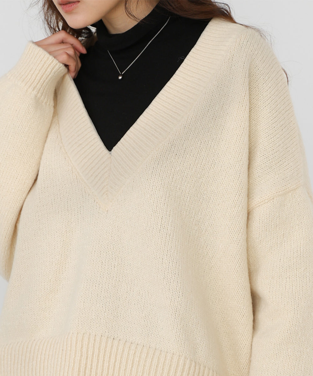 深Vネック×タートルの王道レイヤードで、オフィスでも好印象なきちんとコーデが仕上がります。デニムやスカートなど基本的になんにでも合うので、お持ちのボトムスと幅広く合わせていただけます。