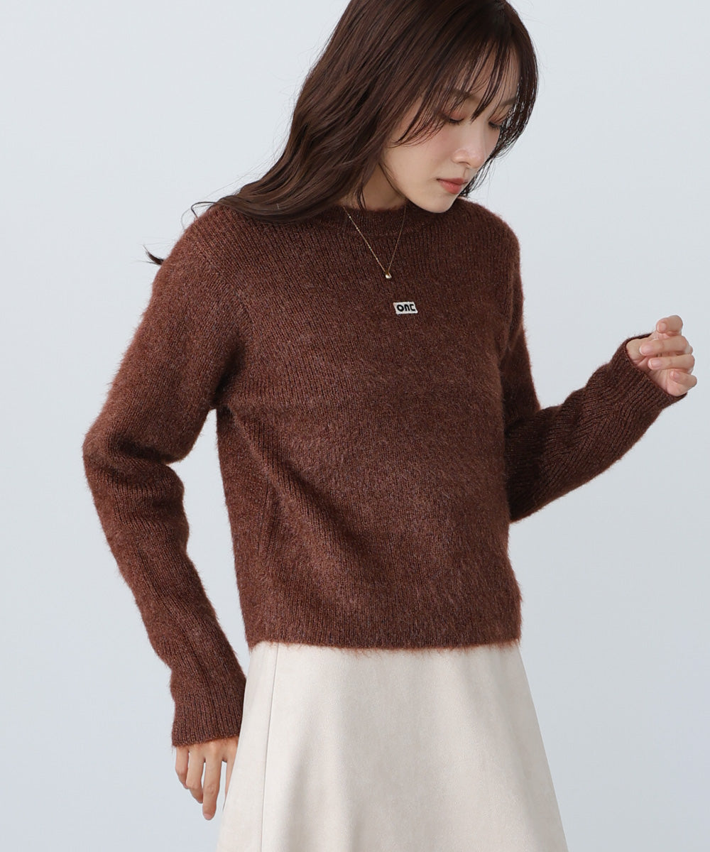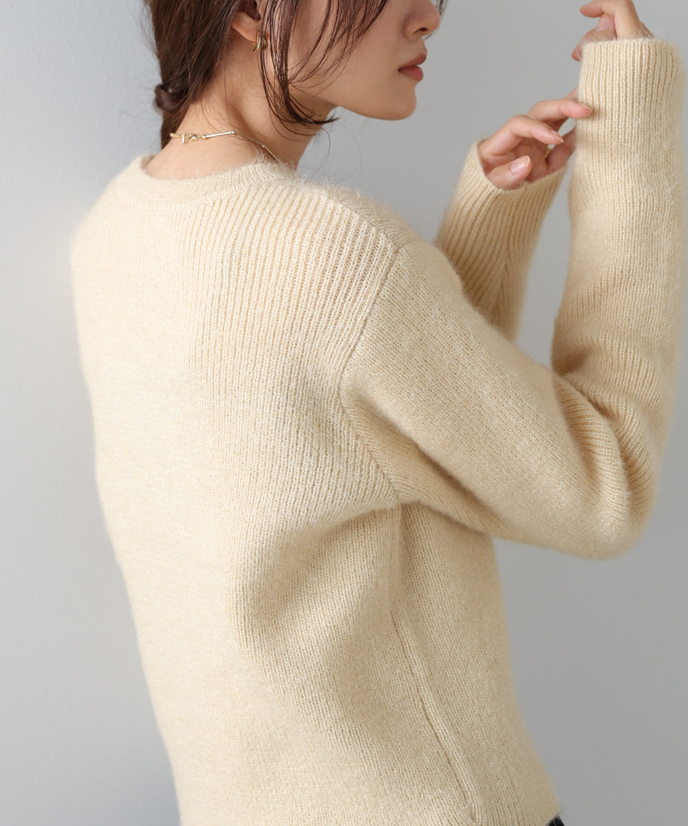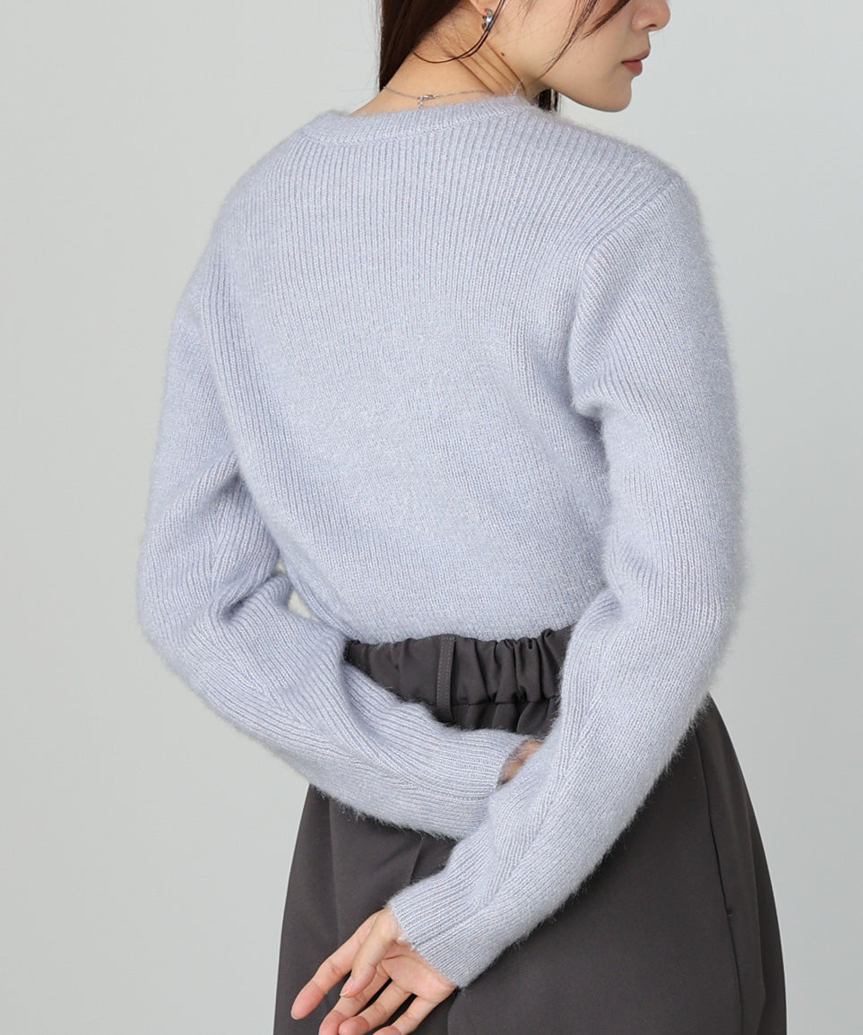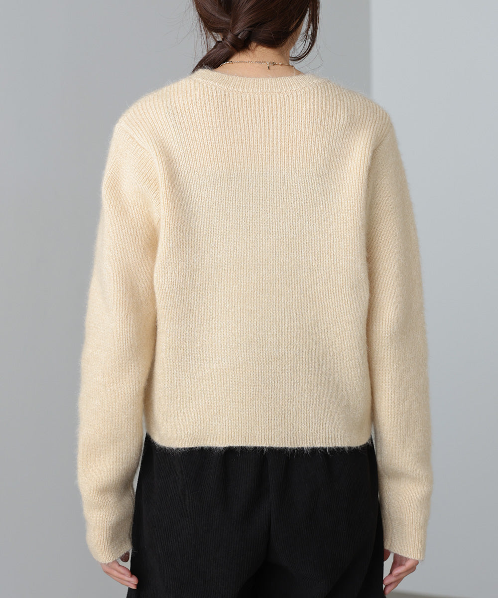ふわっとしたシャギーの質感に、さりげないラメ感が映えるシャイニーニット。光の角度でほのかにきらめく素材が、顔まわりを明るく見せてくれます。短めの丈感でどんなボトムにもバランスよく合わせやすく、大人の抜け感と華やかさを両立した映えニットです。