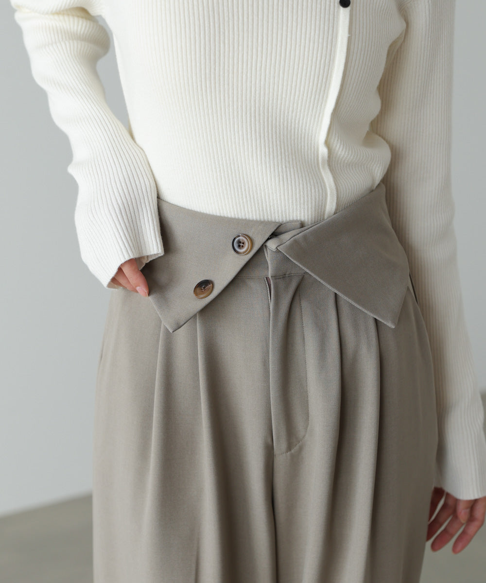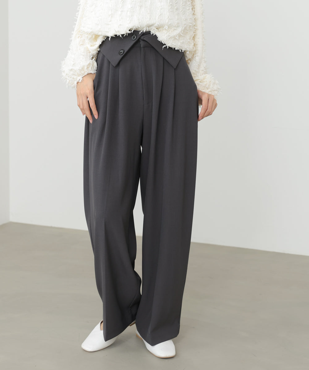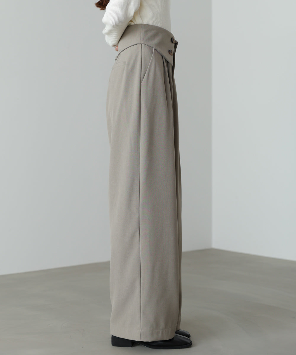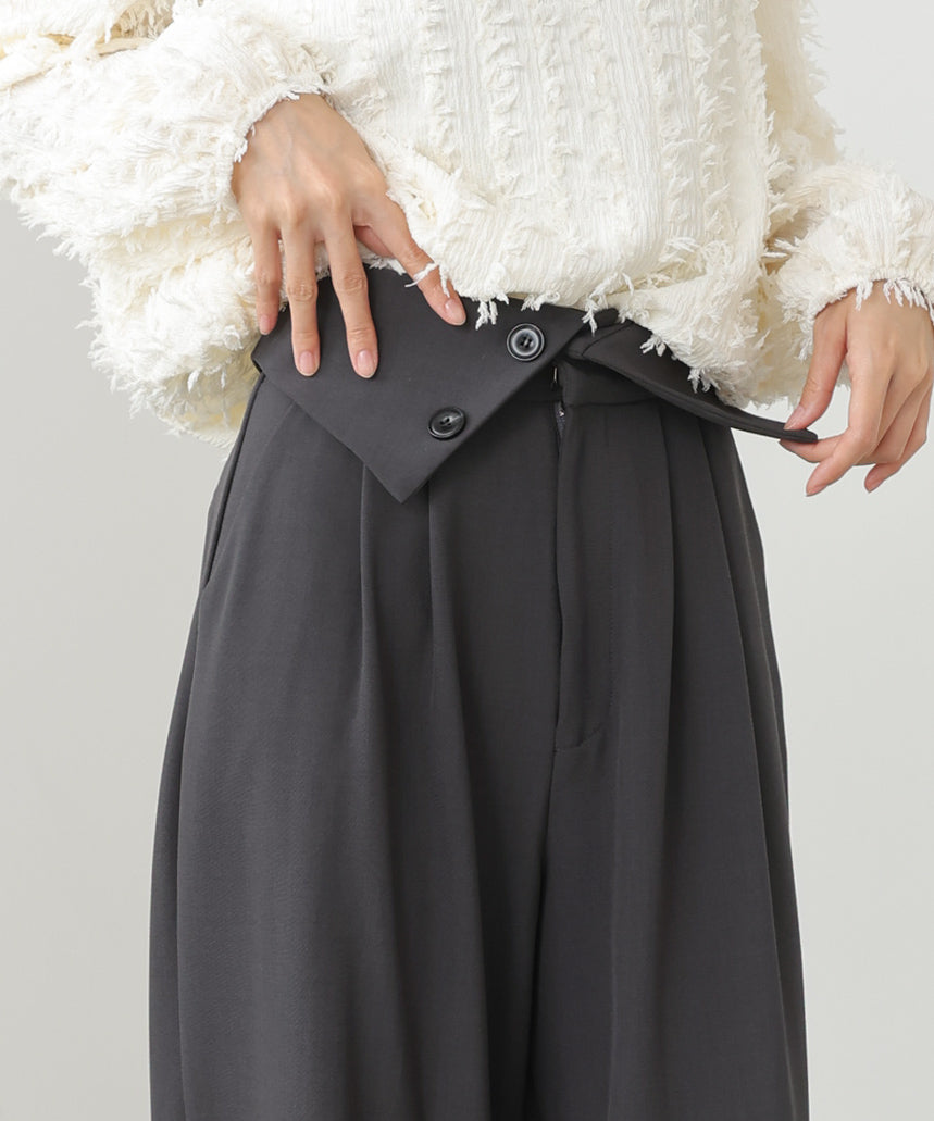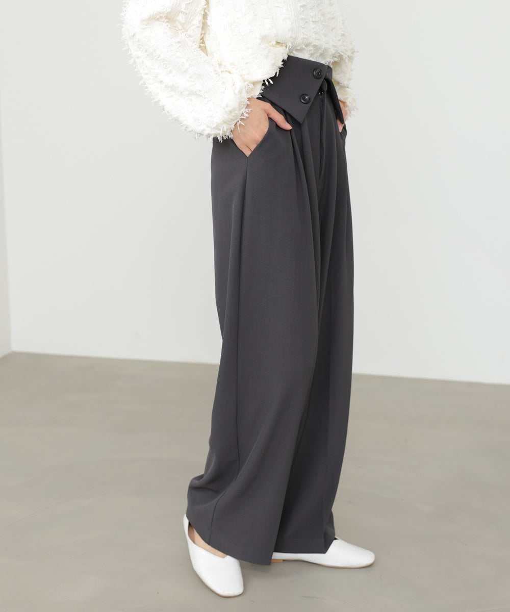 ウエストのフラップデザインとフロントの釦がポイントになった、ワイドタックパンツ。立体感のあるシルエットにセンタープレスが入り、脚をすっきりと長く見せてくれます。1枚でスタイルが決まる存在感がありながら、きちんと感も兼ね備えた優秀アイテム。通勤やお出かけにも活躍する、上品でモードな印象の一本です。