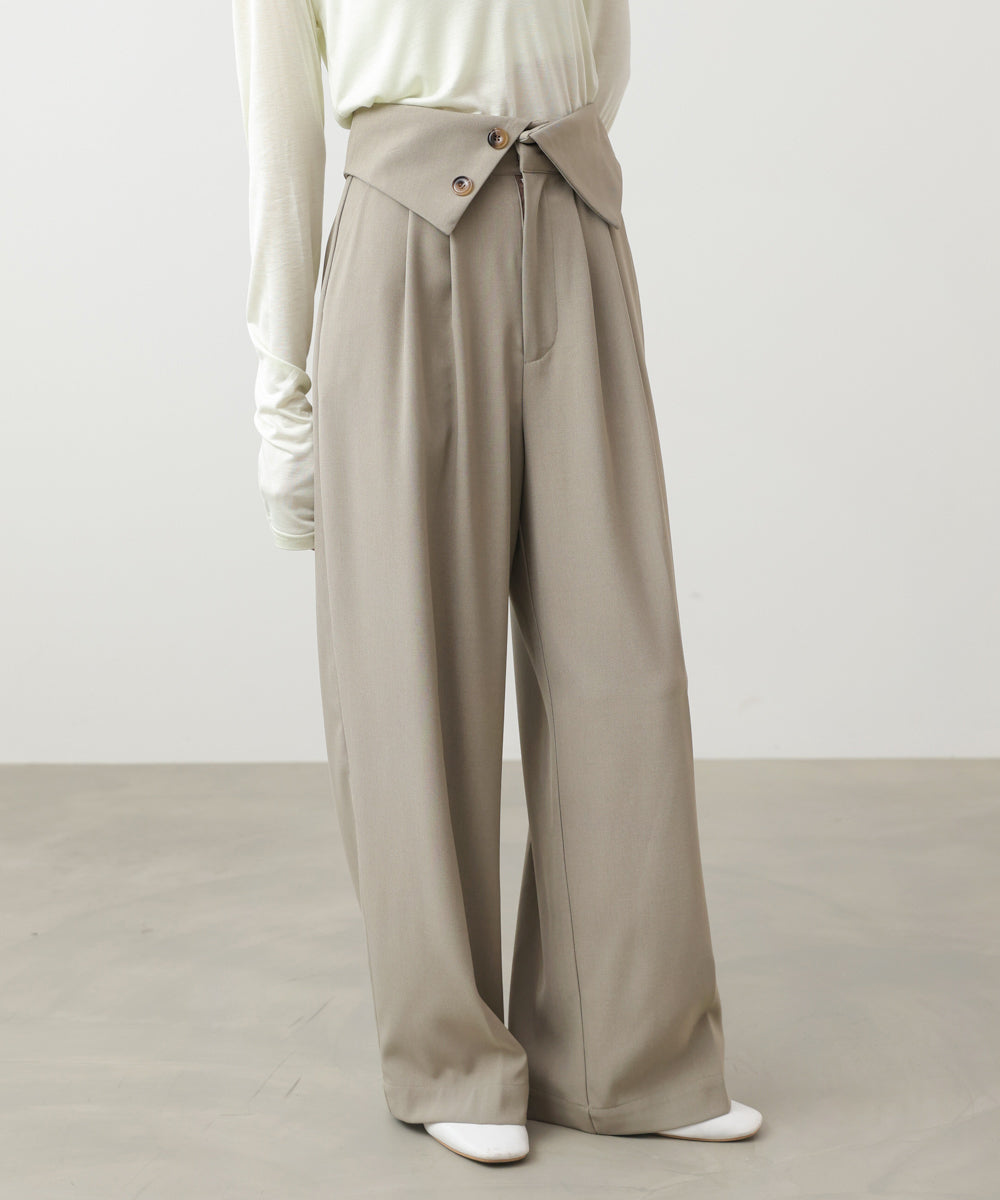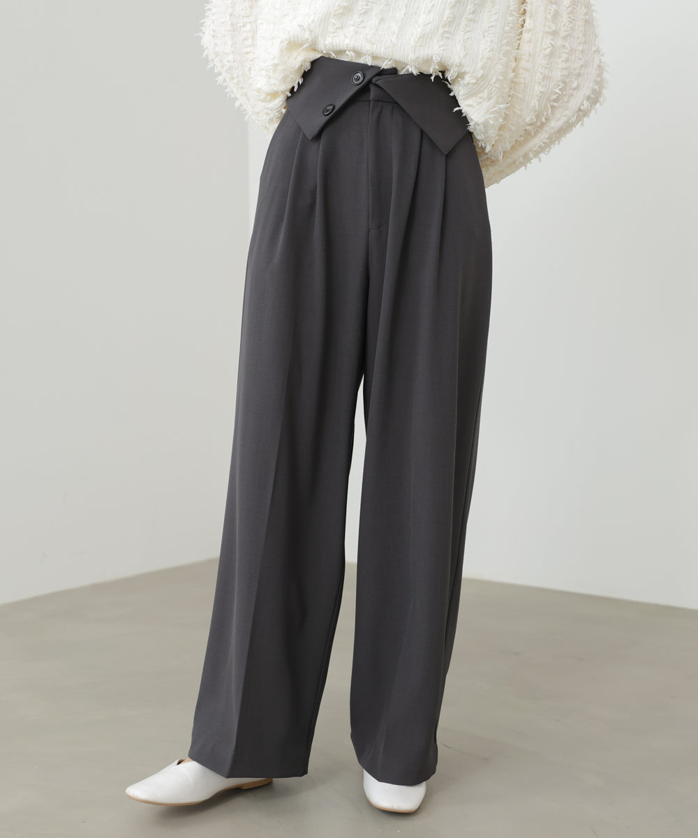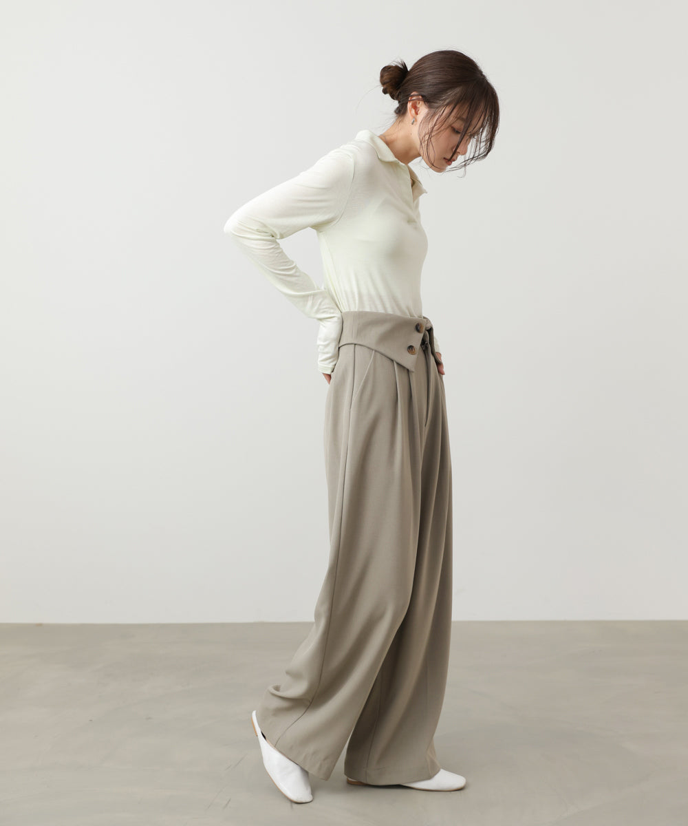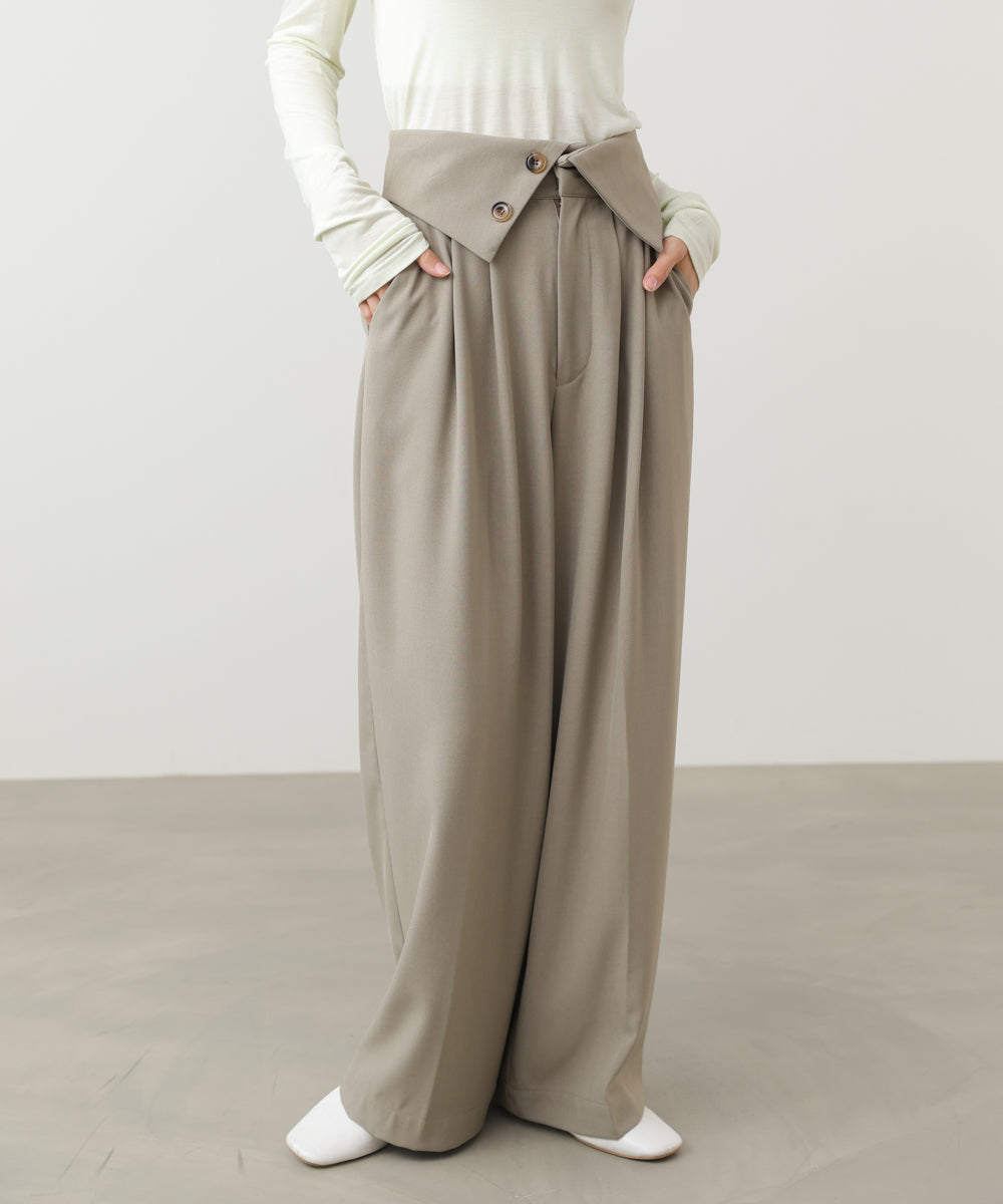 ウエストのフラップデザインとフロントの釦がポイントになった、ワイドタックパンツ。立体感のあるシルエットにセンタープレスが入り、脚をすっきりと長く見せてくれます。1枚でスタイルが決まる存在感がありながら、きちんと感も兼ね備えた優秀アイテム。通勤やお出かけにも活躍する、上品でモードな印象の一本です。