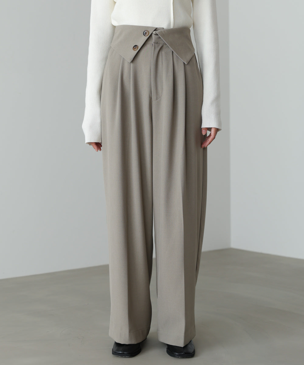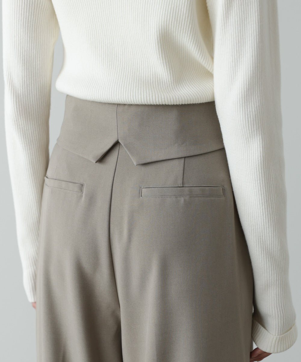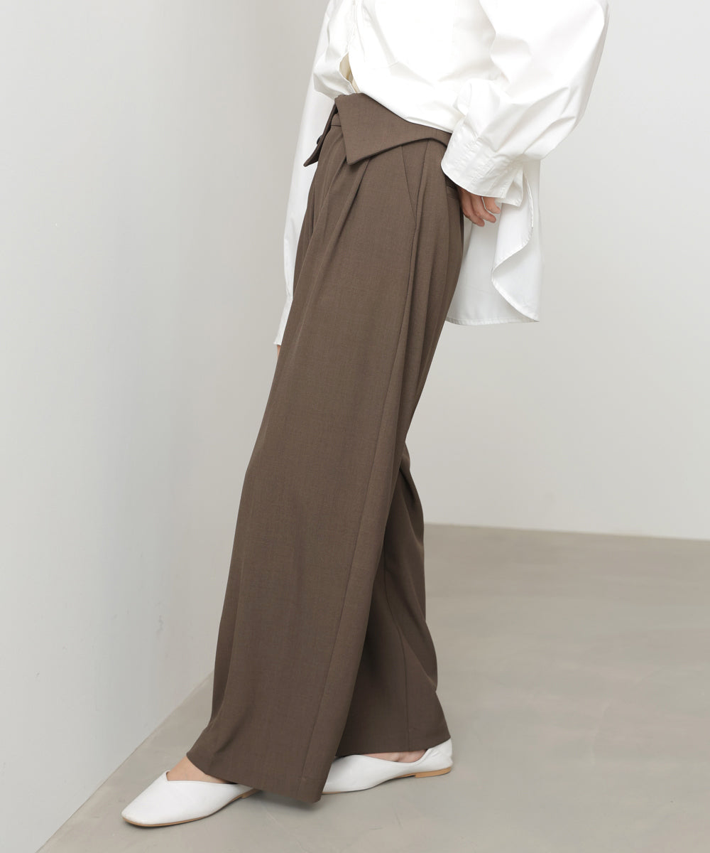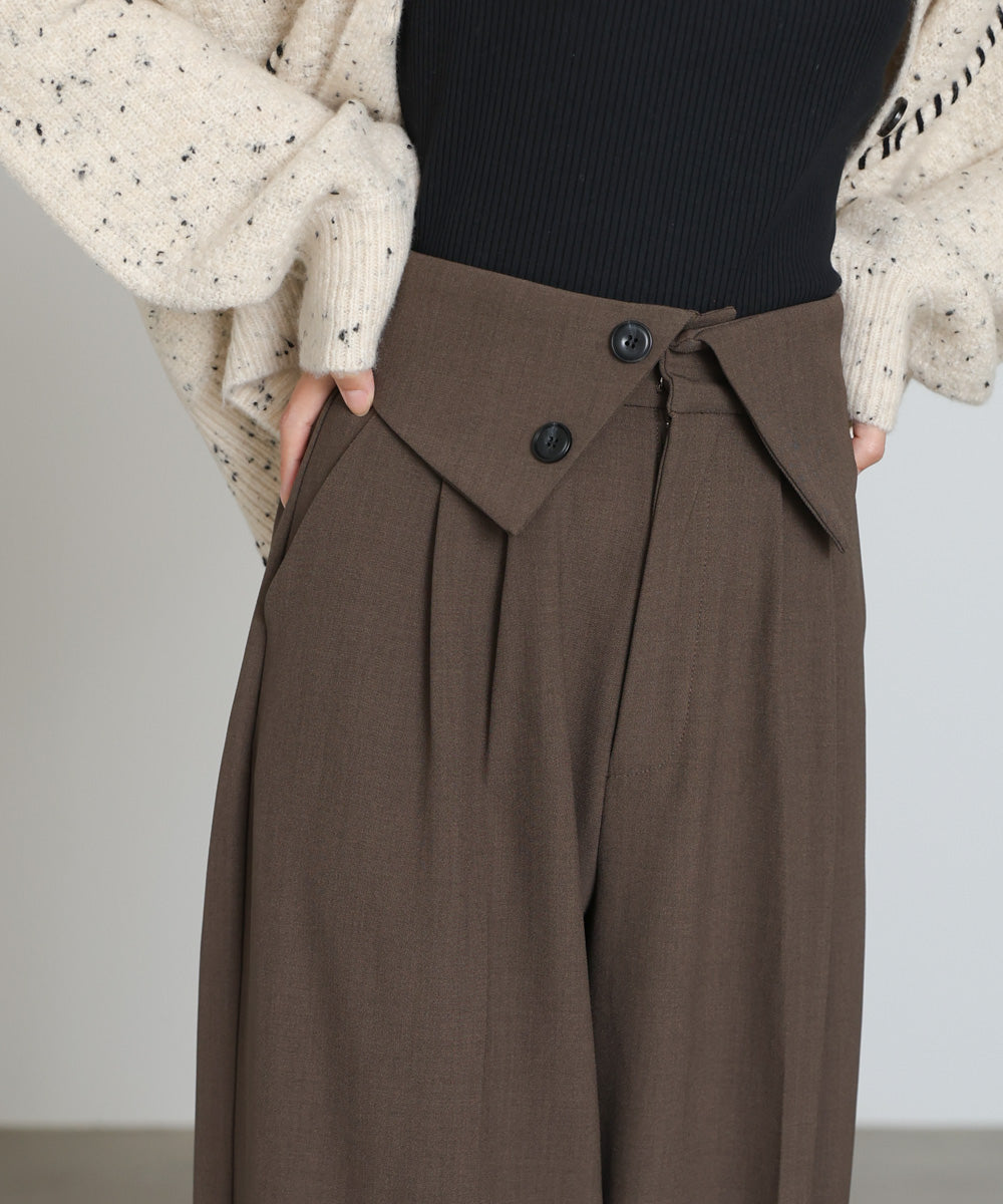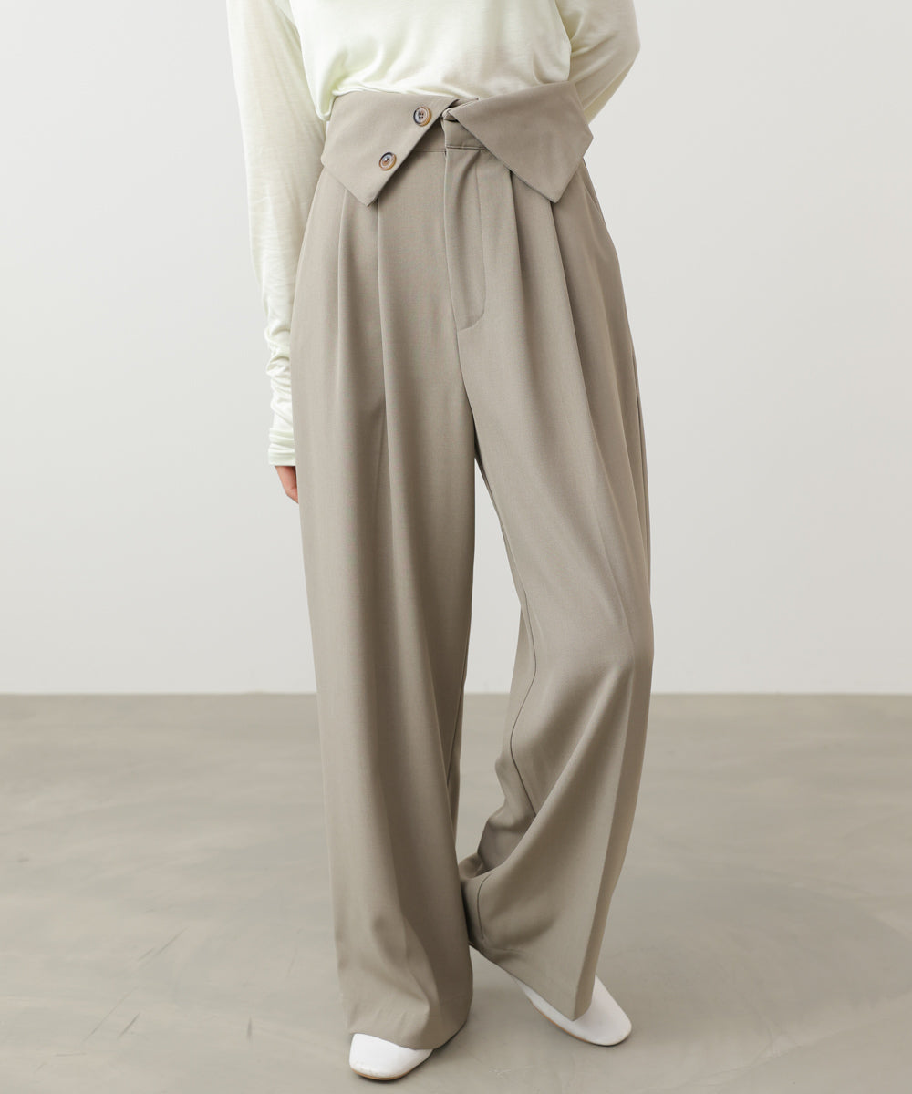 ウエストのフラップデザインとフロントの釦がポイントになった、ワイドタックパンツ。立体感のあるシルエットにセンタープレスが入り、脚をすっきりと長く見せてくれます。1枚でスタイルが決まる存在感がありながら、きちんと感も兼ね備えた優秀アイテム。通勤やお出かけにも活躍する、上品でモードな印象の一本です。