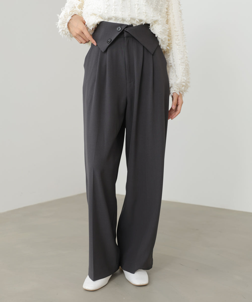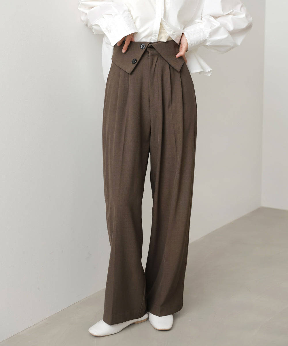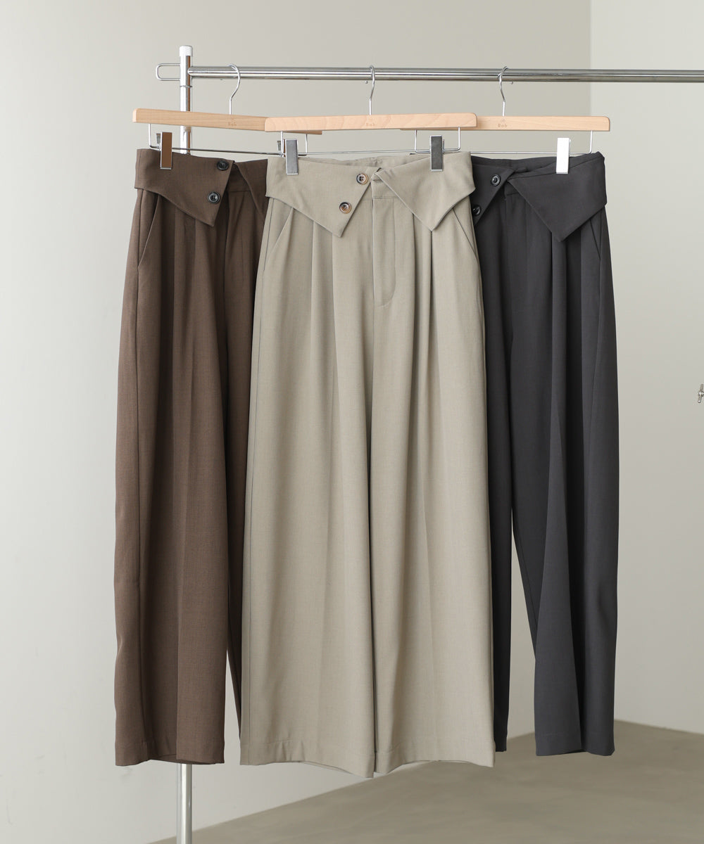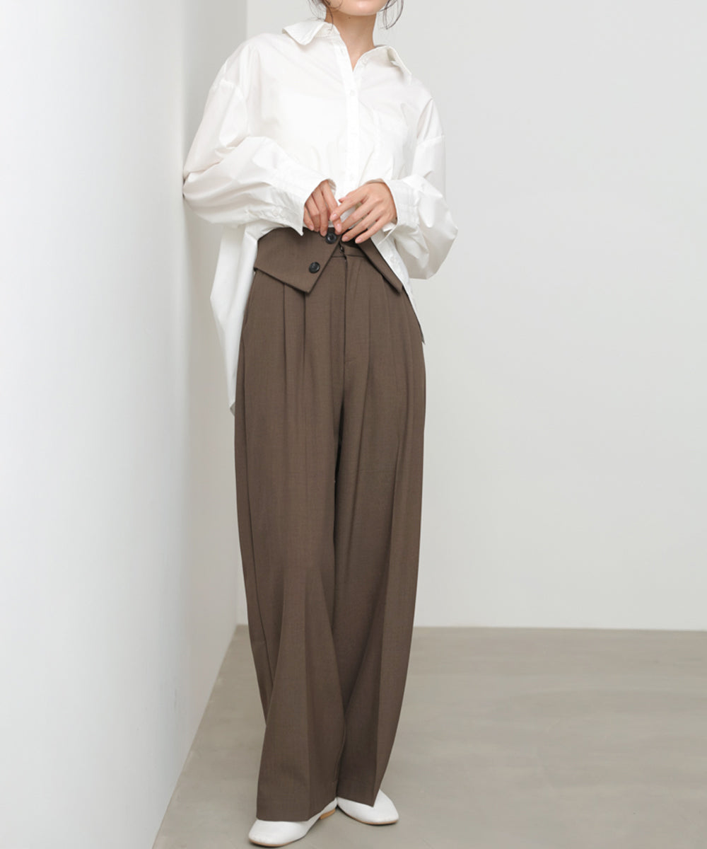 ウエストのフラップデザインとフロントの釦がポイントになった、ワイドタックパンツ。立体感のあるシルエットにセンタープレスが入り、脚をすっきりと長く見せてくれます。1枚でスタイルが決まる存在感がありながら、きちんと感も兼ね備えた優秀アイテム。通勤やお出かけにも活躍する、上品でモードな印象の一本です。