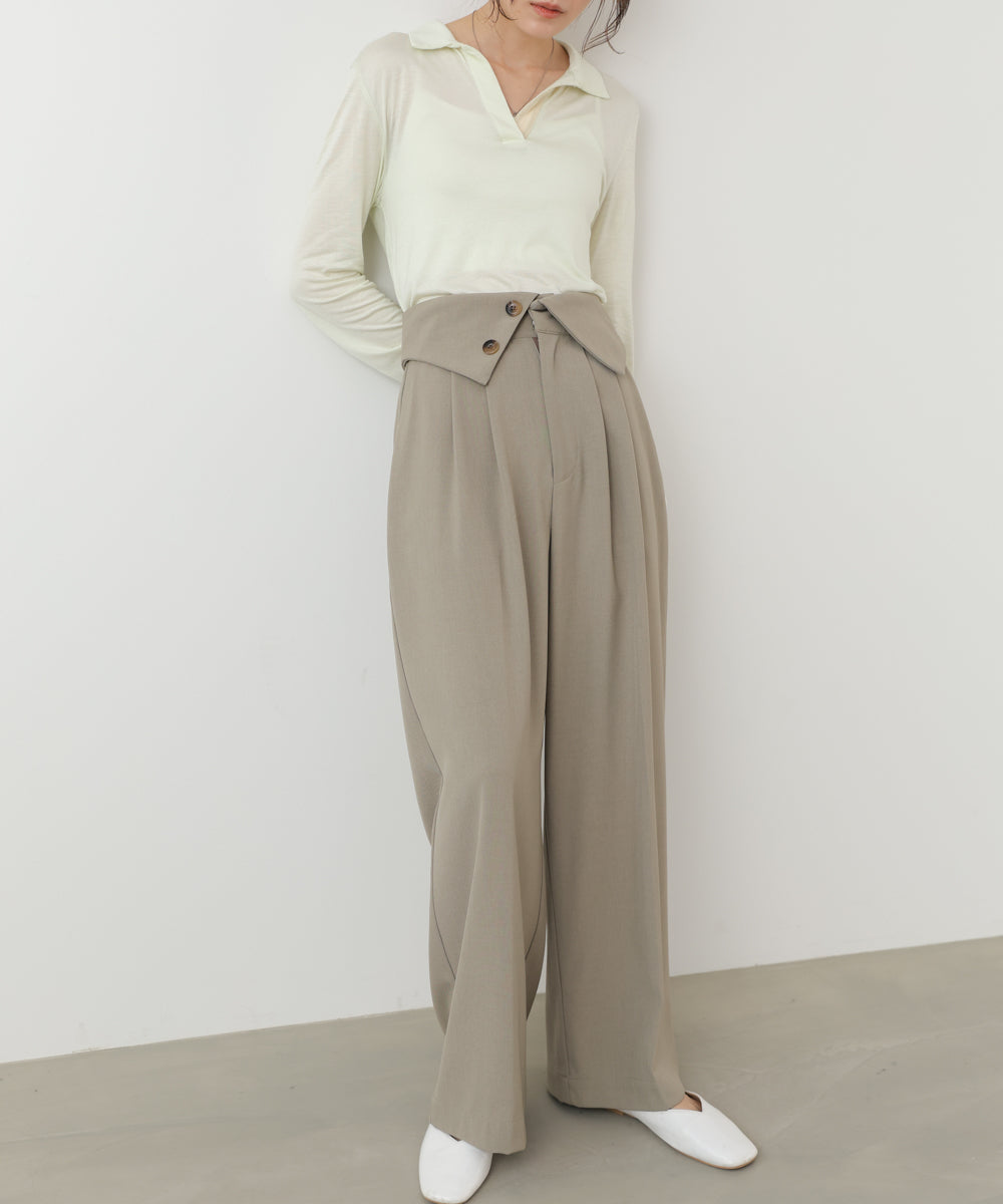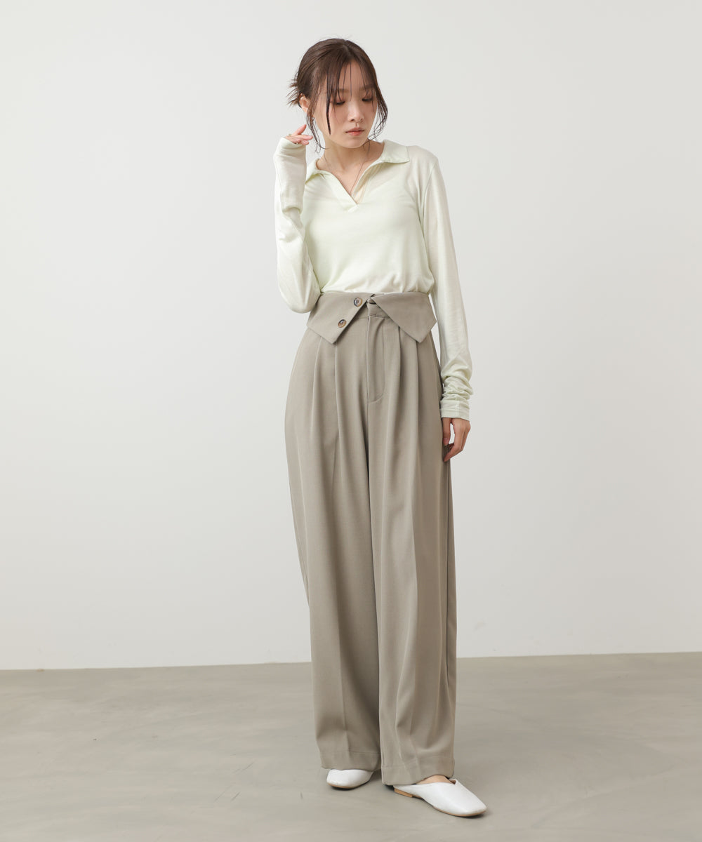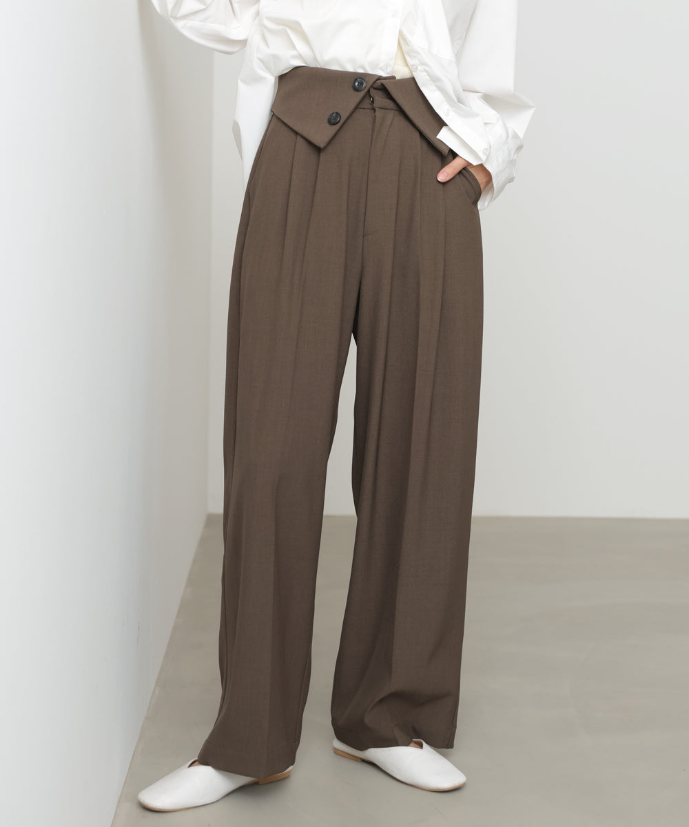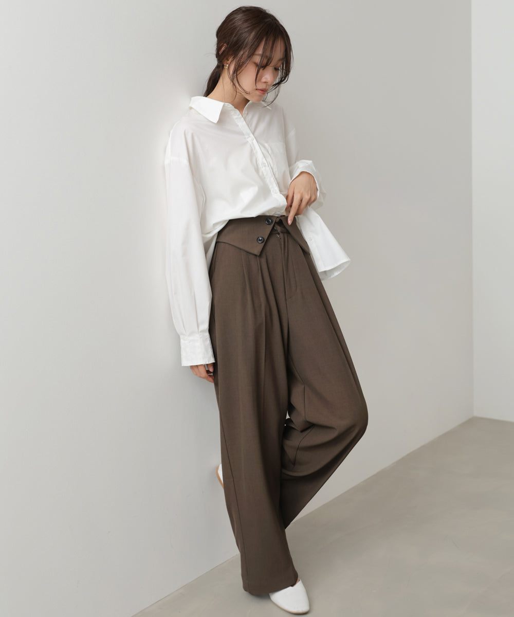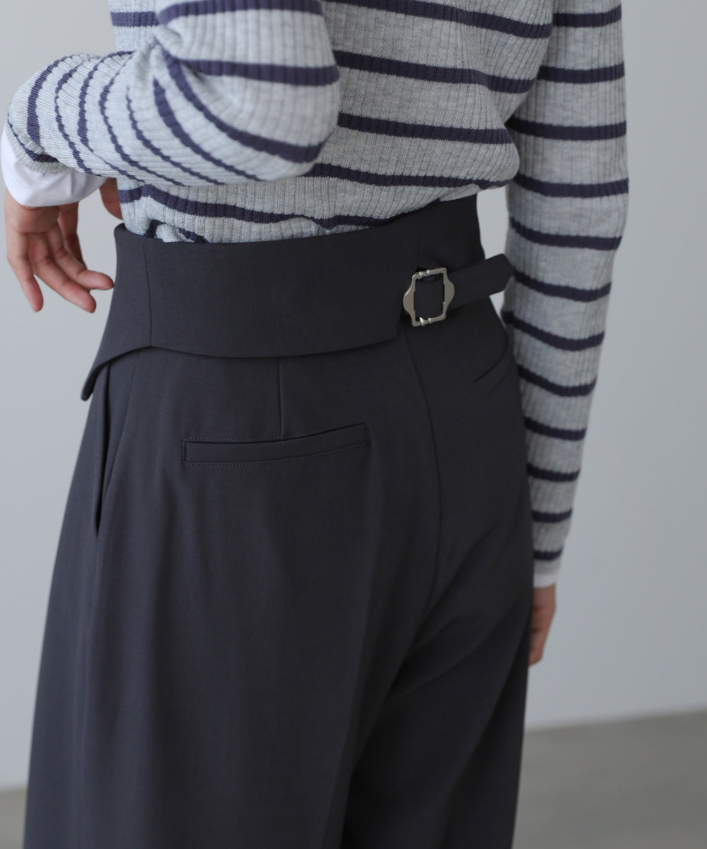 ウエストのフラップデザインとフロントの釦がポイントになった、ワイドタックパンツ。立体感のあるシルエットにセンタープレスが入り、脚をすっきりと長く見せてくれます。1枚でスタイルが決まる存在感がありながら、きちんと感も兼ね備えた優秀アイテム。通勤やお出かけにも活躍する、上品でモードな印象の一本です。