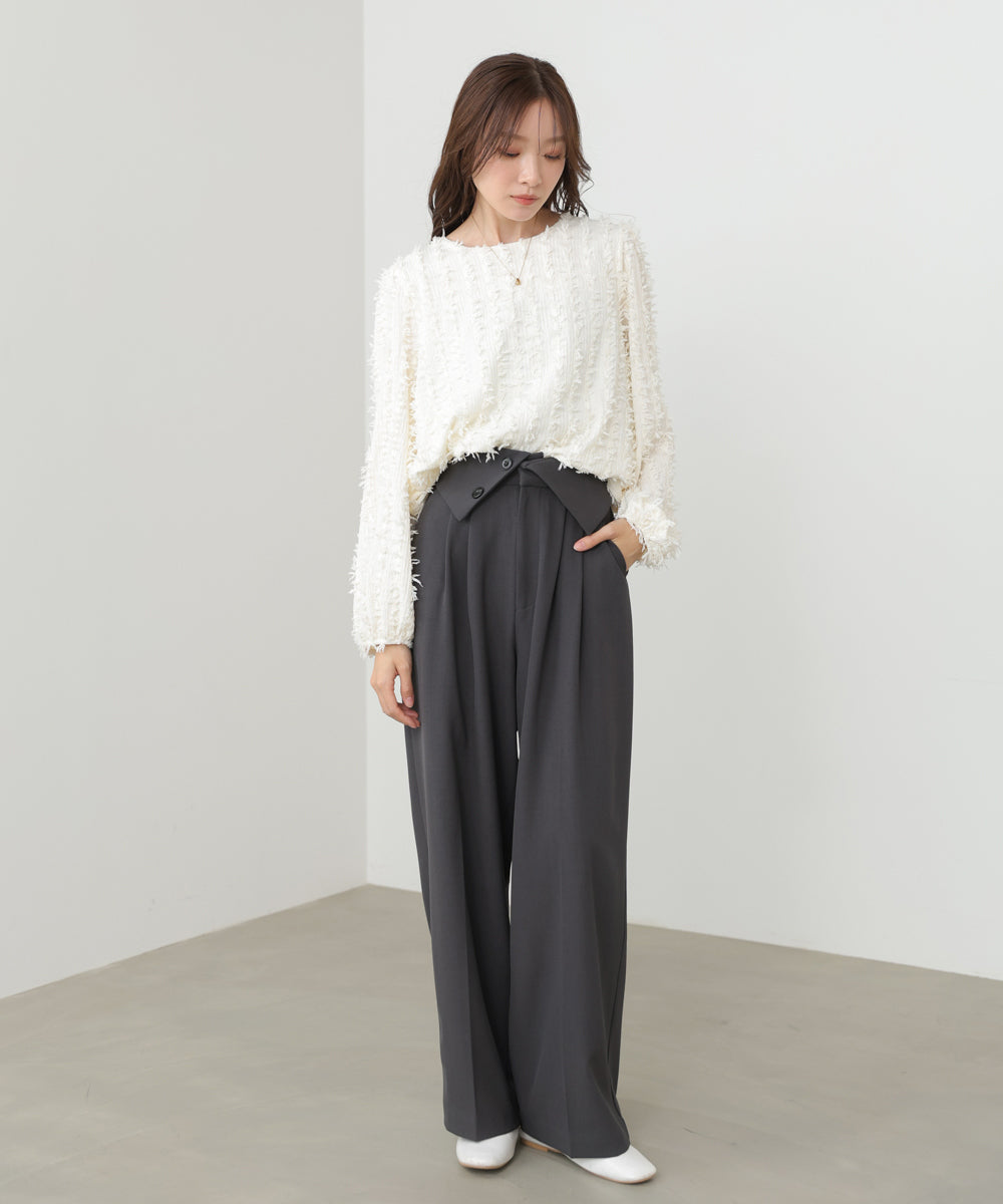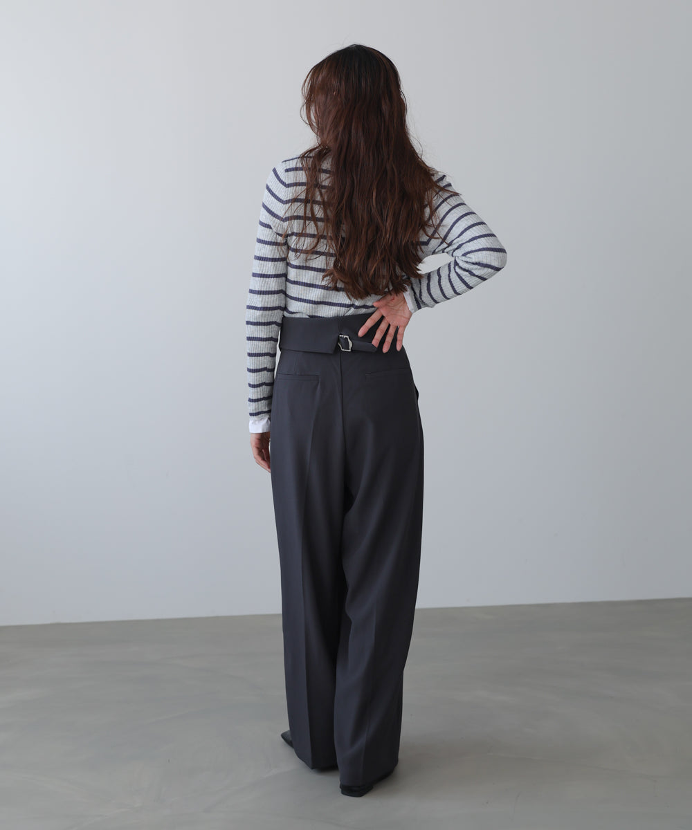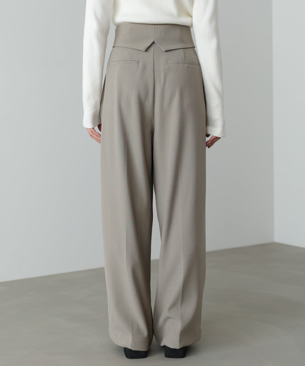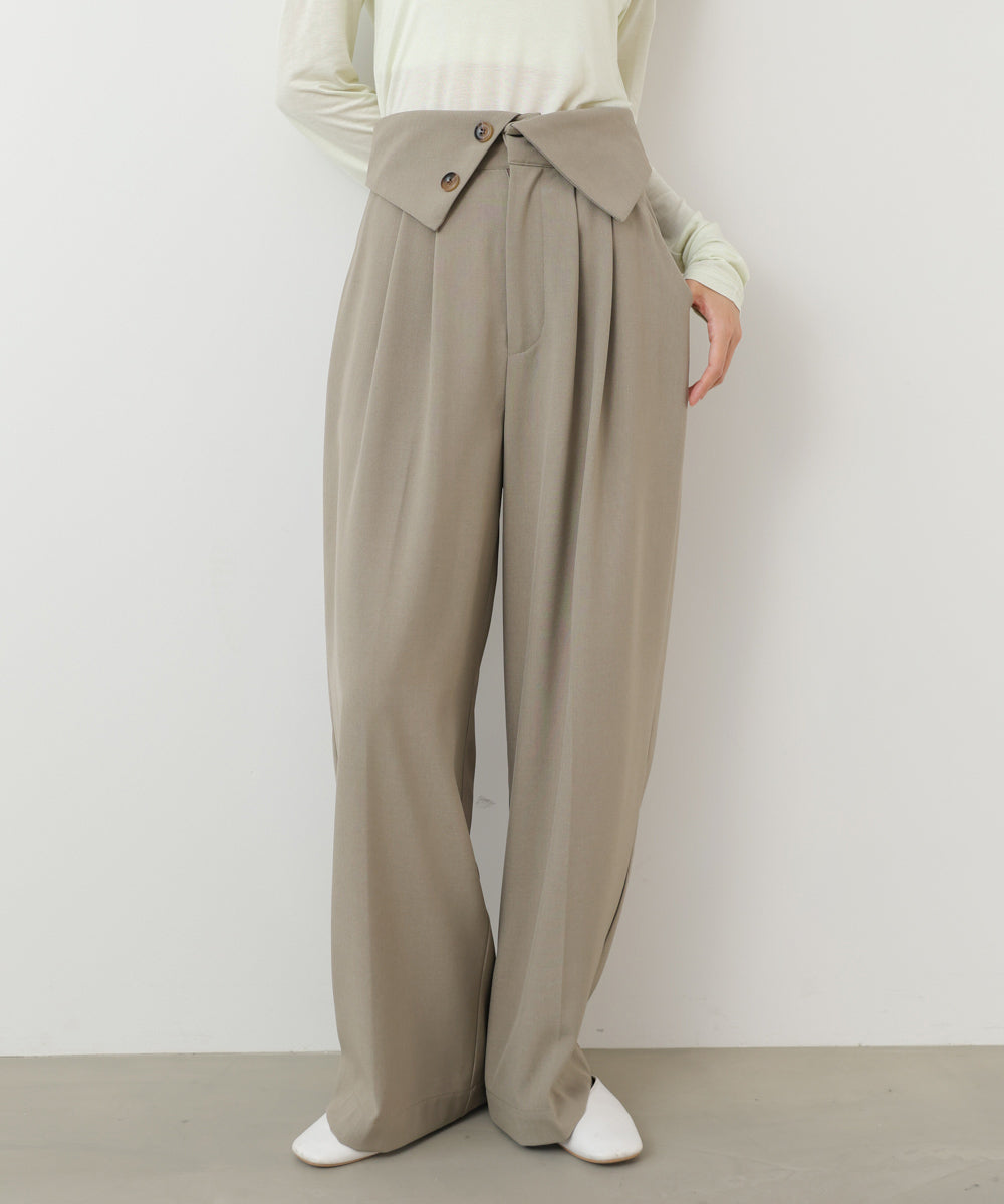 ウエストのフラップデザインとフロントの釦がポイントになった、ワイドタックパンツ。立体感のあるシルエットにセンタープレスが入り、脚をすっきりと長く見せてくれます。1枚でスタイルが決まる存在感がありながら、きちんと感も兼ね備えた優秀アイテム。通勤やお出かけにも活躍する、上品でモードな印象の一本です。