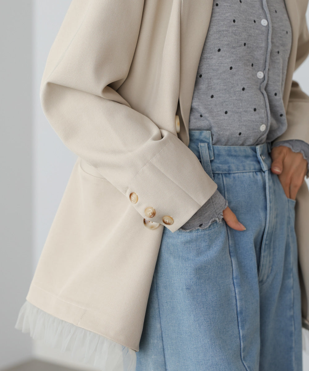 同素材のパンツと合わせて、甘さを効かせた大人のセットアップスタイルに。チュールを外してシンプルに着れば、通勤やきれいめシーンにも対応。デニムやスラックスと合わせて、ジャケットを主役にしたカジュアルMIXコーデもおすすめ。インナーはシンプルなカットソーやブラウスで、ジャケットのデザインを引き立てると◎
